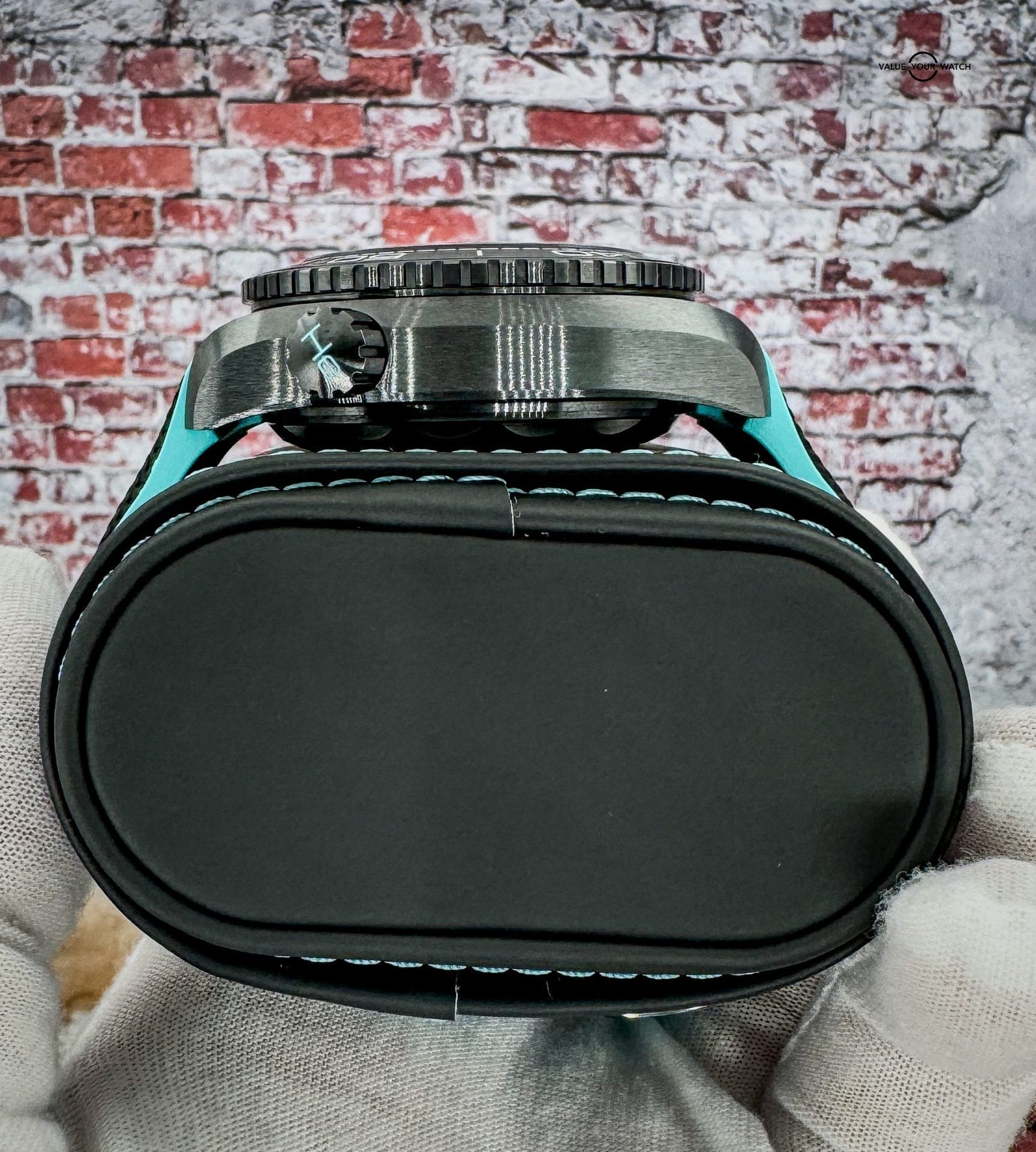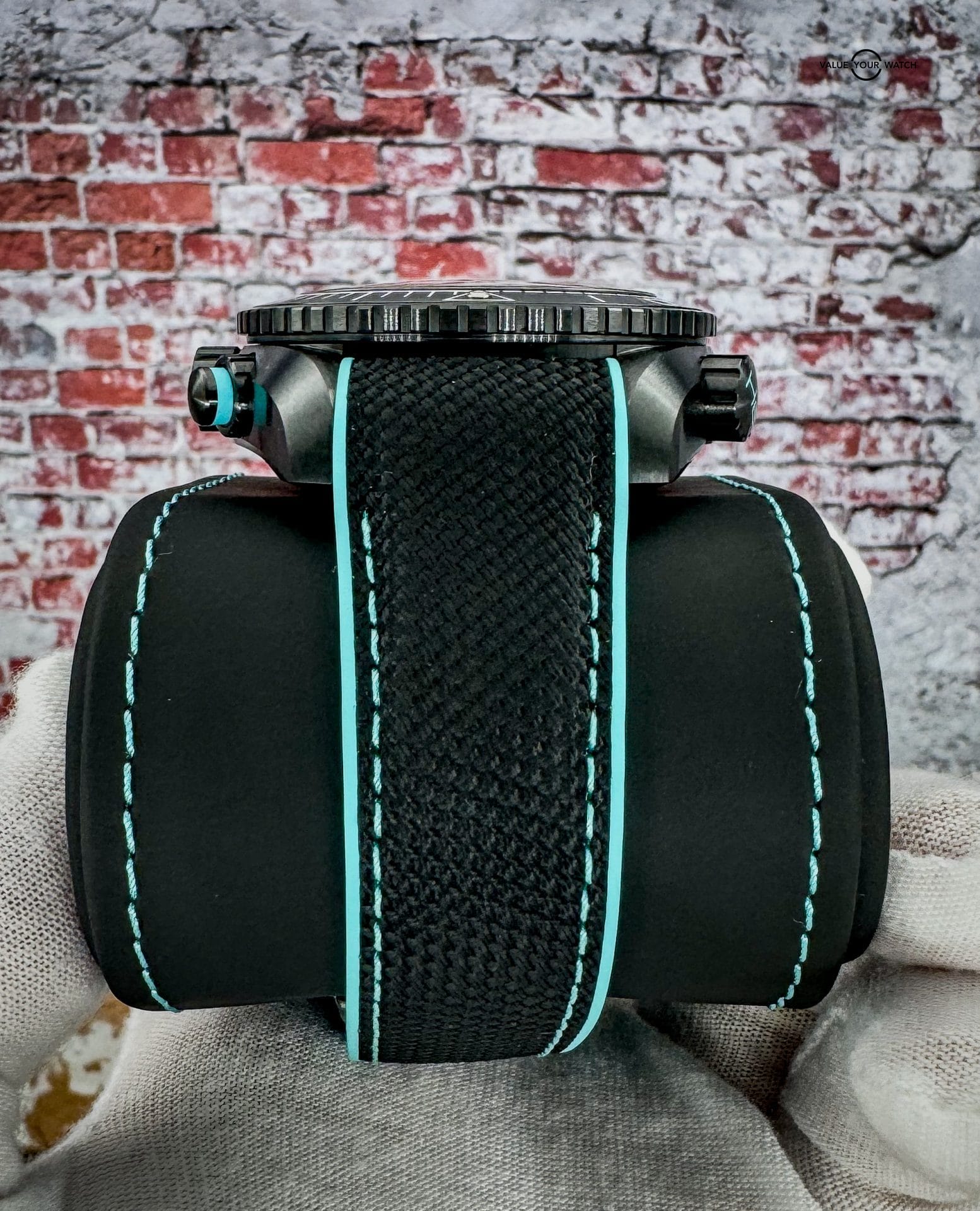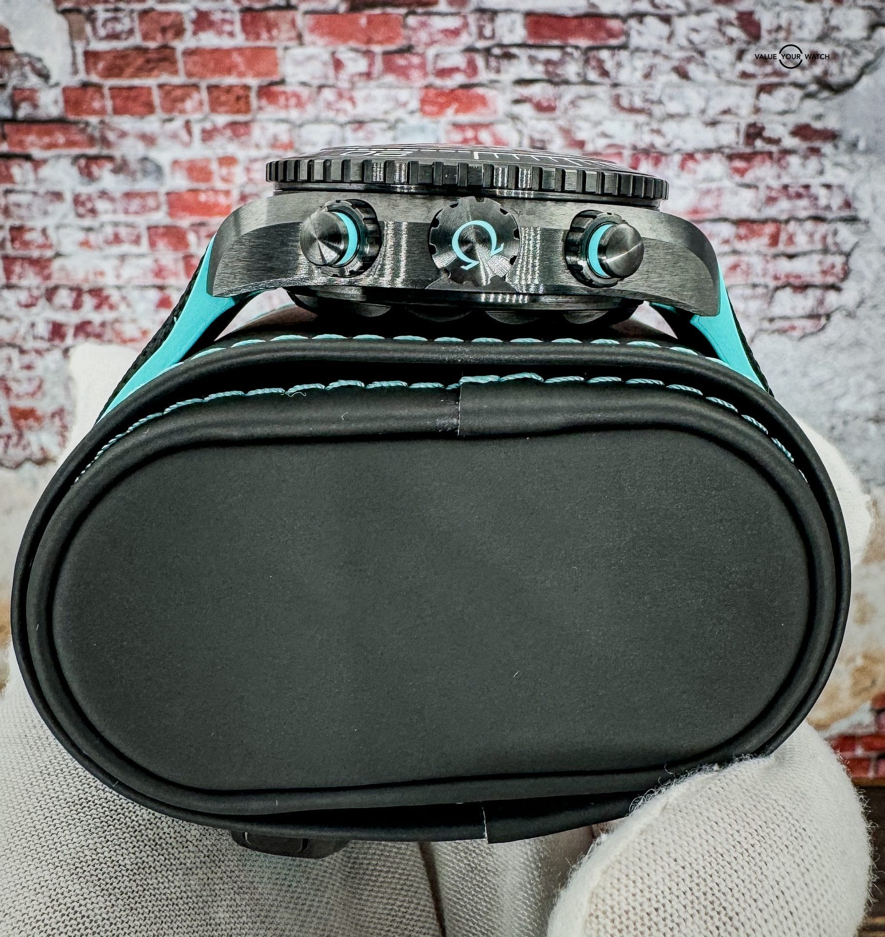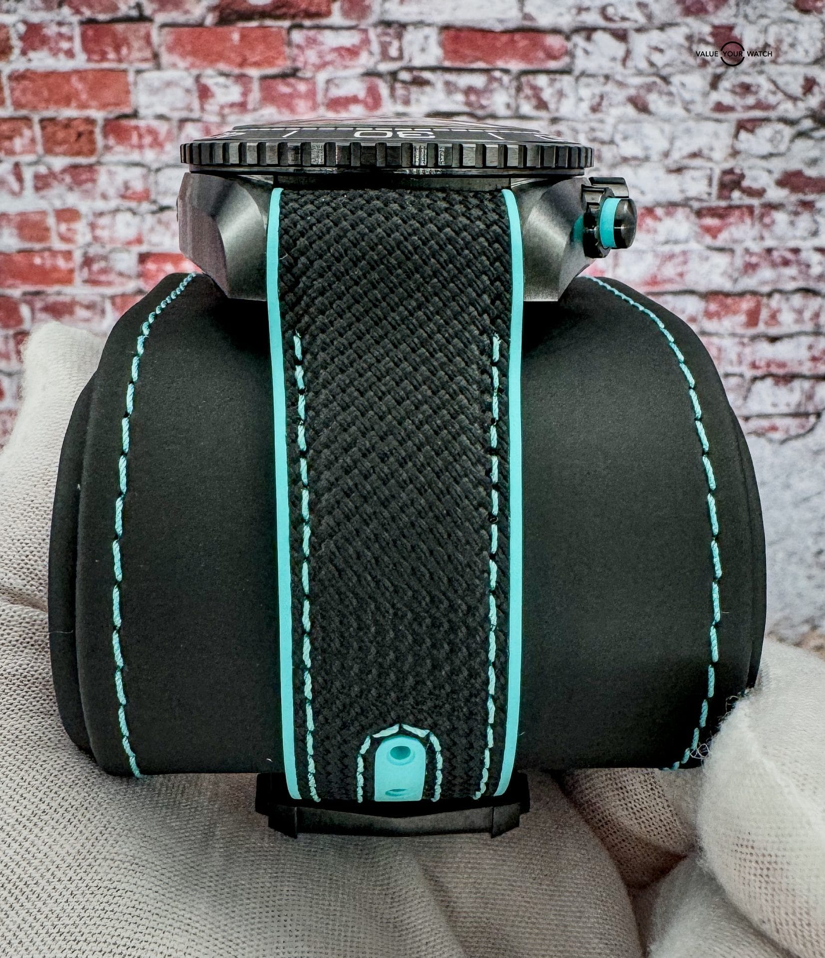 Offered by NoVA Watch Supply of Fairfax, VA: An excellent condition Omega Seamaster Planet Ocean 600M Black Ceramic ETNZ Deep Black edition watch REF. 215.92.46.51.01.003. Whether you’re a fan of the Kiwi Crew of ETNZ, or simply obsessed with Tiffany colorway watches, this variation of the planet ocean is proving to be one of most sought after special edition Omegas in some time and is now SOLD OUT at Omega. The story behind this 45.5 mm work of art is that its a tribute piece to the defenders of the 37th America’s Cup blending the deepest black with the turquoise of the Emirates Team New Zealand logo. Complementing the black ceramic case is a unidirectional bezel in brushed black ceramic with white enamel diving scale and triangle-framed dot at 12, which includes white Super-LumiNova to emit a green glow in the dark. On the matt ceramic dial, OMEGA has included a nod to pre-race protocol with a COUNTDOWN INDICATOR at 3 o’clock complete with flagged START. The indicator’s hand and subdial ring are in ETNZ logo turquoise, along with the minute track, number 12 and central seconds chronograph hand with America’s Cup trophy counterwatch_case_weight. OMEGA has also included the colour on the rings of the brushed black ceramic pushers, the HE on the helium escape valve and the OMEGA logo on the crown. As a salute to the kiwi crew, the NAIAD LOCK caseback has an Emirates Team New Zealand logo with turquoise fern and white lettering. A black and turquoise structured rubber strap with turquoise stitching and black ceramic clasp fixes the race-ready watch to the wrist, while OMEGA’s Master Chronometer Calibre 9900 provides the power. In addition to all of this, the tribute to the kiwi crew incudes a special presentation box in Emirates Team New Zealand colours as well as the following: