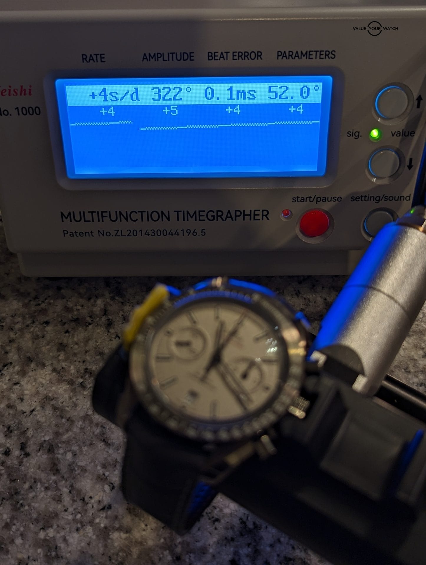 Overall, this piece is pristine, little to no signs of wear. The watch, the strap, the box, everything, is in immaculate condition (watch pillow has a little flaking on backside edge). Aside from looking good, this piece is running phenomenally with an amplitude of 322 which is exceptionally healthy (see timegrapher photo).