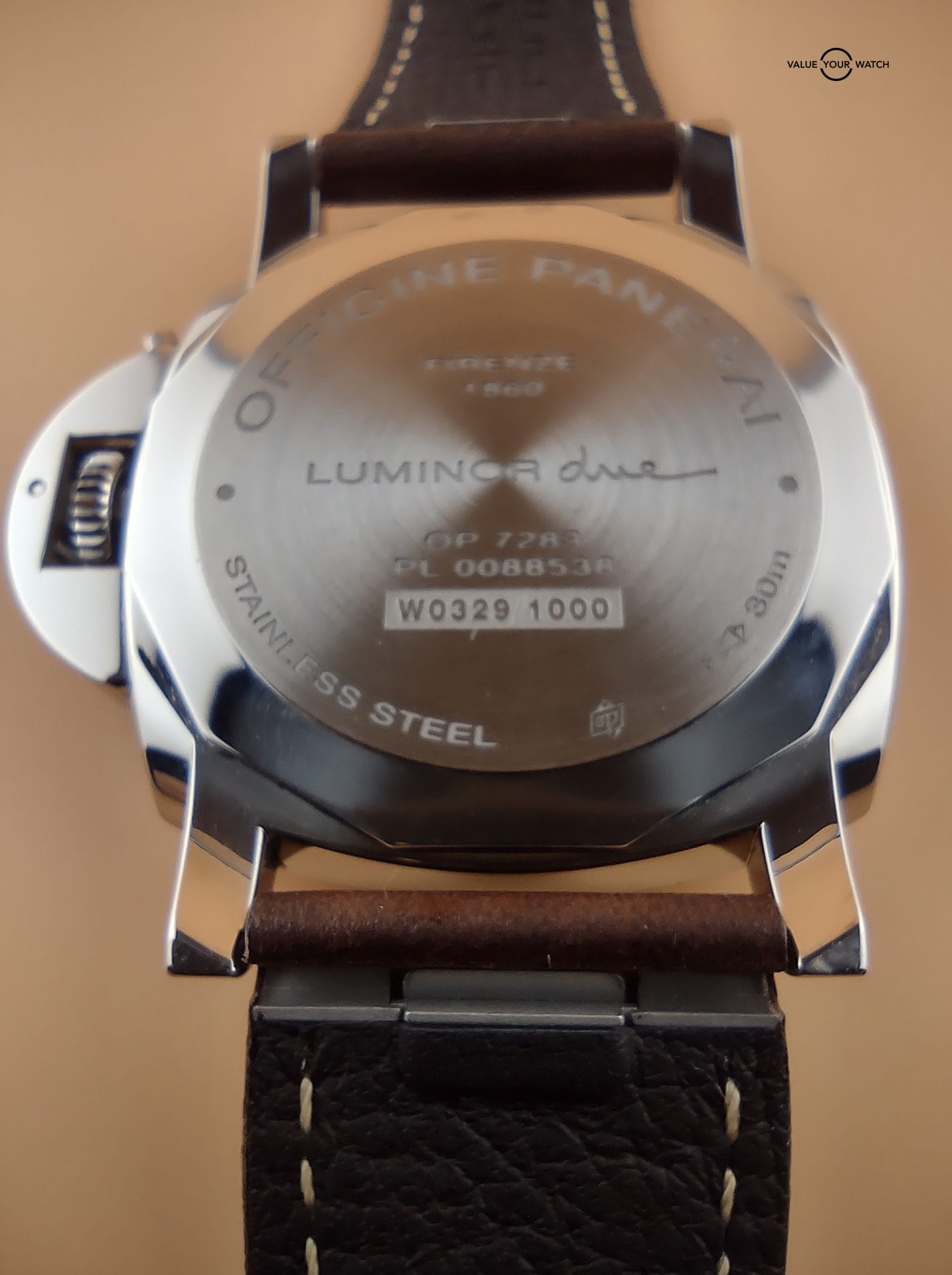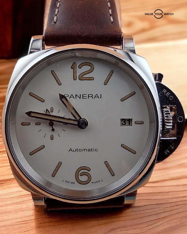 The 2020 Pam Luminor Due (PAM01046) features a 42mm steel case and a smooth matching bezel. Its white dial adorned with Arabic numerals radiates elegance and sophistication. The dial includes a date aperture at 3 o’clock and a sub-dial at 9 o’clock. Completed with a comfortable leather strap, this timepiece is both stylish and functional. $4950 and add this unique piece to your collection! Freely message me for additional details👍
