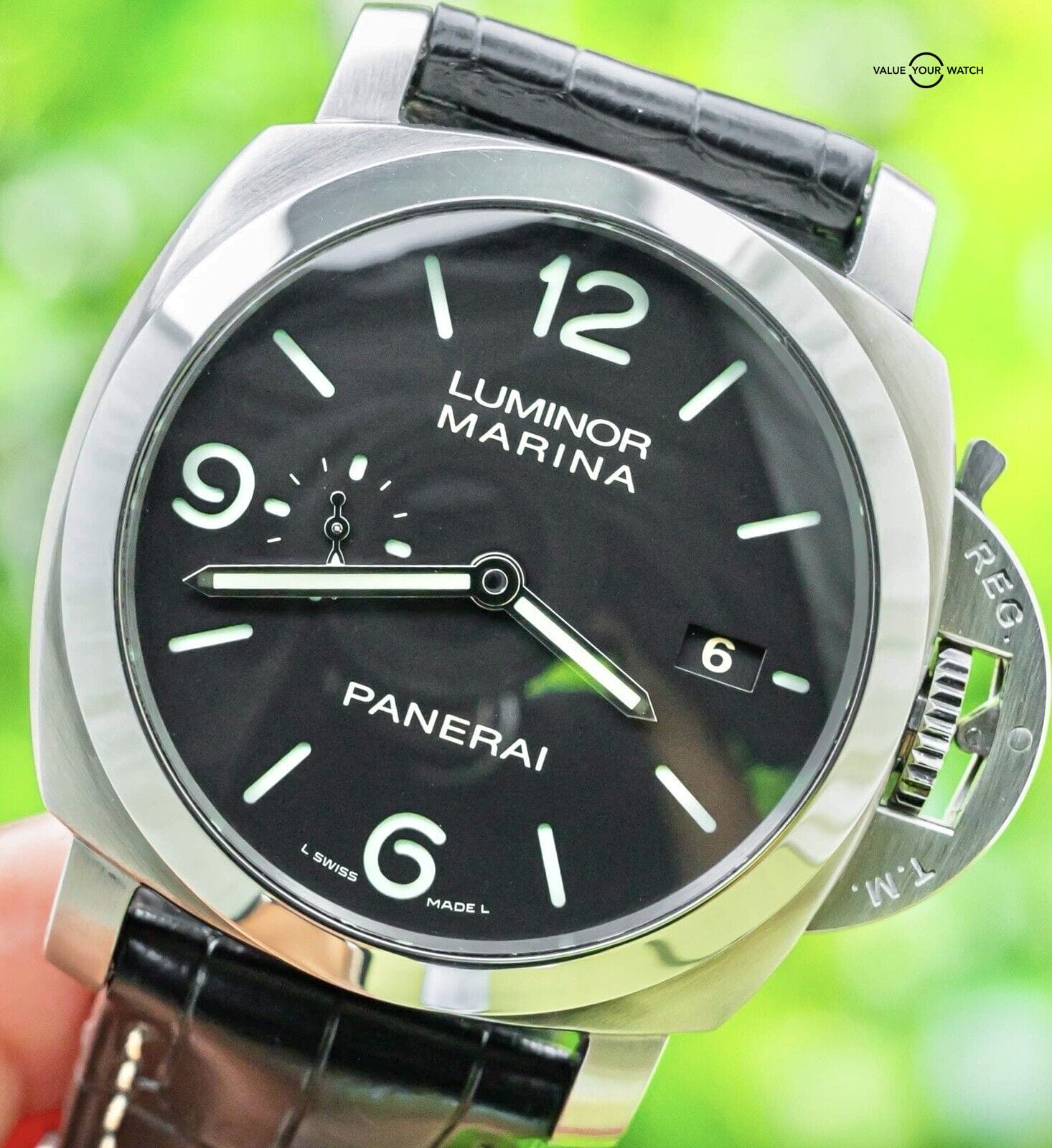 STUNNING Panerai 312 Luminor Marina with Black Dial on Black Panerai Alligator Strap & Aftermarket Tang Clasp! Arrives as a with the original triple boxes and papers including the serialized tan outer cardboard box, certificates booklet, instructions booklet, bezel cover, and strap tools. An iconic model at a killer price point, the 312 has the 3 Day Power Reserve and 1950 style case! The watch was FULLY SERVICED at my watchmaker in April 2024, a nice value-add. It is in great condition overall with only minor wear as pictured, nothing notable in my opinion. Do excuse the dust as we take all pictures outside in natural lighting/conditions. This is a clean watch with iconic Panerai styling that should be in any collection!Do not hesitate to contact me with any questions. I sell over 600 watches per year, have fantastic reviews online, and hundreds of references; I seek a very simple and pleasant buying experience for my clients through fostering relationships in the watch community. The serials have been blurred for privacy.Panerai 312Reference Number: PAM00312Bezel: Fixed Polished Stainless SteelBand: Panerai Alligator StrapCase: Brushed Stainless SteelCase Diameter: 44.00 mmClasp: Aftermarket Stainless Steel TangCrown: Brushed Stainless Steel Crystal: SapphireDial Color: Black with Stick MarkersFunctions: Hours, DateLuminescent Hands & Markers Movement: P.9000 Calibre AutomaticPower Reserve: 72 HoursVibrations Per Hour: 28,800 VPHWater Resistance: 300M / 1000FT