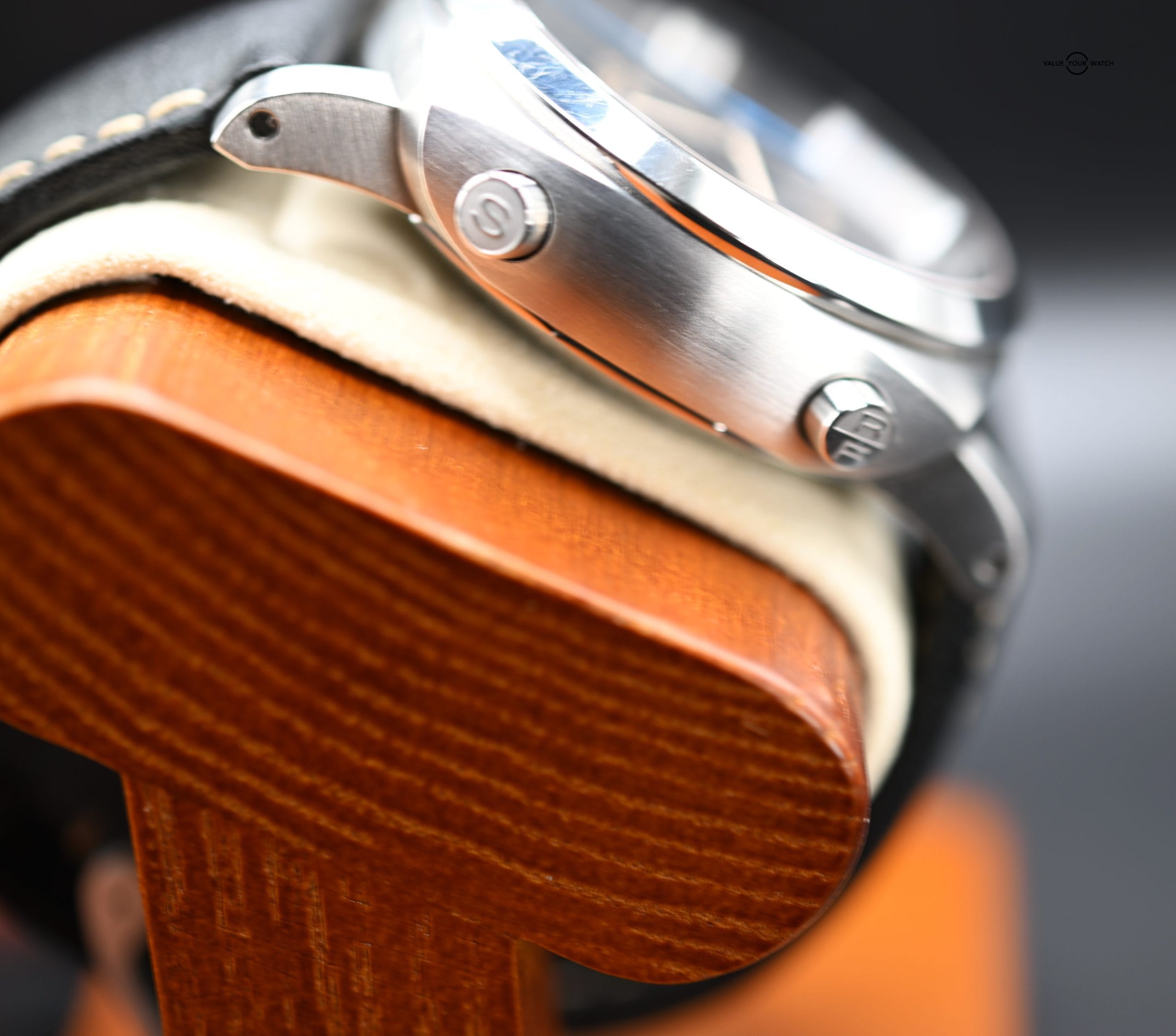 With its robust steel case, iconic Panerai crown, smooth steel bezel, and a captivating black dial adorned with Arabic Numerals, a subdial at 9 o’clock, and a date window at 3 o’clock, this watch stands as a testament to Panerai’s design prowess. The blue chrono seconds hand adds a touch of sophistication, and with a water resistance of up to 100 meters, it’s a reliable companion for various occasions.