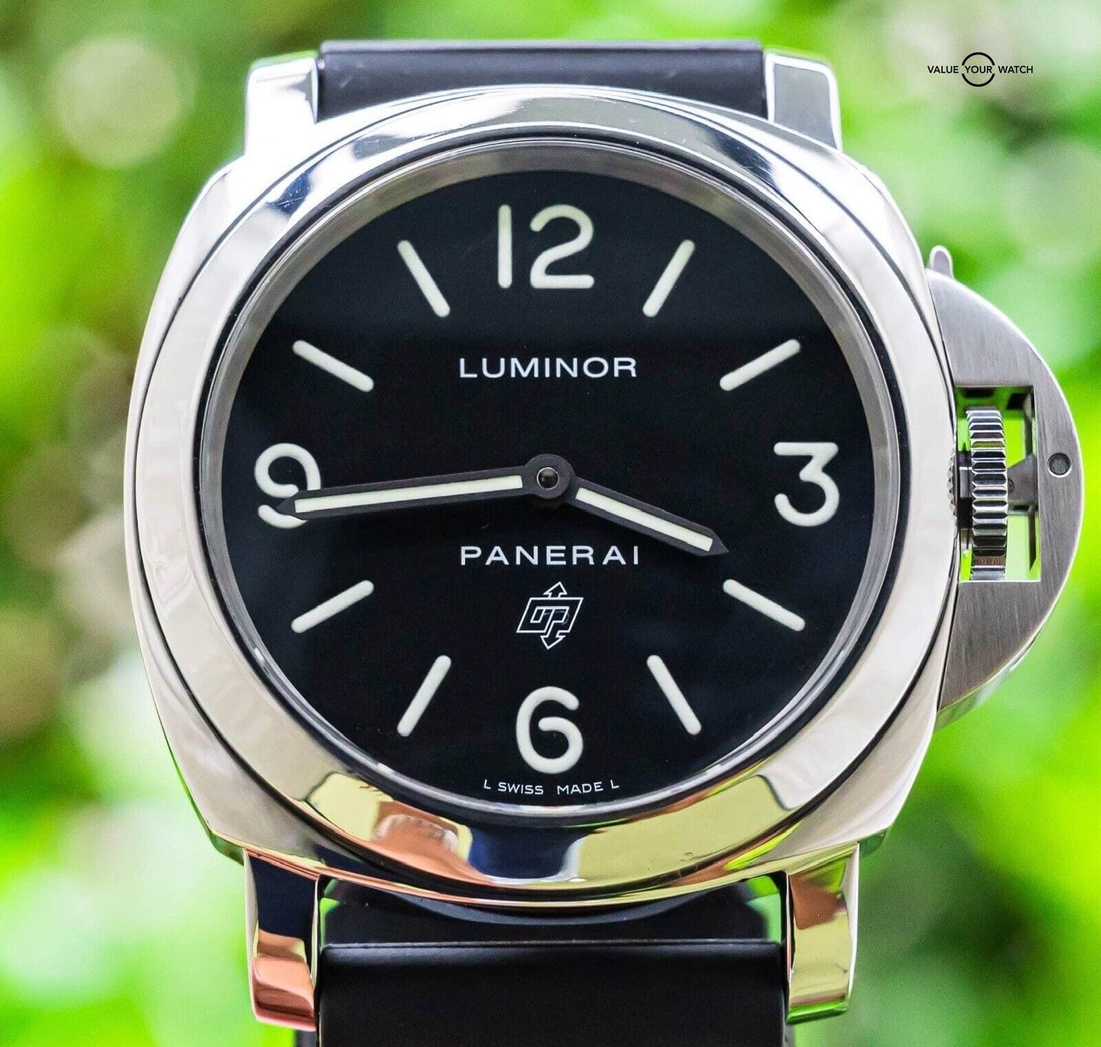 STUNNING Panerai 00000 Luminor Base Logo with Black Dial on OEM Black Panerai Rubber & Tang Clasp! Arrives as watch only and has recently been inspected by my watchmaker. This is at a solid price point for a Luminor Base Logo. Ready to be on wrist!The watch is in good condition with minor wear as pictured, nothing otherwise notable. Keeping good time on my timegrapher when tested! Do excuse dust/lint in the pictures as all of our watches are photographed outdoors in natural lighting/conditions. A classic Luminor is needed in any watch collection, such a clean look! Do not hesitate to contact me with any questions. I sell over 600 watches per year, have fantastic reviews online, and thousnads of references; I seek a very simple and pleasant buying experience for my clients through fostering relationships in the watch community. The serials have been blurred for privacy. Panerai PAM00000 Luminor Base LogoReference Number: PAM00000Band: Black Panerai RubberBezel: Fixed Polished Stainless Steel Case Diameter: 44 mmCase Material: Polished Stainless SteelCase Thickness: 14.5 mmClasp: Polished Stainless Steel TangCrown: Stainless Steel Protected by LeverCrystal: SapphireDial Color: BlackFunctions: Hours, Minutes, SecondsJewels: 17Luminescent Hands & Markers Movement: Panerai Calibre OP IPower Reserve: 56 HoursVibrations: 21,600 vphWater Resistance: 300M / 1000FT