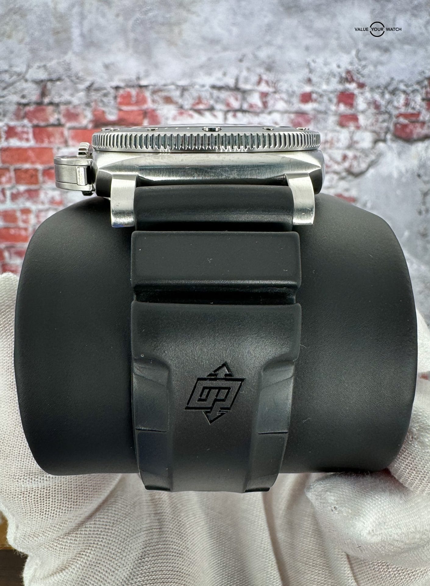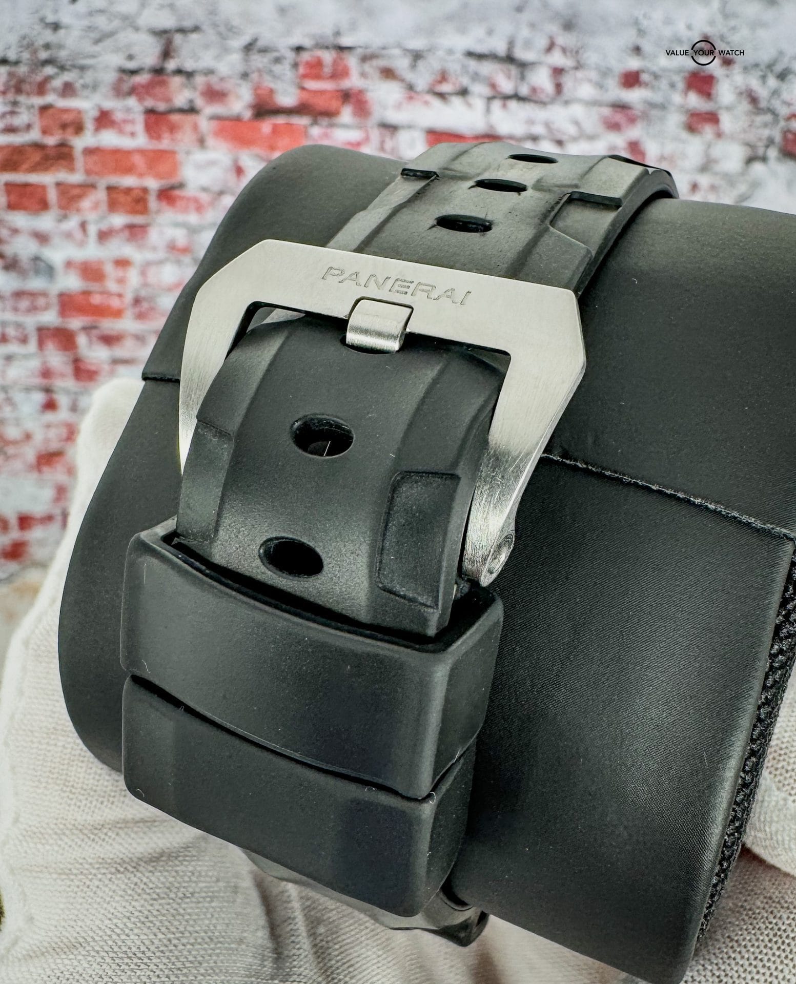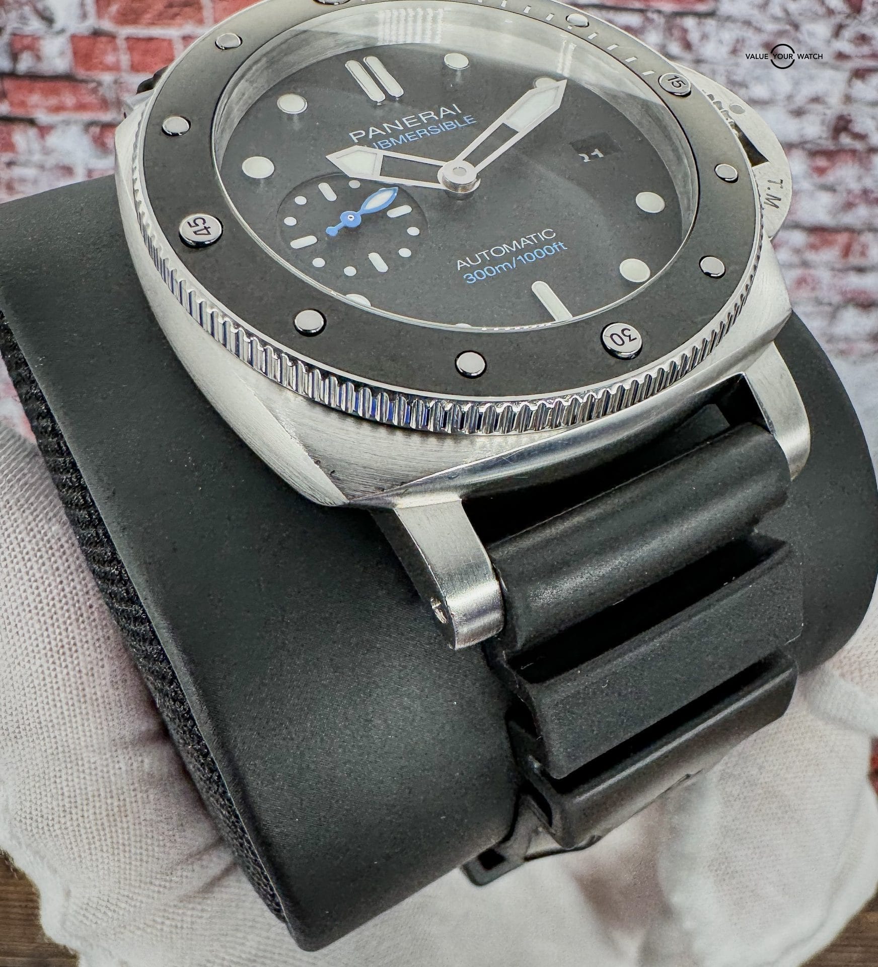 Offered by NoVA Watch Supply of Fairfax, VA: A good condition Panerai Submersible ref # PAM00683. Circa 2021. The iconic Submersible design is only second to Panerai’s stand out crown guard and this timeless piece carries both aesthetic elements. The black dial and matching black rubber strap make this a great daily piece whether you’re spending the day starboard or in the boardroom and with Panerai’s quick strap change system you can easily spice things up with a blue or white strap to complement the white indices or bright blue elements of the dial making this an incredibly versatile piece on all fronts. In addition to all that, this piece comes with the following: