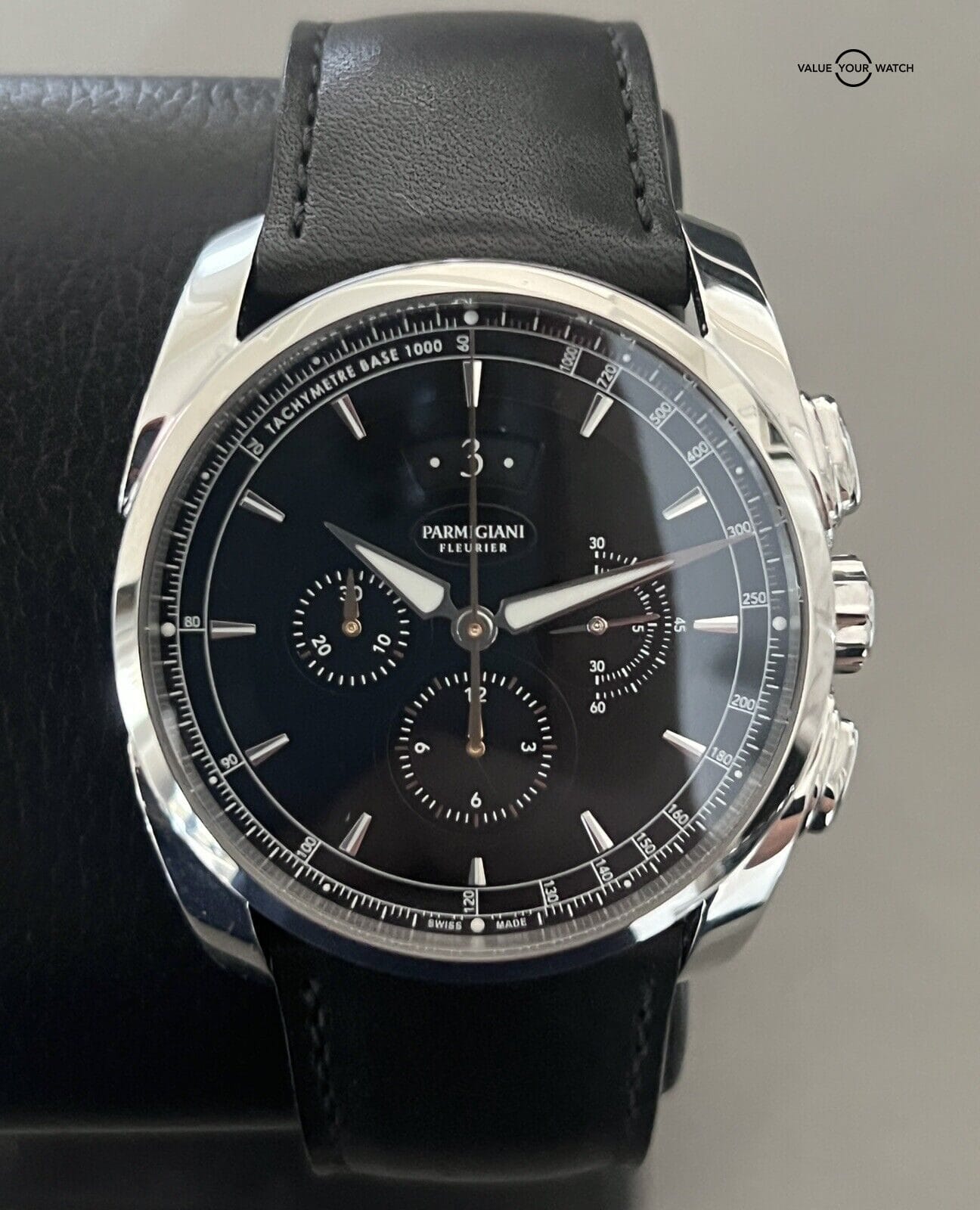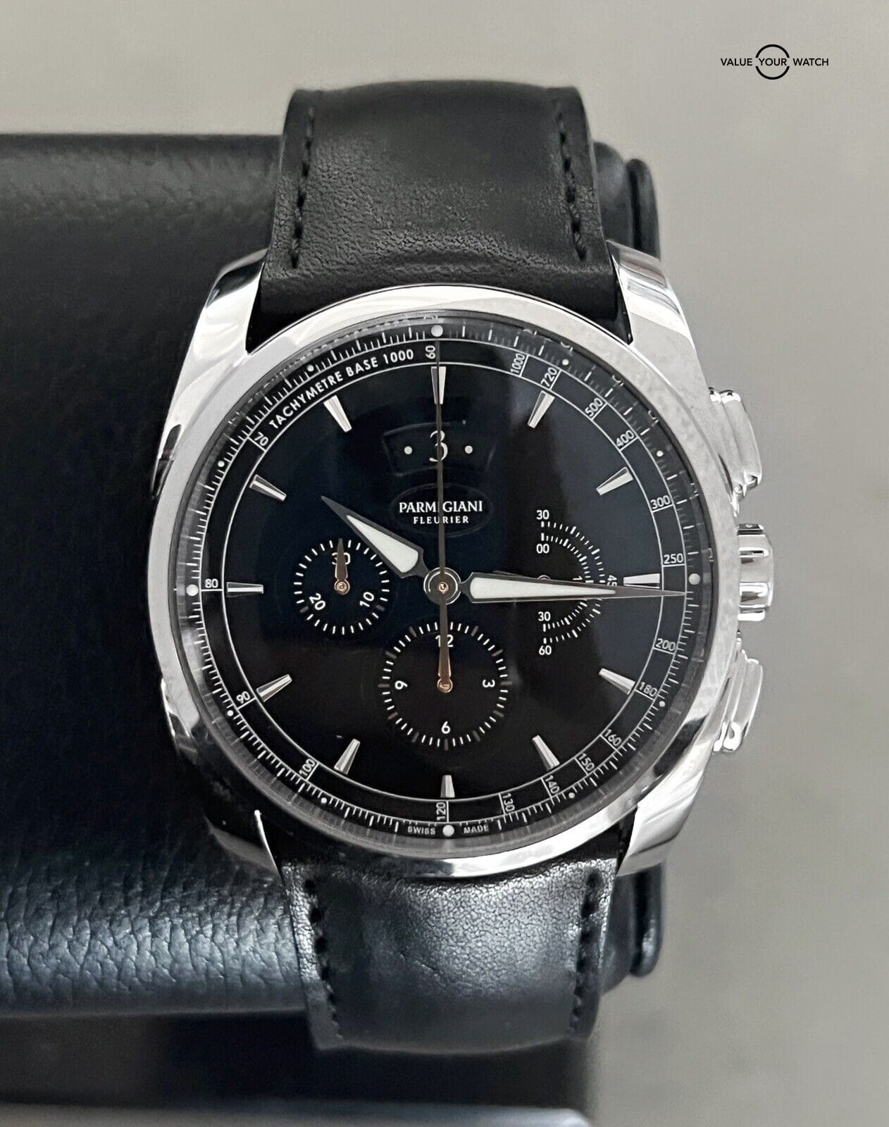 Introducing the Parmigiani Tonda Metrographe Wristwatch, a Swiss-made timepiece that boasts a stunning black dial with a tachymeter scale. This watch features a 40mm polished stainless steel case and a black leather strap with a deployment buckle. The watch is Mechanical (Automatic) and has water resistance of up to 30 Metres/3 ATM.