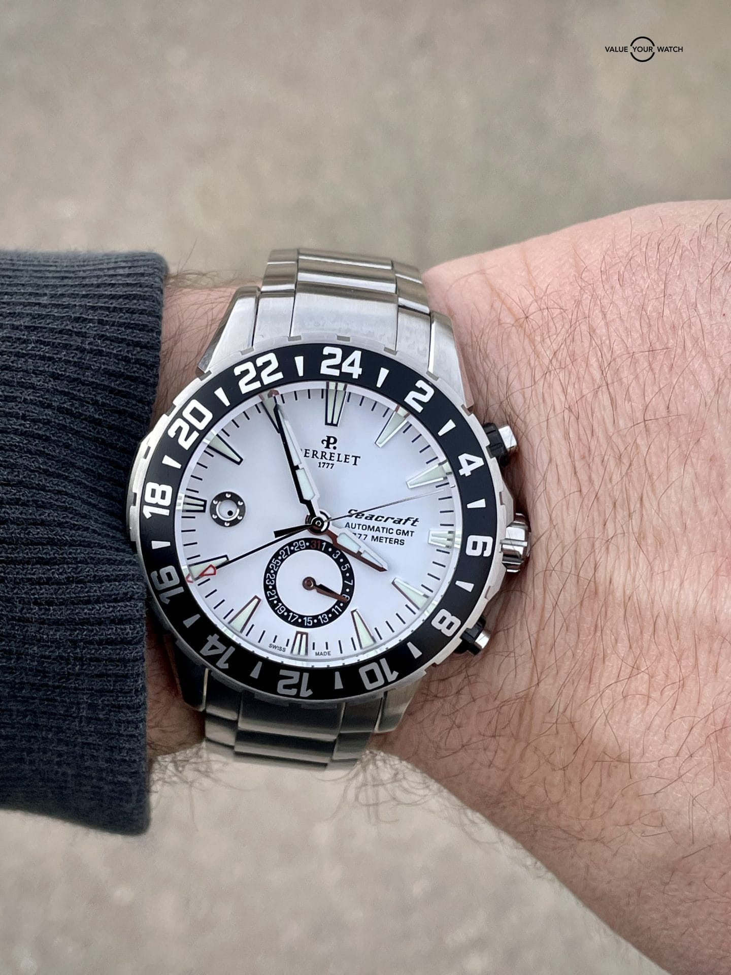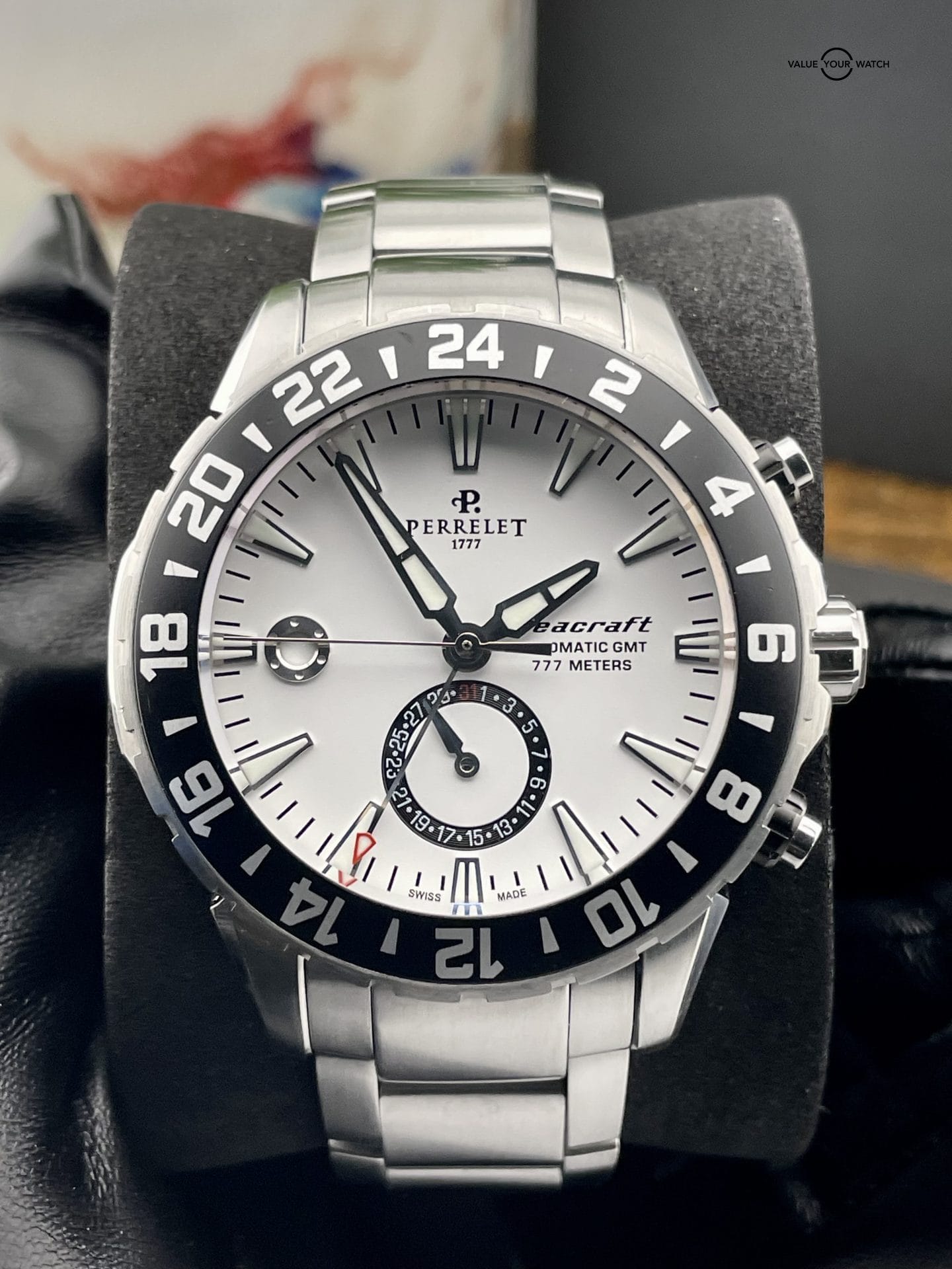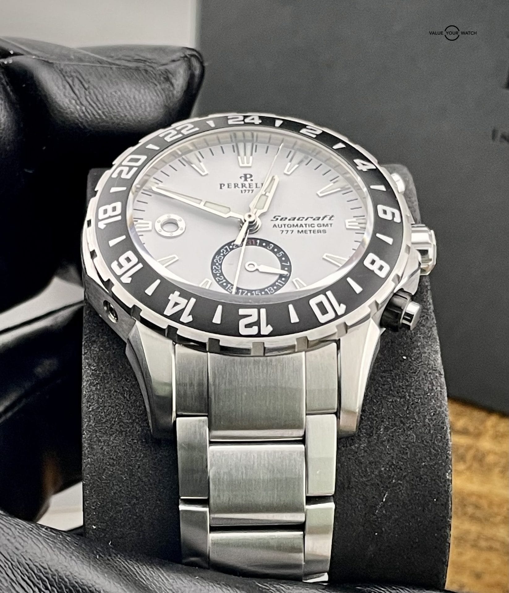 Up for sale is a Perrelet Seacraft GMT wristwatch with a stainless steel bracelet and a white dial. This automatic (self-winding) watch has a 42mm case size and a polished case finish. It features baton indexes, a deployment clasp, quick adjustment bracelet, and a screwback caseback.