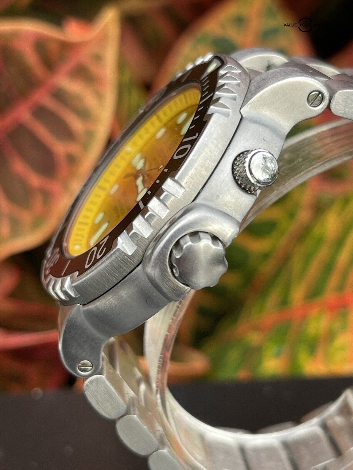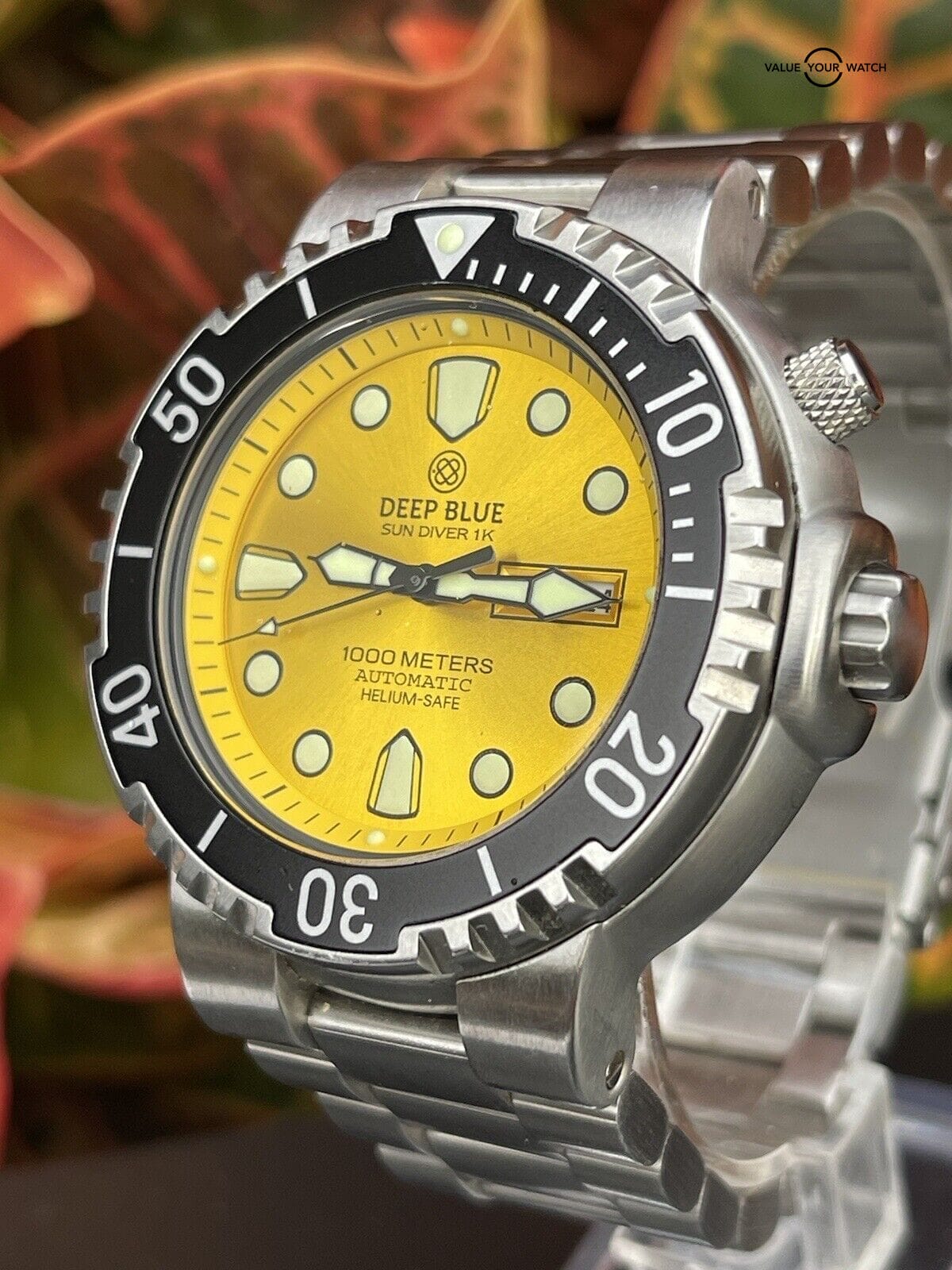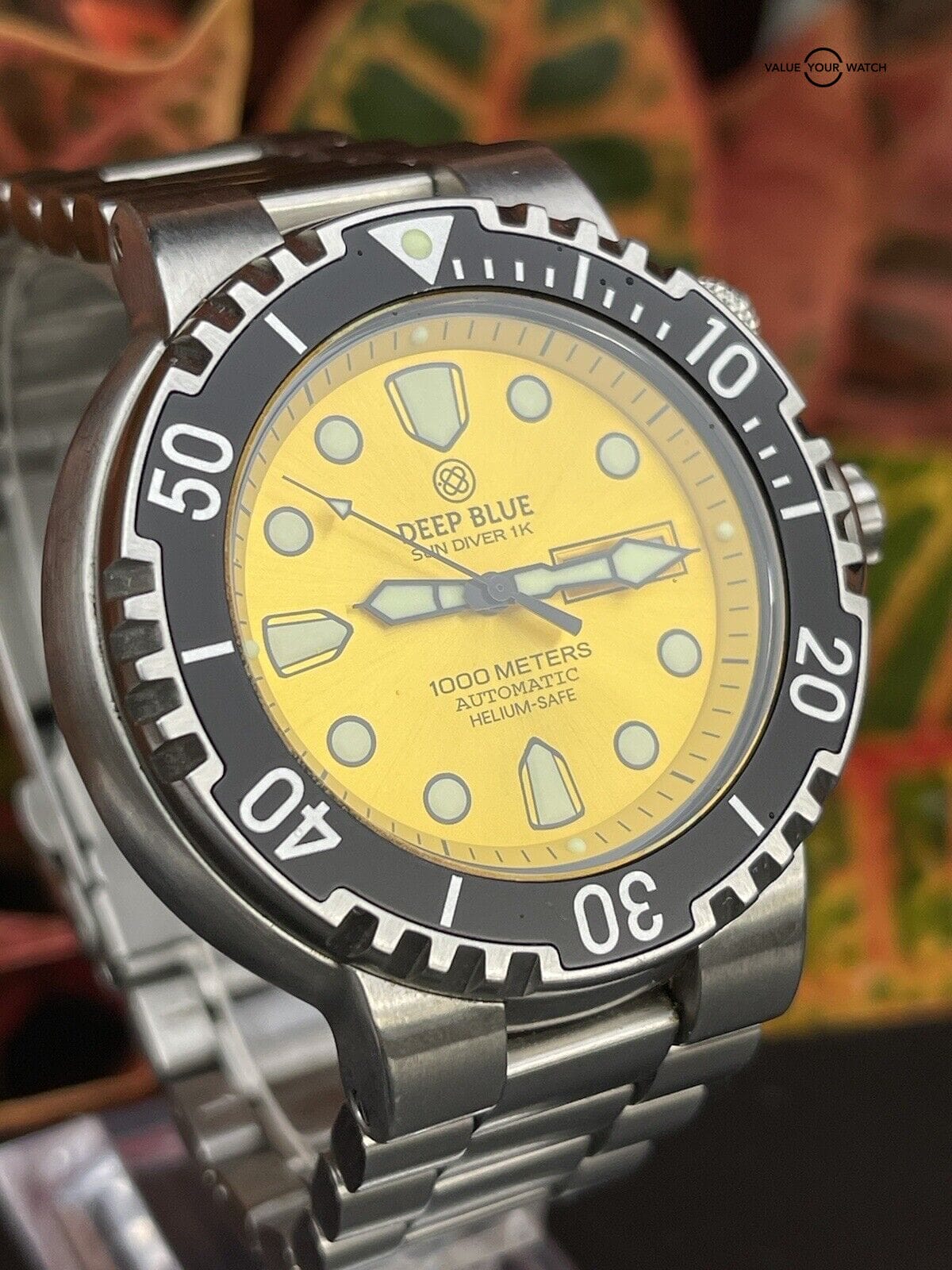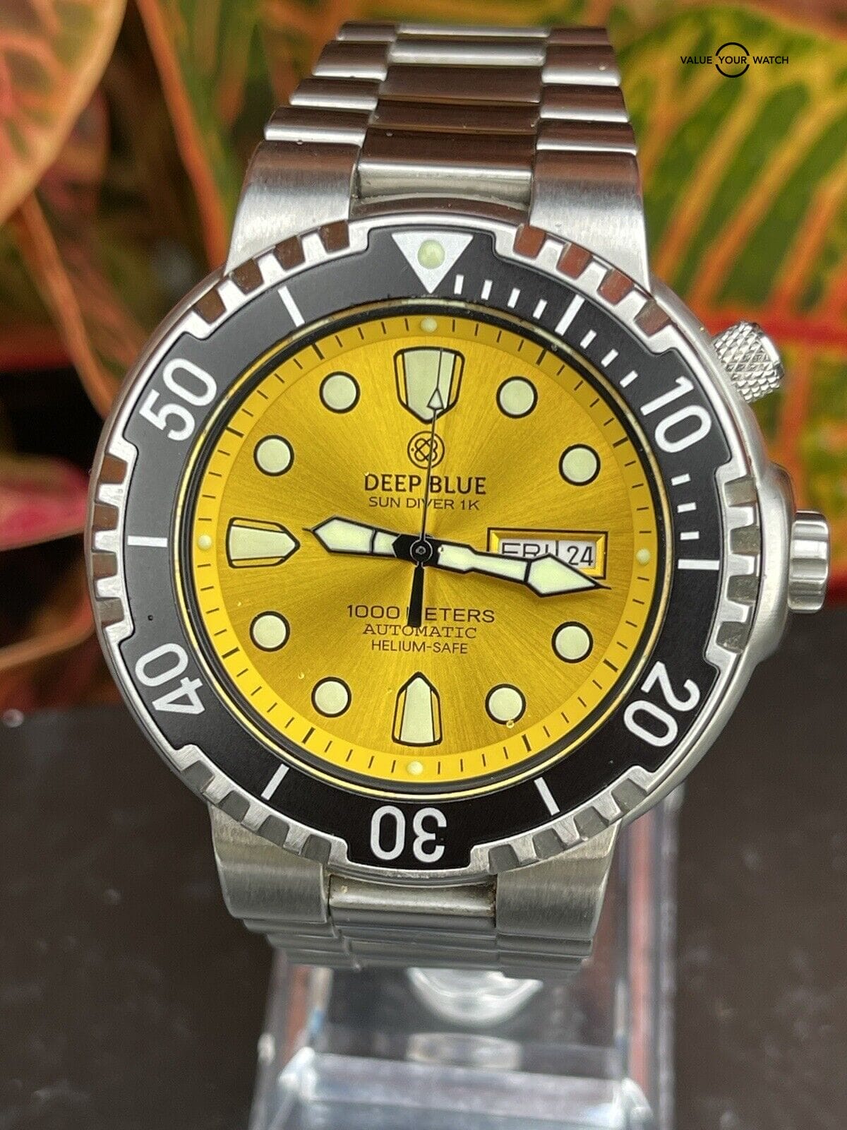 Here is a rare discontinued Deep Blue Sun Diver 1000m Yellow Dial Watch. This model rarely goes on sale. This is from an estate sale and is running.