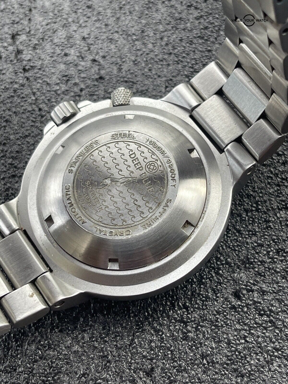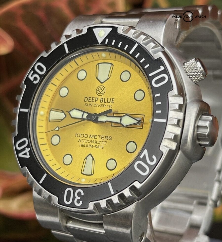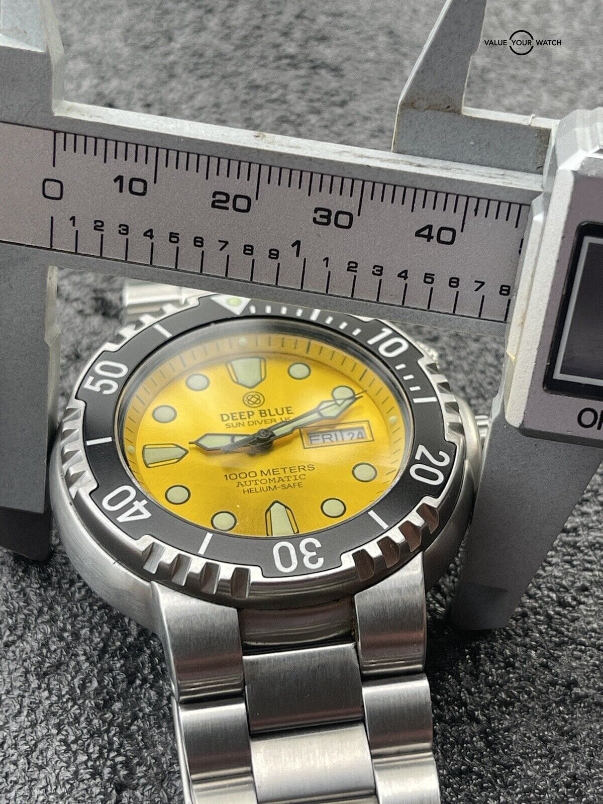 Here is a rare discontinued Deep Blue Sun Diver 1000m Yellow Dial Watch. This model rarely goes on sale. This is from an estate sale and is running.