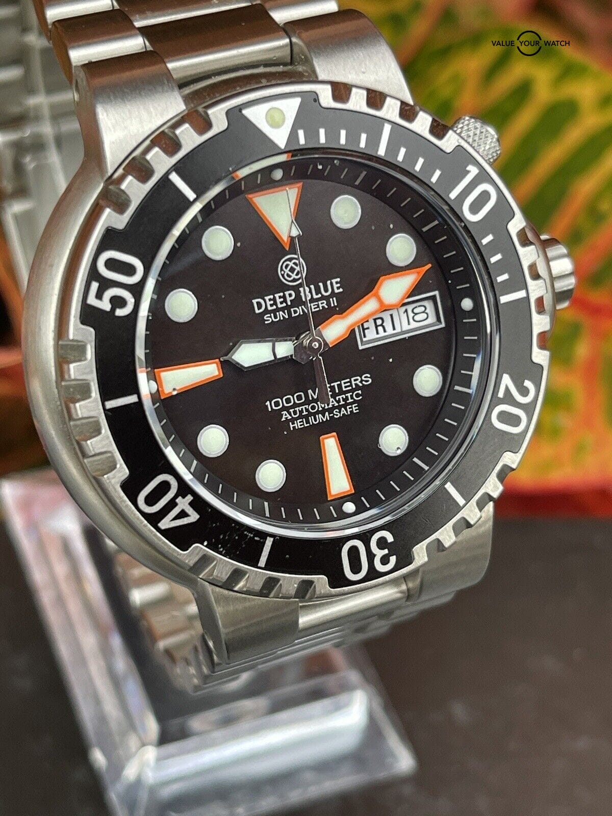 Here is a rare discontinued Deep Blue Sun Diver 2 1000m Black Dial Watch. This model rarely goes on sale. This is from an estate sale and is running.