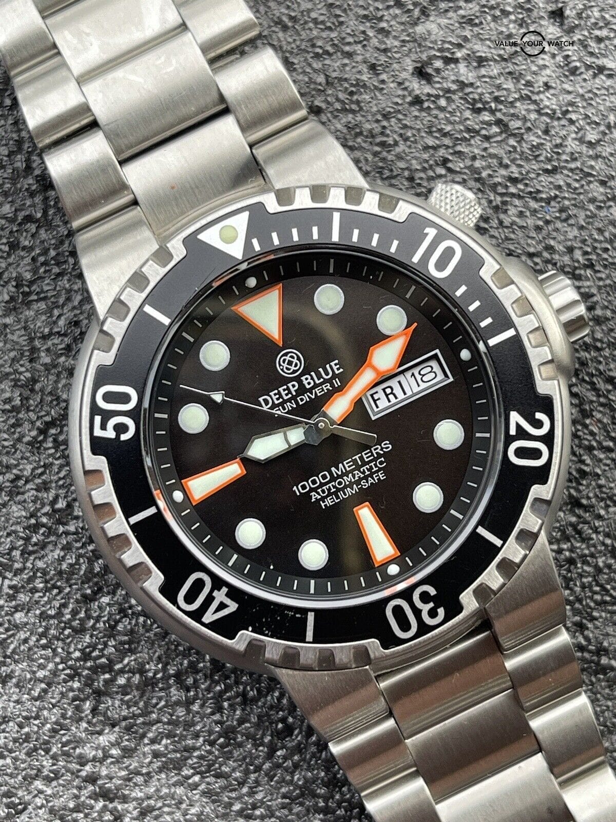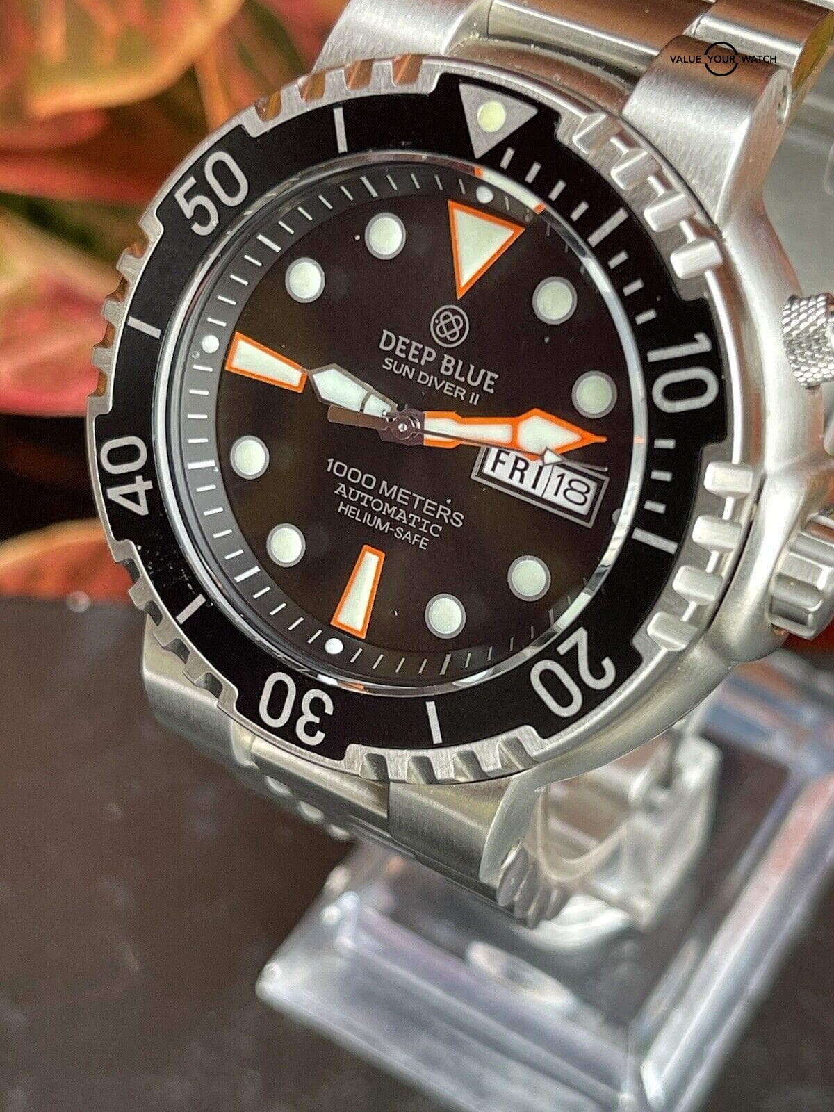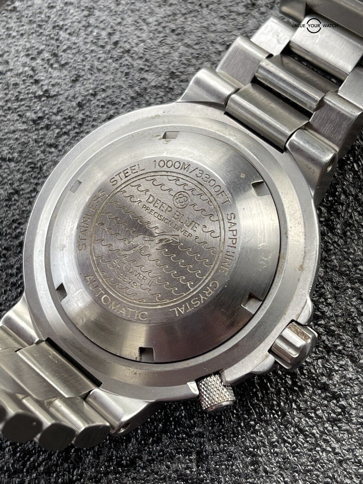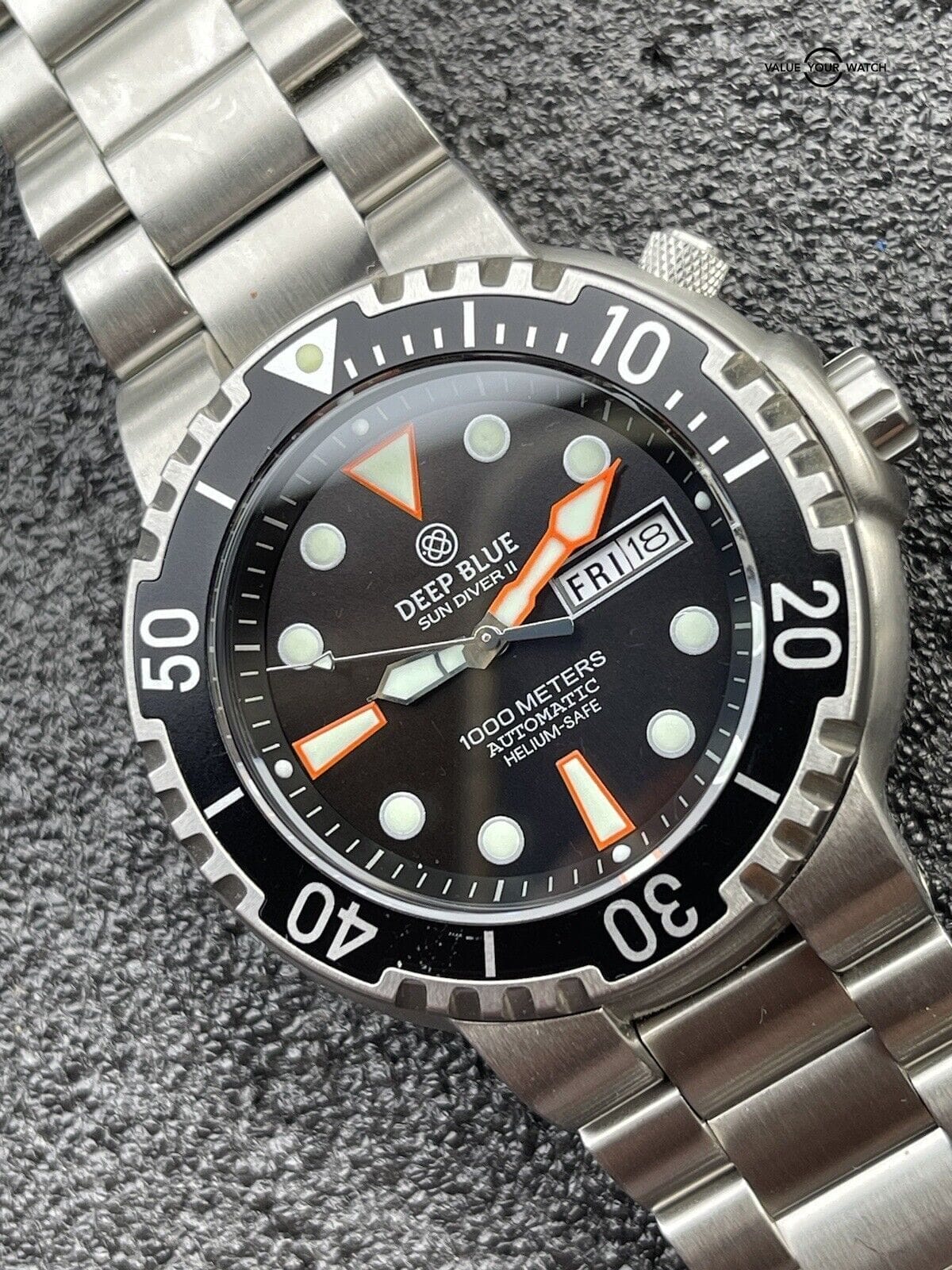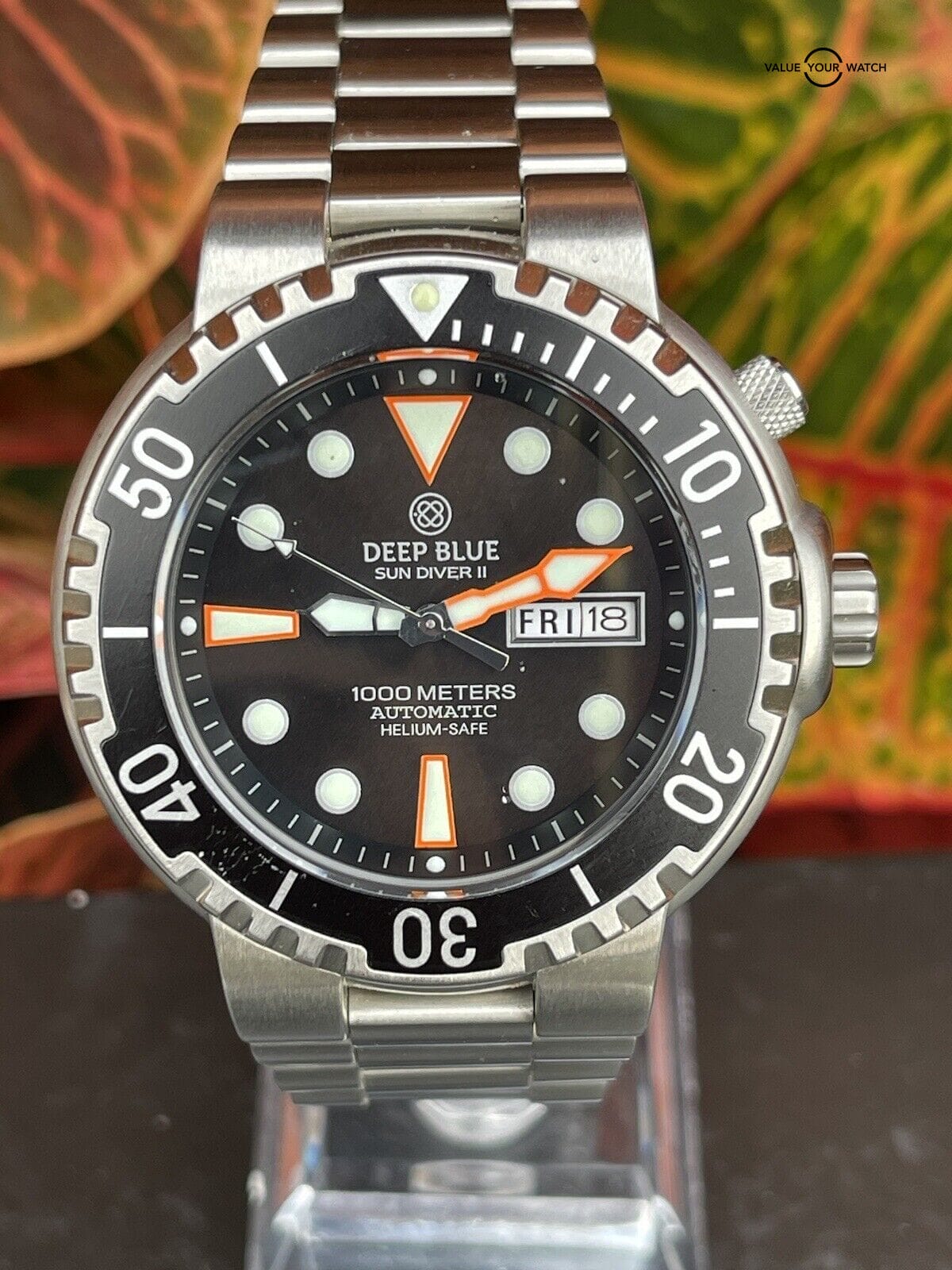 Here is a rare discontinued Deep Blue Sun Diver 2 1000m Black Dial Watch. This model rarely goes on sale. This is from an estate sale and is running.