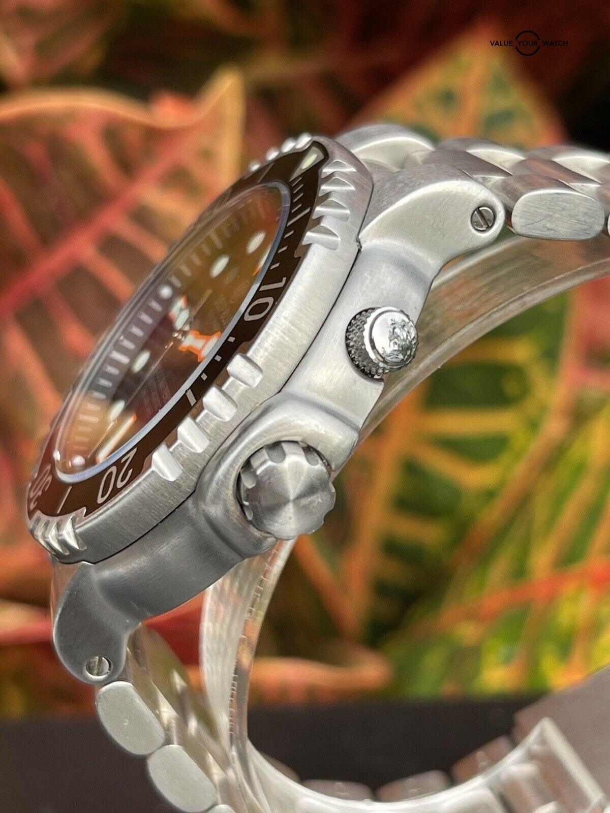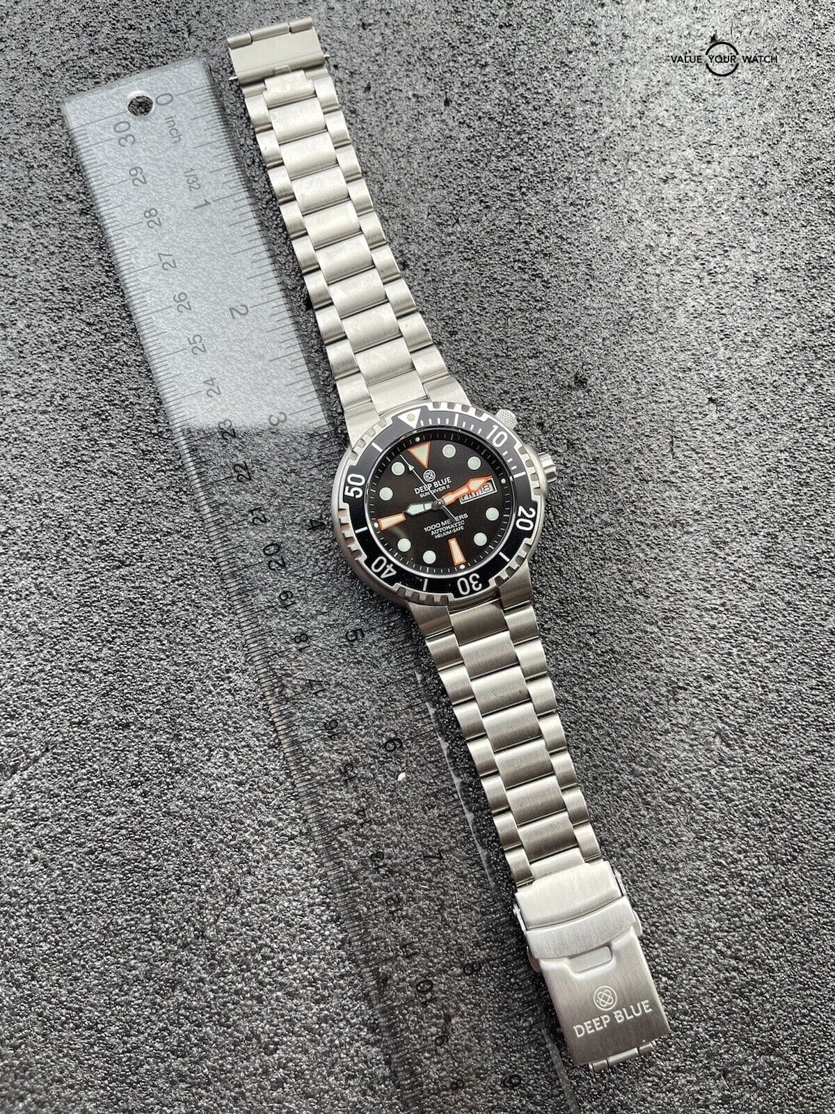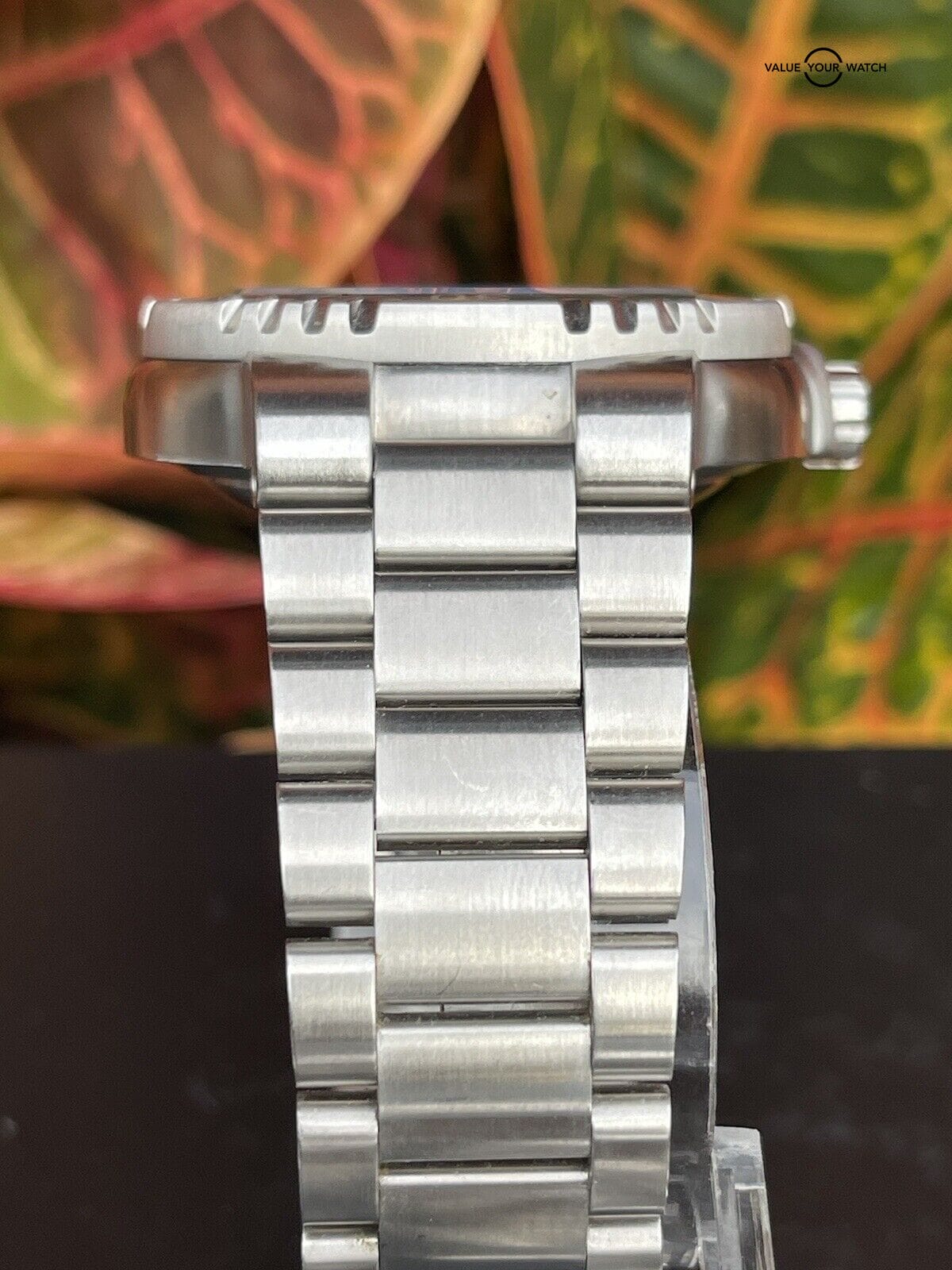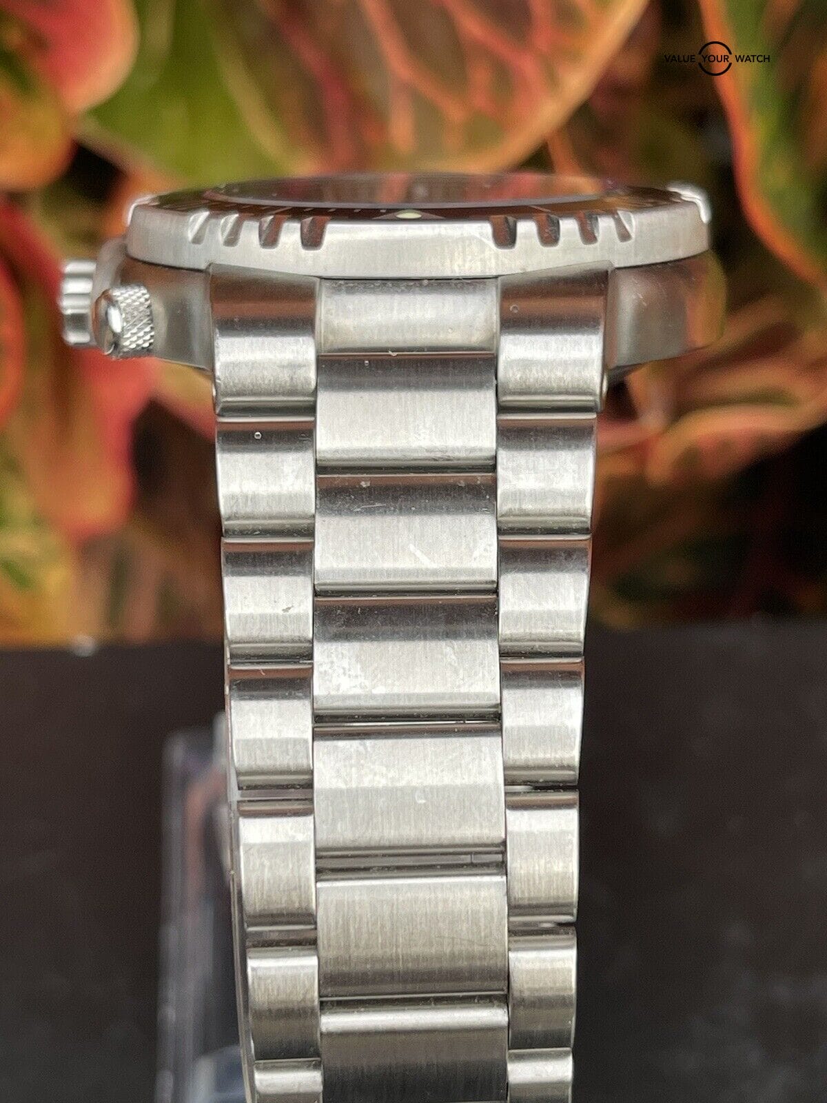 Original steel bracelet is used and shows signs of wear. Will fit up to a 8.5 inch (21.6cm) wrist. With the dive extension it will add another 0.5 inch.