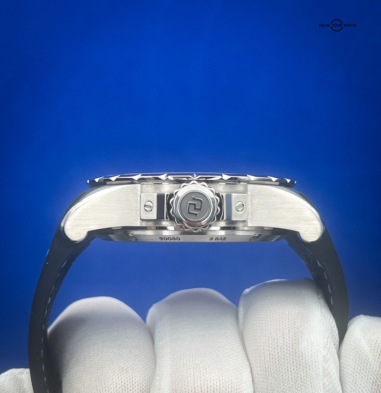 The Roger Dubuis Excalibur (DBEX0724) features a bold and distinctive design, characterized by its 45mm diameter case made of titanium. It boasts a striking silver dial, which serves as the centerpiece of its design, adorned with intricate details such as Roman numerals and a date indicator at 6 o’clock. It will be a unique and rare addition to any watch collection.
