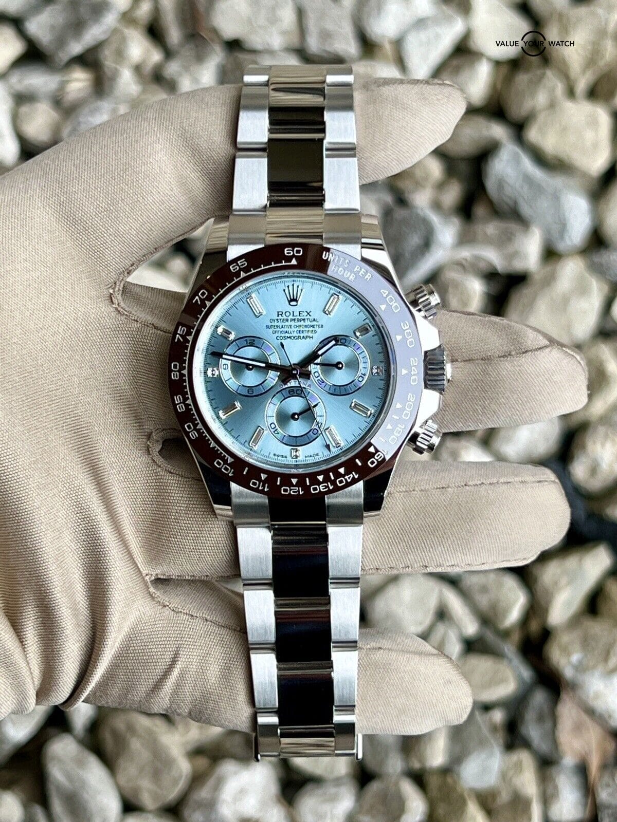 The bracelet is crafted from platinum and features a folding Oysterclasp closure, while the bezel is a tachymeter style with a brown color. The watch has a solid caseback and is 12mm thick, with a lug width of 20mm. This Rolex Cosmograph Daytona is unworn and comes with papers, making it a valuable addition to any watch collection.