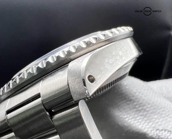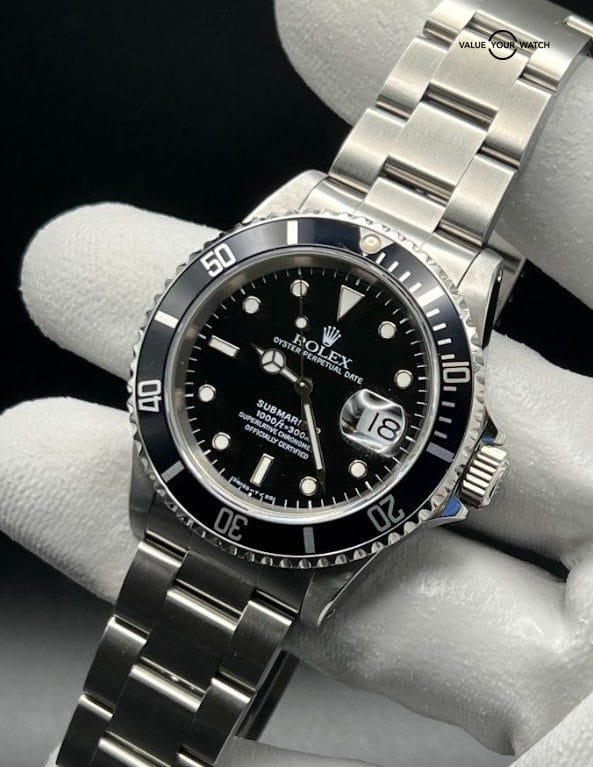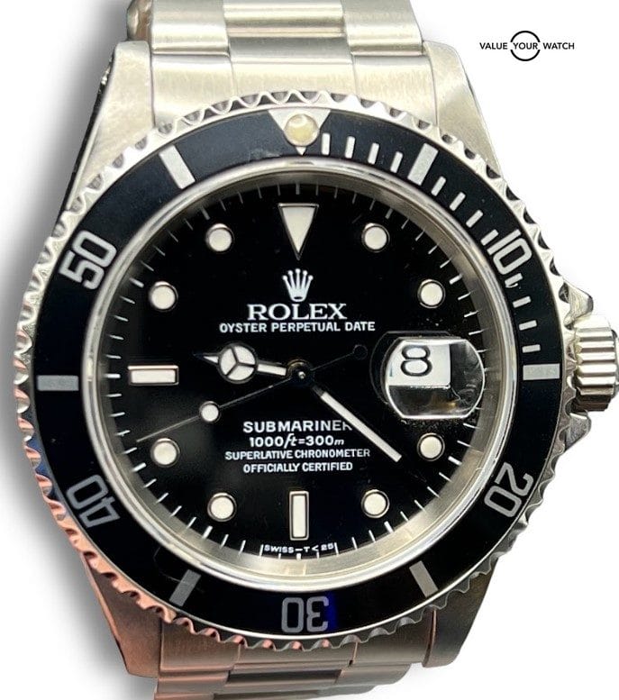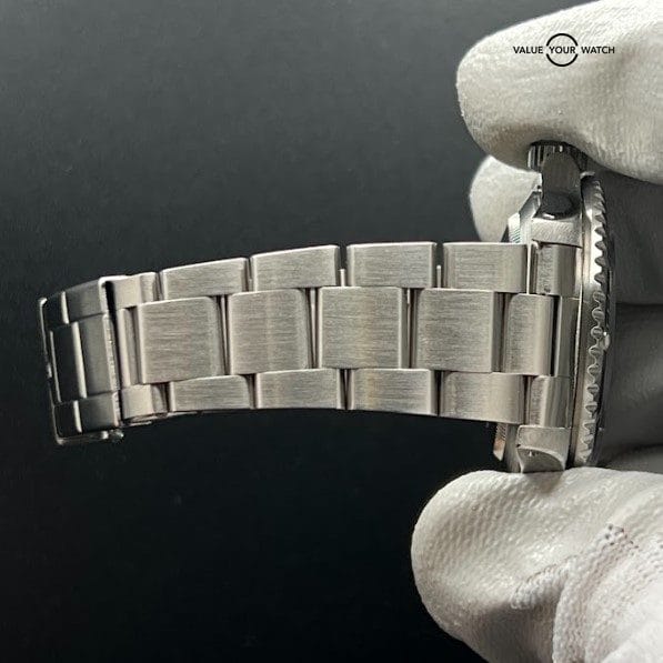 1994 S Serial Rolex Submariner Date 16610. 40mm case. Expertly serviced and polished in March 2023. Looks mint to the naked eye. All original with the highly sought after “Flat 4″ bezel insert. Will easily fit up to a 8” wrist.