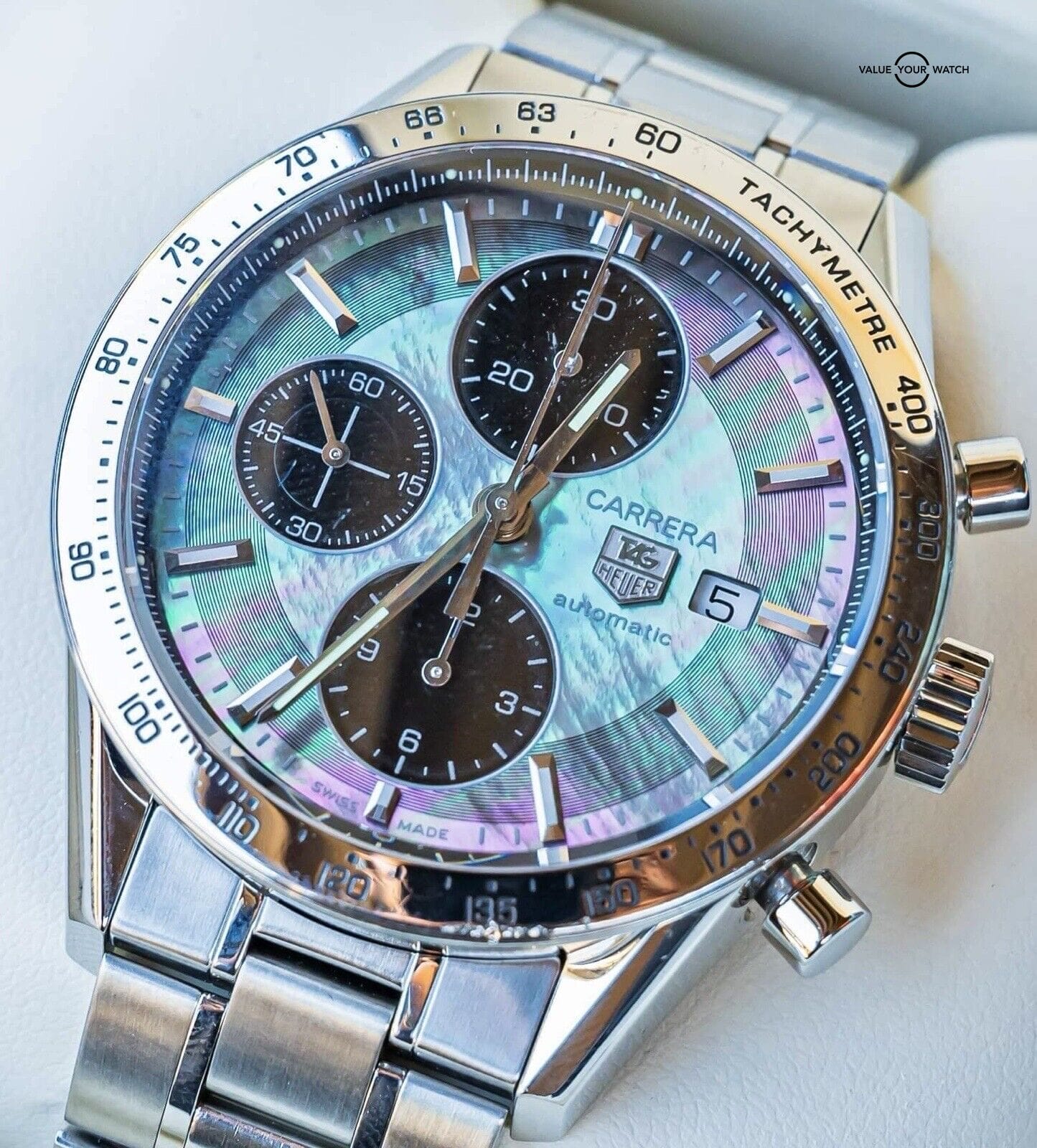 STUNNING Tag Heuer Carrera Chronograph Calibre 16 SERVICED with Mother of Pearl Dial & Black Subdials on Bracelet! Arrives with the original Tag Heuer boxes & open international warranty card. This Carrera is KILLER and is one of the coolest Calibre 16 Carreras ever produced, insanely cool Mother of Pearl Dial!FULLY SERVICED at my watchmaker in March 2024, a huge value-add. The watch is in great condition with only minor wear, nothing notable. Keeping good time on my timegrapher when tested! Do excuse the dust/lint in the pictures as all of our watches are photographed outdoors in natural lighting/conditions. I LOVE the Mother of Pearl Dial on this Carrera, and it is ready to be on wrist! Do not hesitate to contact me with any questions. I sell over 600 watches per year, have fantastic reviews online, and thousands of references; I seek a very simple and pleasant buying experience for my clients through fostering relationships in the watch community. The serials have been blurred for privacy. The bracelet can accommodate a 7.38 inch wrist at maximum without additional links.Tag Heuer Carrera Chronograph Reference: CV201P.BA0794Bezel: Fixed Polished SteelBracelet: Brushed & Polished Stainless SteelCase: Polished Stainless SteelCase Diameter: 41.00 mmCrown: Push-PullCrystal: Sapphire Dial: Mother of Pearl w/Black SubdialsFunctions: Hours, Minutes, Seconds, Date, ChronographJewels: 21Lug Width: 20.00 mmMovement: Automatic Tag Heuer Calibre 16Power Reserve: 42 HoursVibrations: 28,800 vphWater Resistance: 100 Meters / 330 Feet