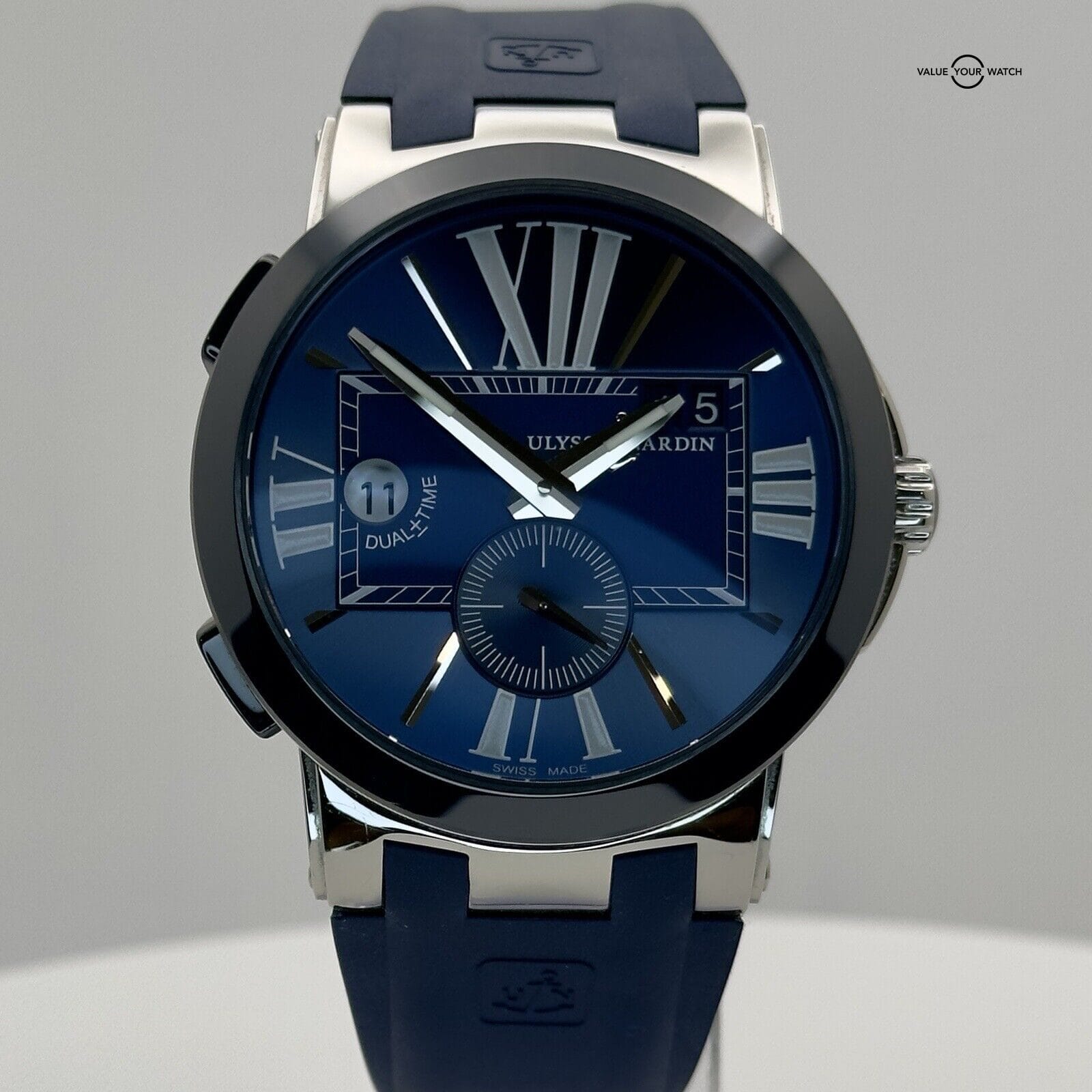 Ulysse Nardin Executive Dual Time 43mm – With 2 Different Straps – Blue Leather & Rubber Strap****Item Condition:**This Ulysse Nardin Executive Dual Time watch is in excellent condition with minimal to no signs of wear. It comes complete with its original inner and outer boxes, user manual, and warranty card.**Product Description:**Experience the epitome of functionality and style with the Ulysse Nardin Executive Dual Time, model size 43mm. This sophisticated timepiece features a striking blue dial that perfectly complements its innovative blue leather and rubber strap, blending comfort with elegance.**Key Features:**- **Case Diameter:** 43mm- **Dial:** Deep blue with easy-to-read dial markers and hands.- **Strap:** High-quality blue leather fused with rubber for durability and style.- **Crystal:** Scratch-resistant sapphire crystal.- **Movement:** Automatic movement ensures precision and reliability.- **Dual Time Feature:** Ideal for travelers, allowing you to keep track of time in two time zones simultaneously.- **Water Resistance:** Suitable for short periods of recreational swimming, but not diving or snorkeling.**Additional Information:**This Ulysse Nardin watch is a perfect blend of luxury and practicality, ideal for the discerning professional or the avid traveler. The watch’s dual time function is seamlessly integrated into the design, making it a practical choice for managing multiple time zones.Every aspect of the watch has been meticulously documented through high-quality photographs, which highlight the pristine condition of the watch and the unique features of the design. Please review these images carefully to fully appreciate the craftsmanship and state of the watch.**Seller’s Commitment:**I am committed to transparency and customer satisfaction. This watch is guaranteed authentic, and I stand behind its quality and condition. References and additional photos are available upon request. Please feel free to reach out with any questions or for further details.**Purchase with confidence from a trusted seller and enhance your collection with this exquisite Ulysse Nardin Executive Dual Time today!**
