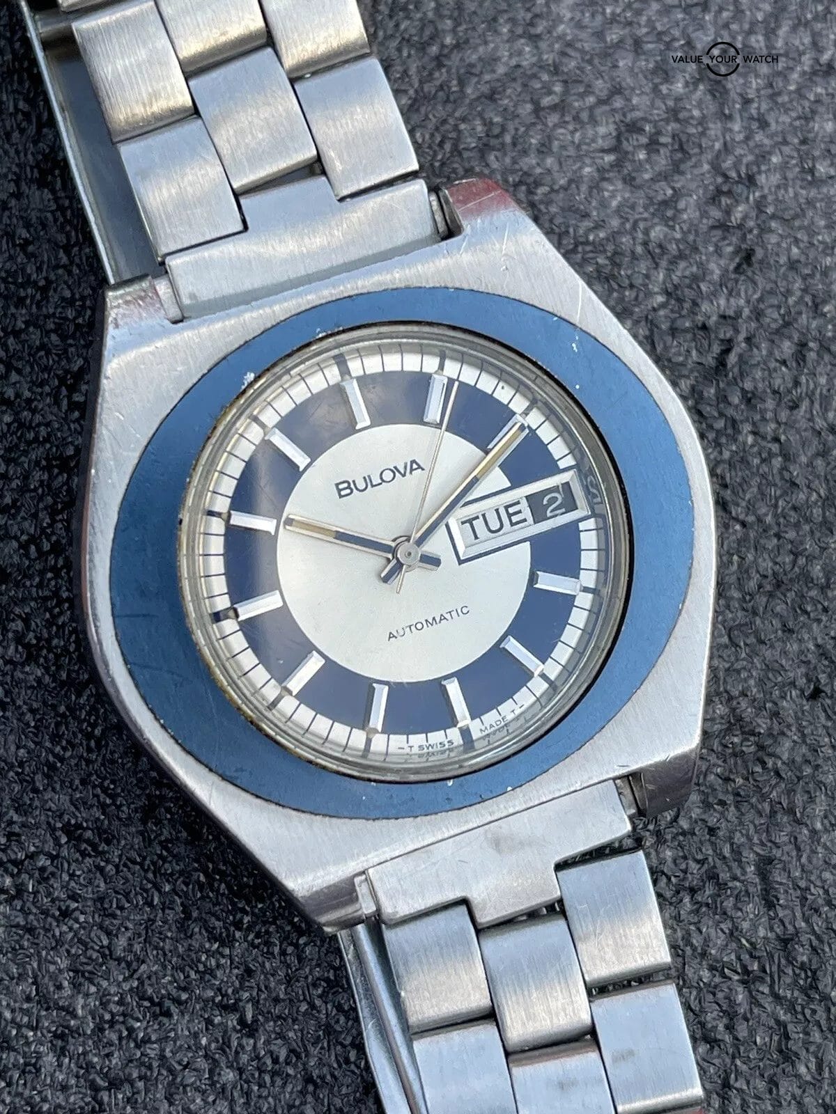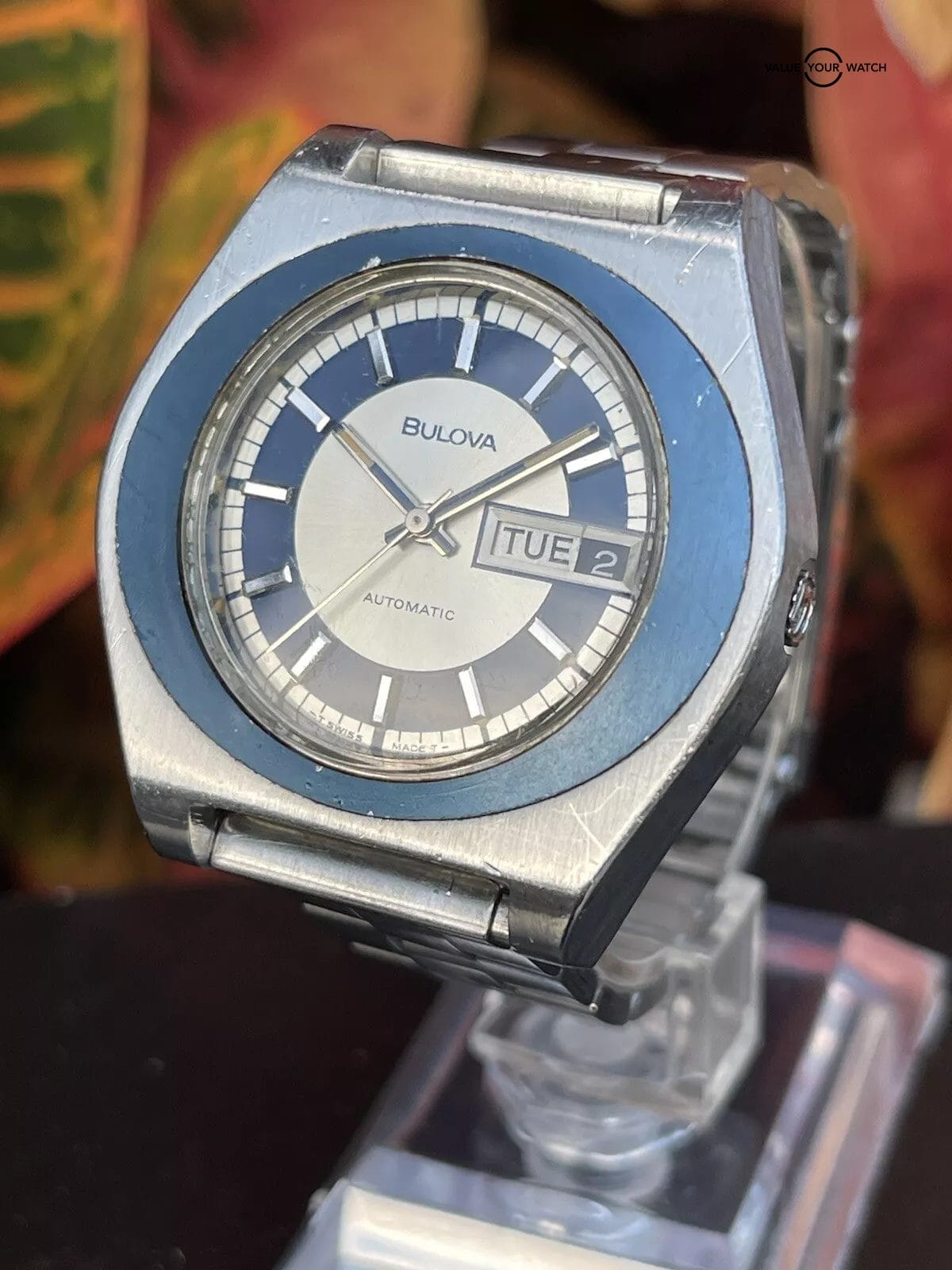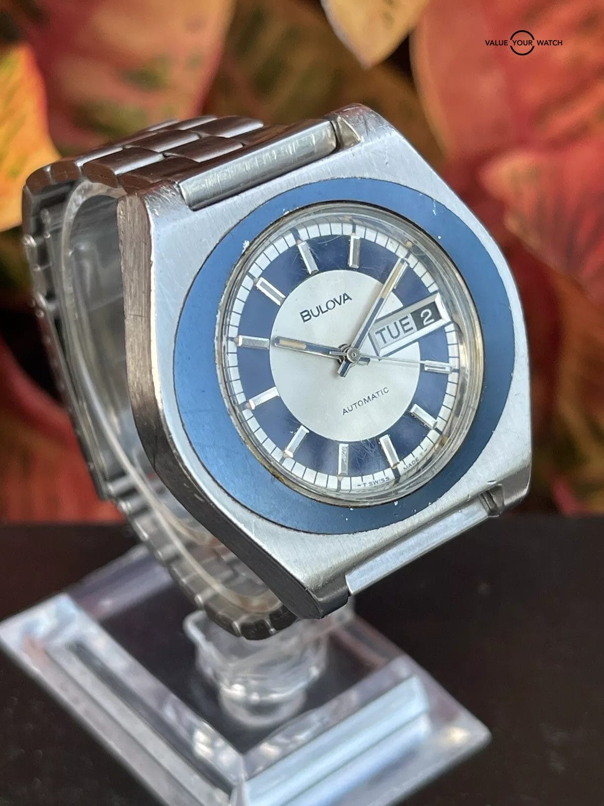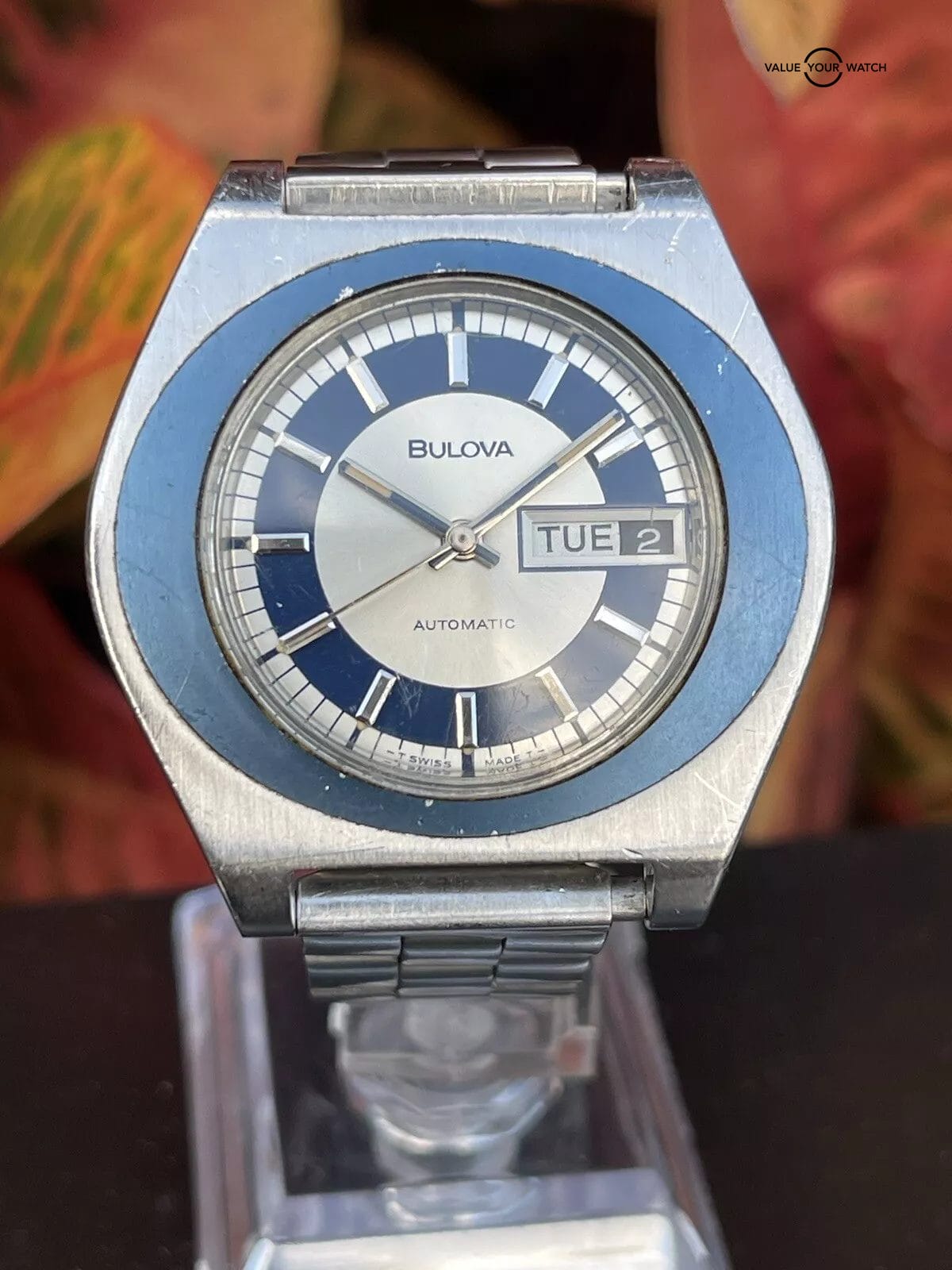 Here is a vintage Bulova Jet Star Automatic Wrist Watch. This 40mm jumbo watch is from 1973 and features a rare blue and white dial. This came from an estate sale.