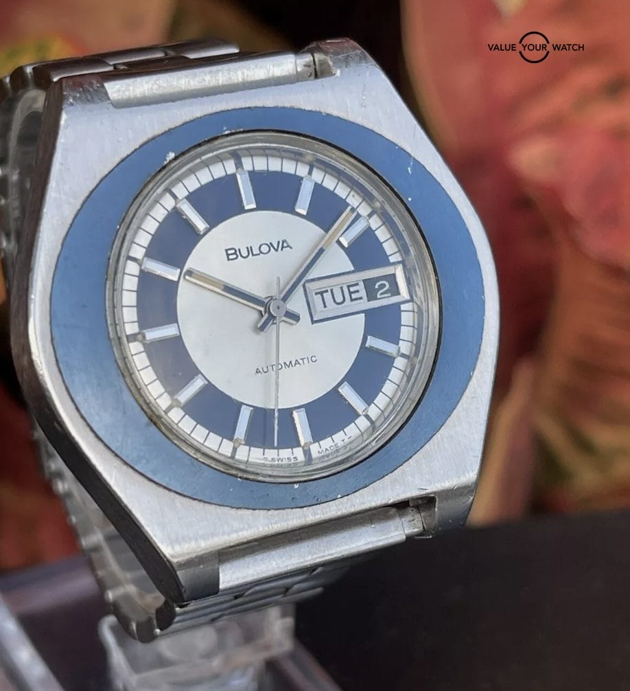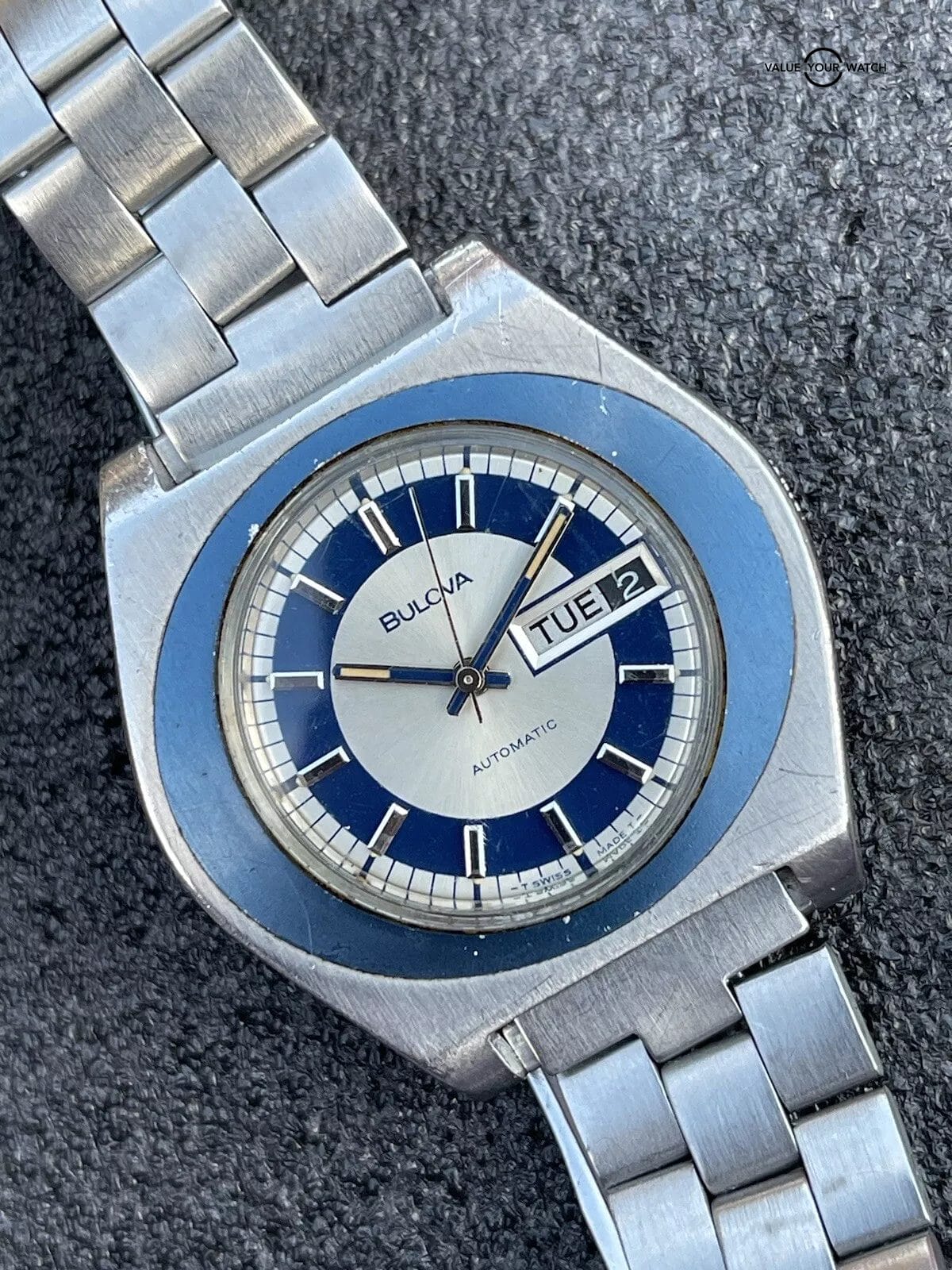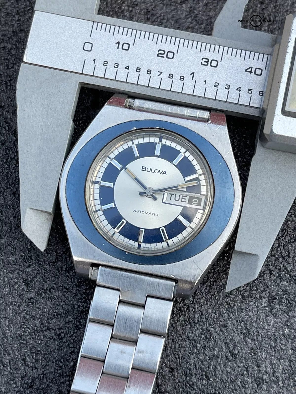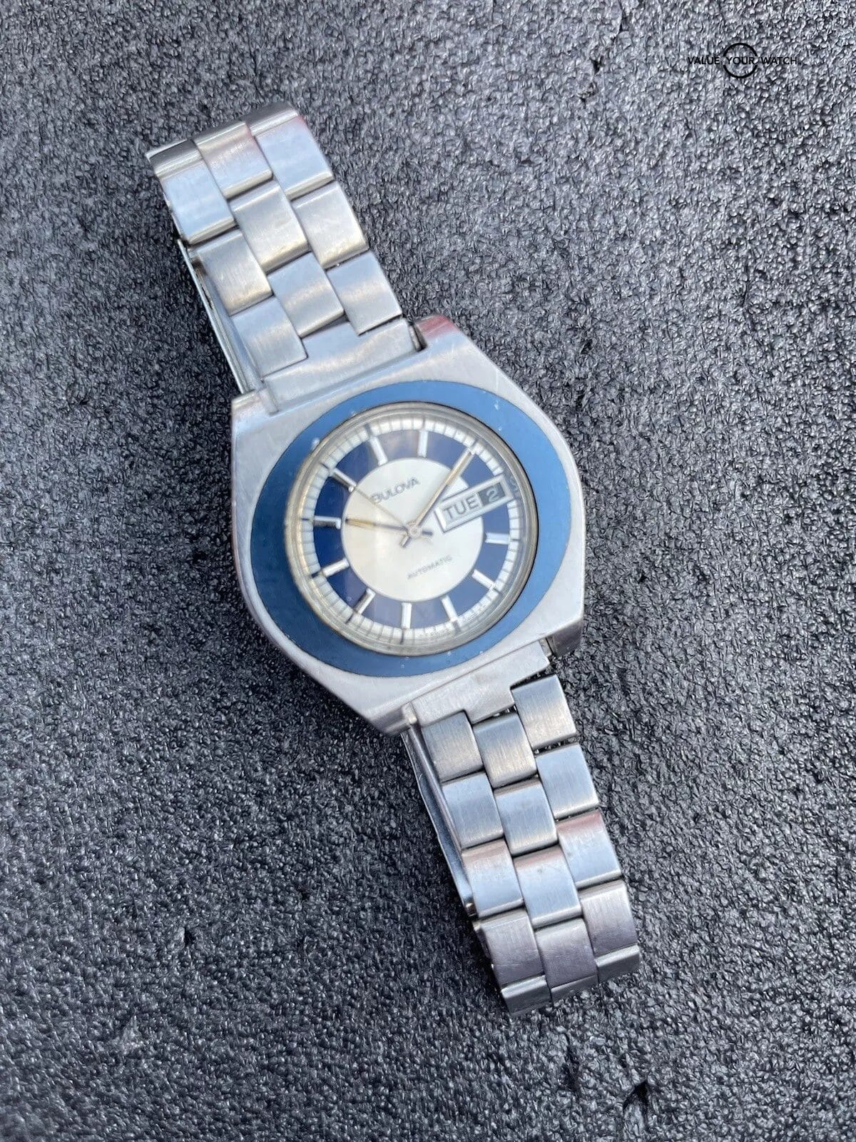 Here is a vintage Bulova Jet Star Automatic Wrist Watch. This 40mm jumbo watch is from 1973 and features a rare blue and white dial. This came from an estate sale.