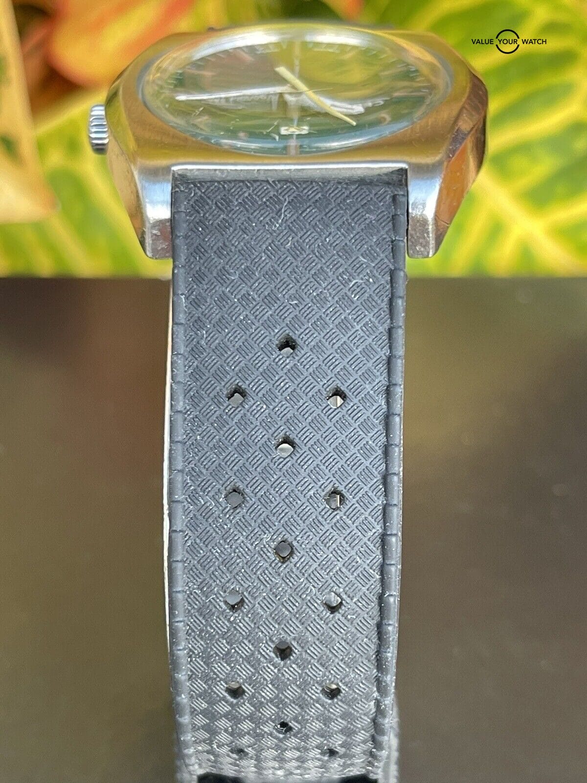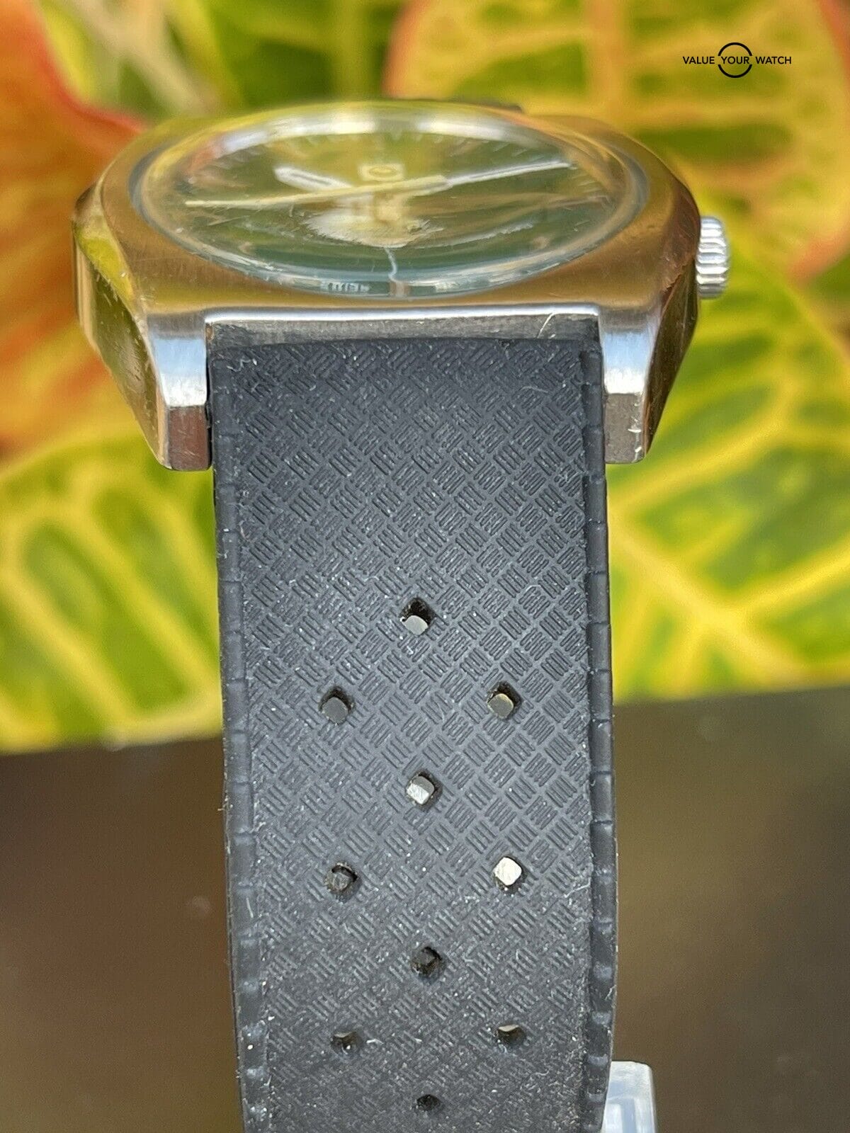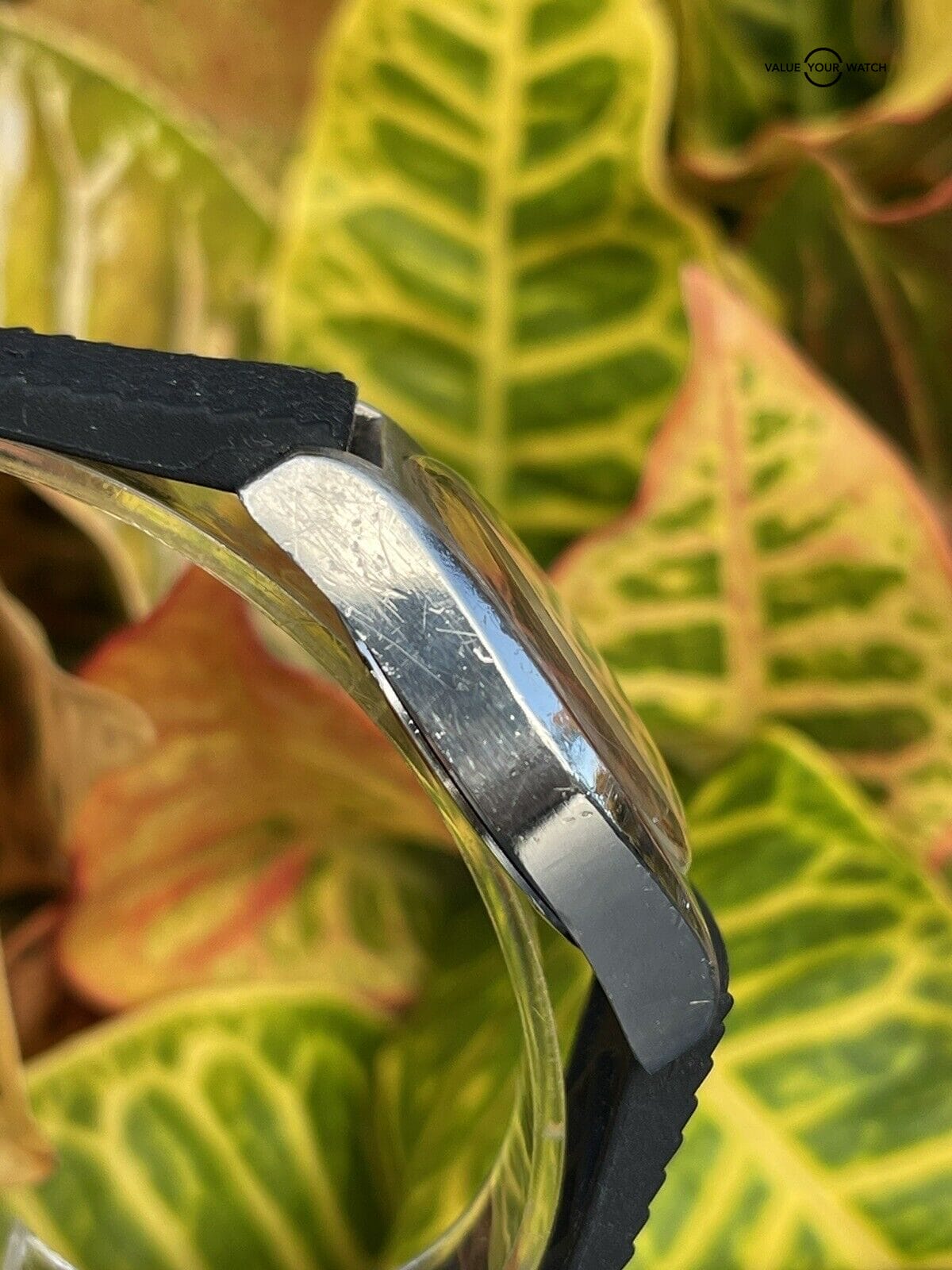 Rubber tropical strap is used and shows signs of wear. Not original to the watch.