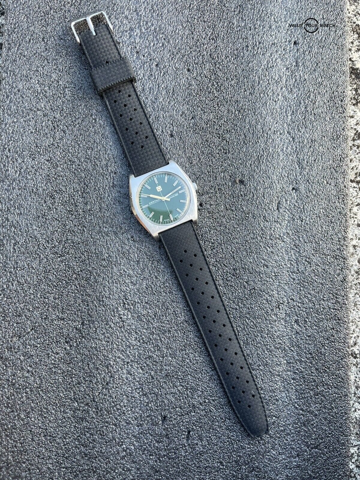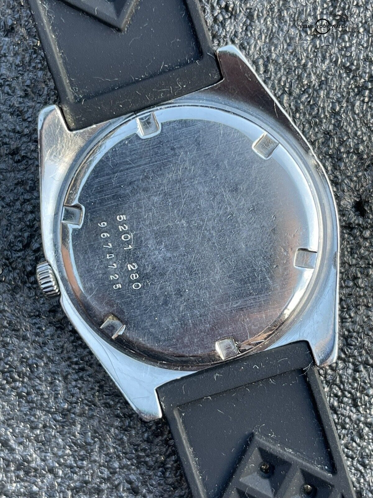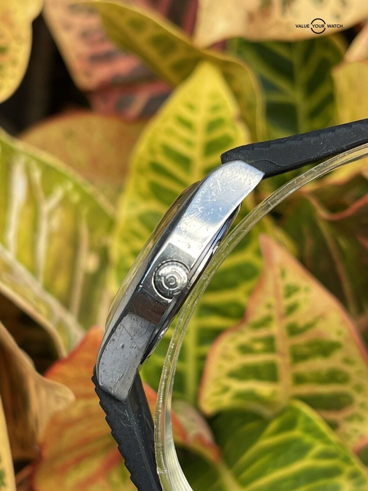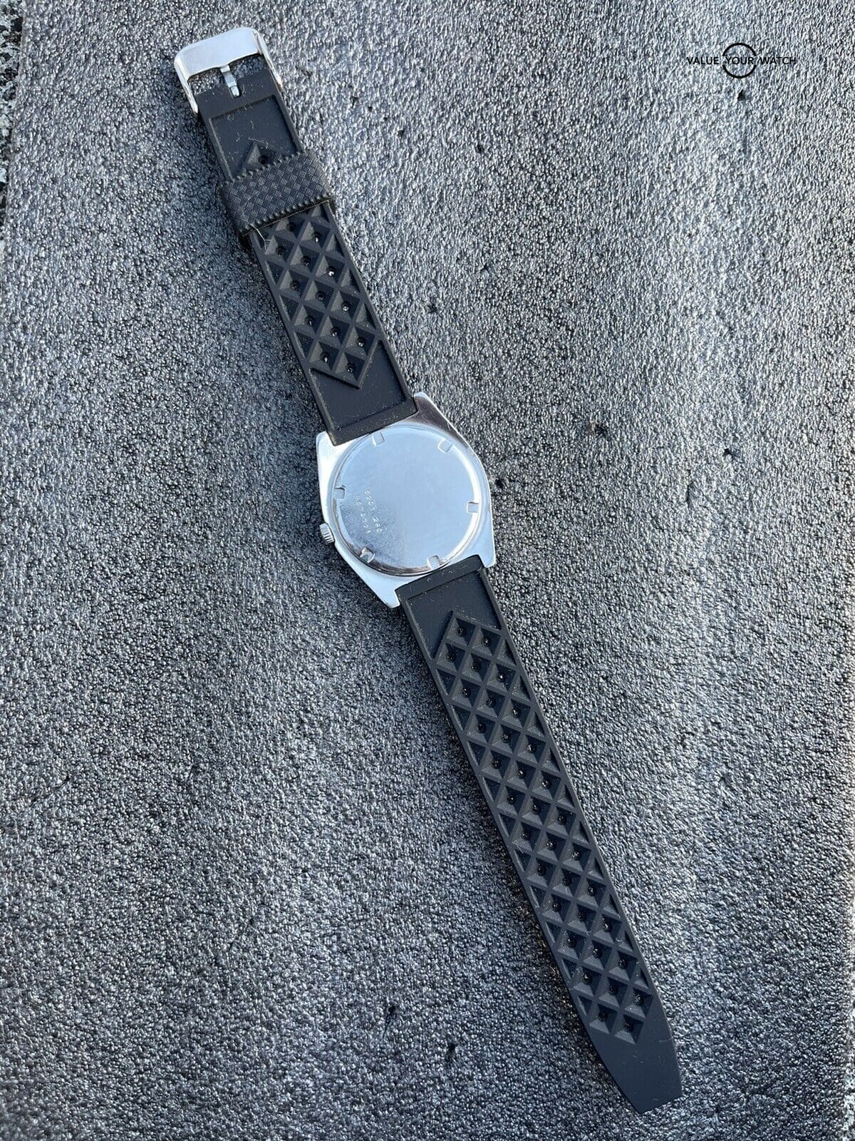 Rubber tropical strap is used and shows signs of wear. Not original to the watch.