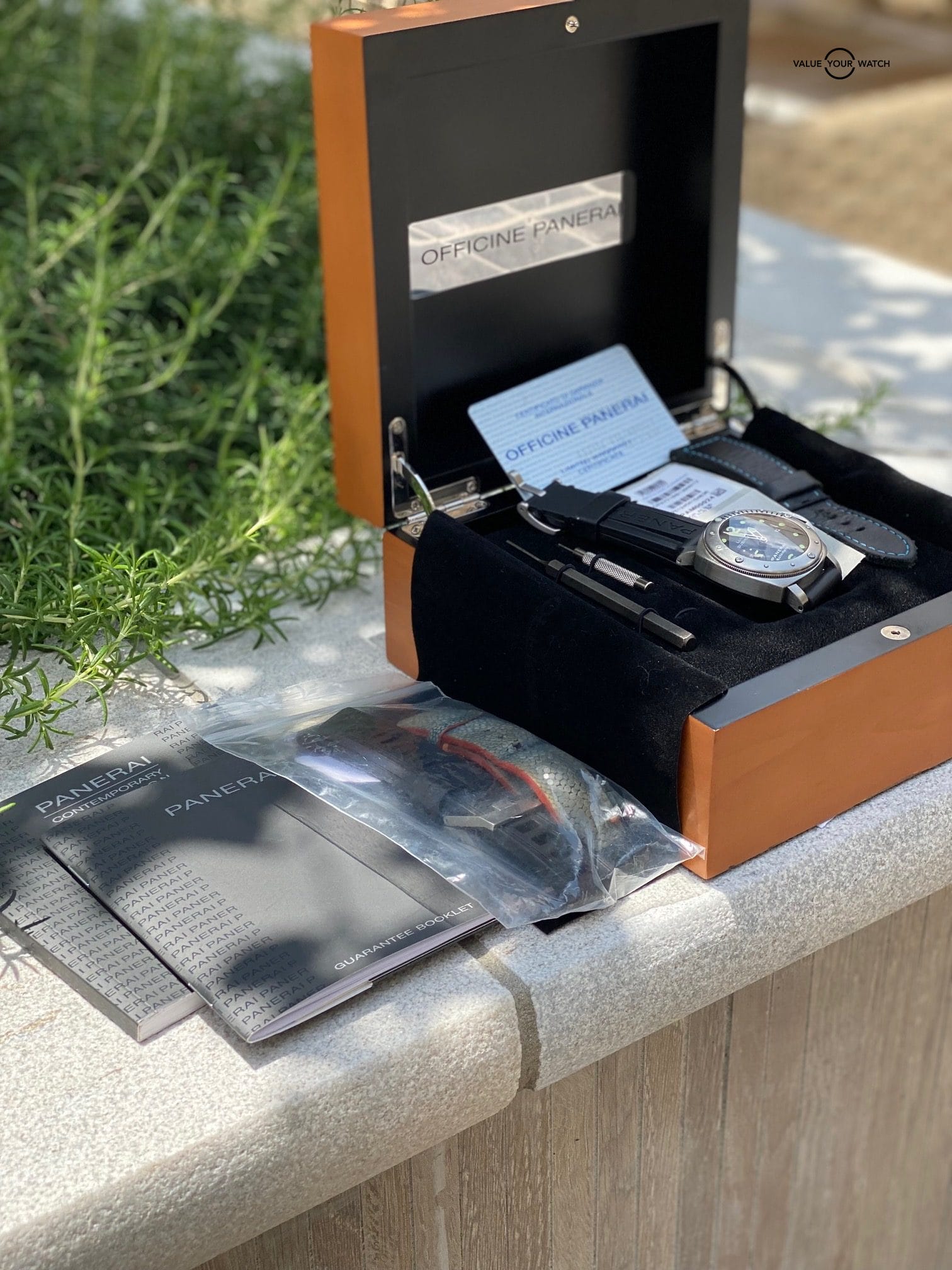 The watch is secured to the wrist with a comfortable and robust black rubber strap featuring the signature Panerai buckle. The set includes an additional black leather OEM strap with blue stitches, an additional after-market black rubber strap, and one outlined in red, adding to the watch’s versatility, and ensuring a secure and comfortable fit during any activity.