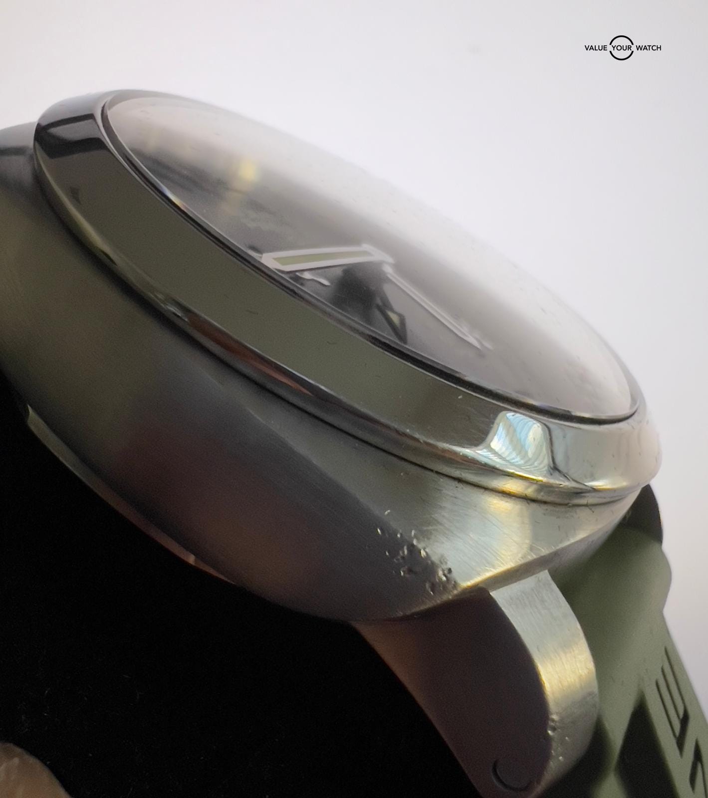 This timepiece is in fair condition with minor flea bite nicks around the lower left area of the lug that may be polished out. It comes as part of a set that includes a box, booklets, a tool kit, an additional new OEM suede coffee leather strap, and papers dated January 24th, 2013.