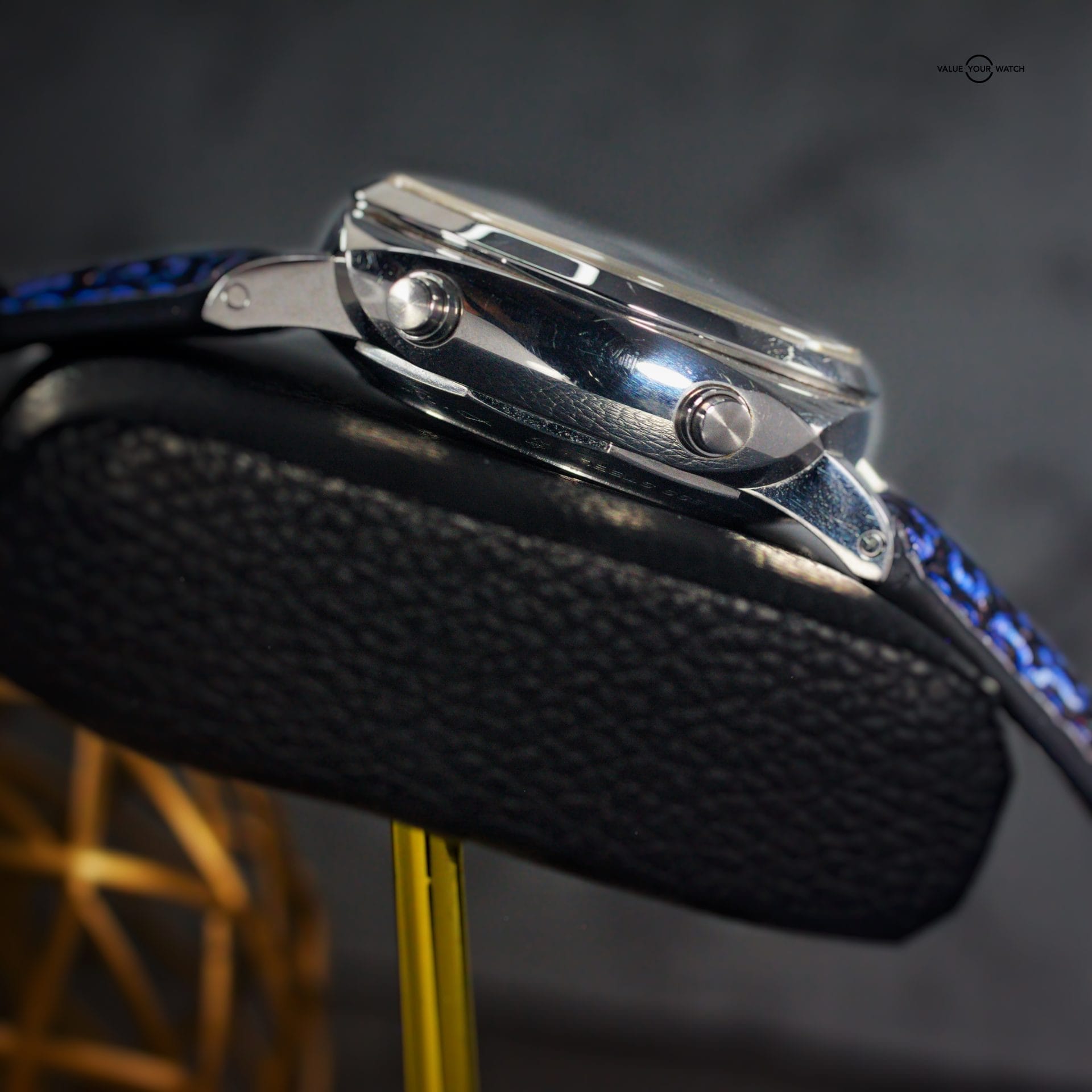 This stunning timepiece comes with both inner & outer boxes, all papers, screwdriver & strap tool, OEM brown rubber Panerai strap & a bespoke blue shark skin strap that really makes this watch pop off the wrist.