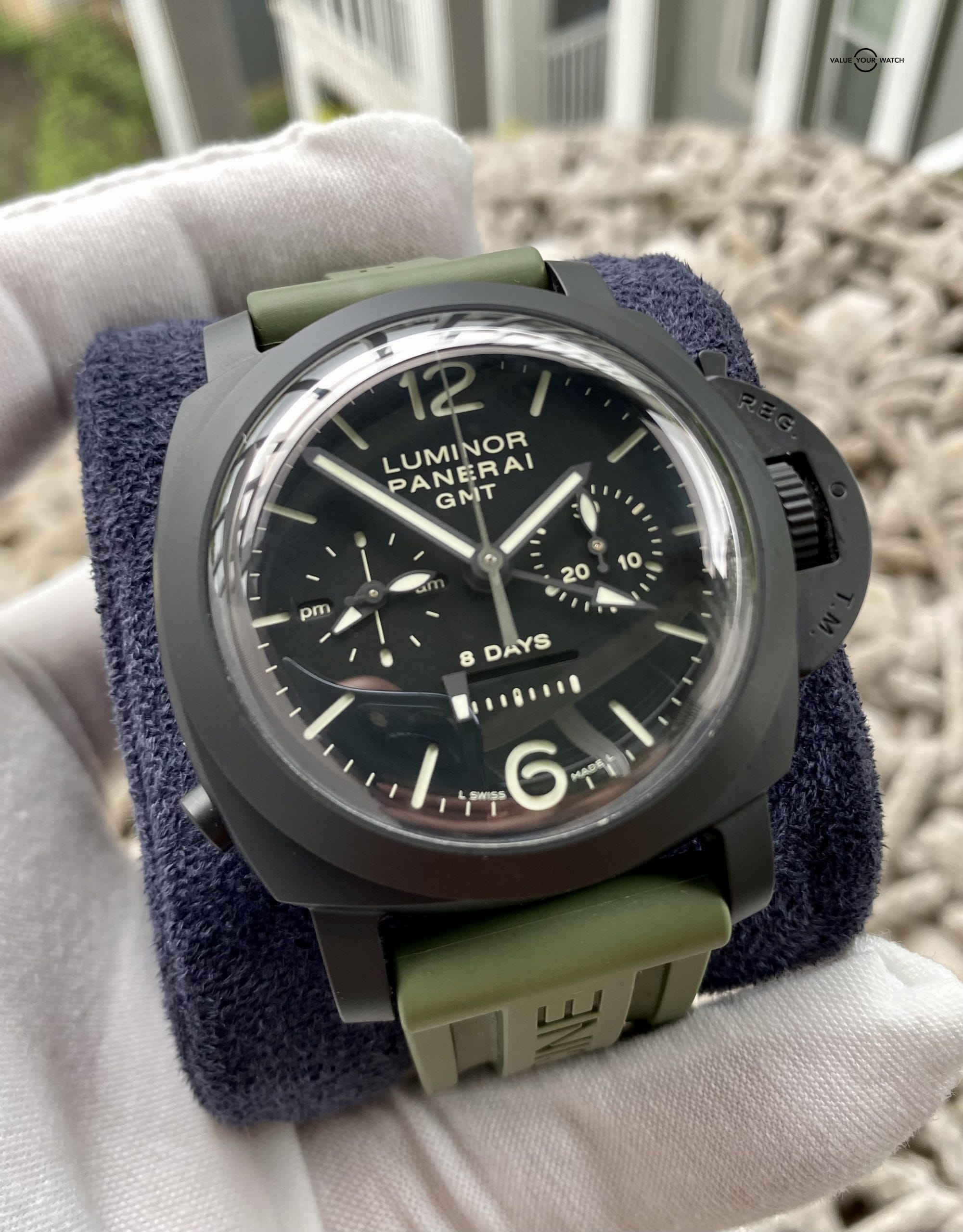 Overall, this timepiece is in fantastic shape, hardly any signs of wear on the case, crystal, or buckle. It’s black ceramic gives a stealthy militarist vibe while on the wrist, and is extremely wearable for a Panerai at 44mm. All functions operate as they should, and is running well on the timegrapher.