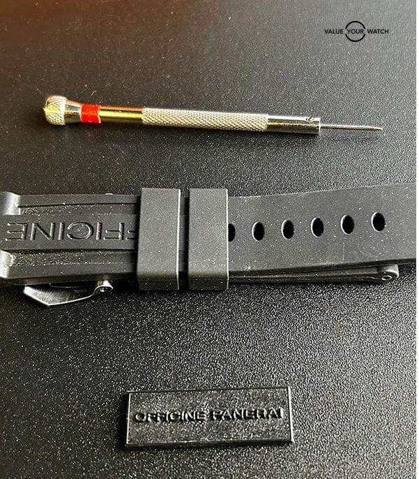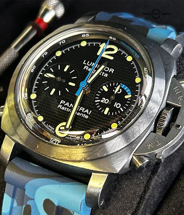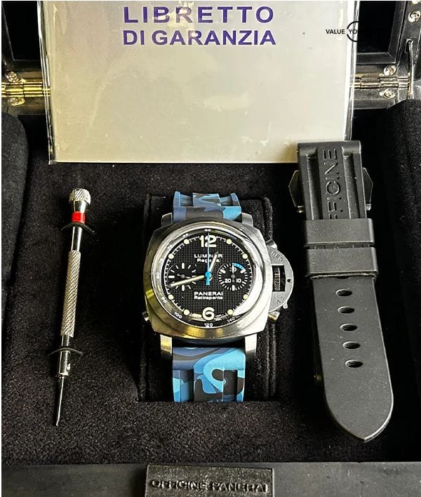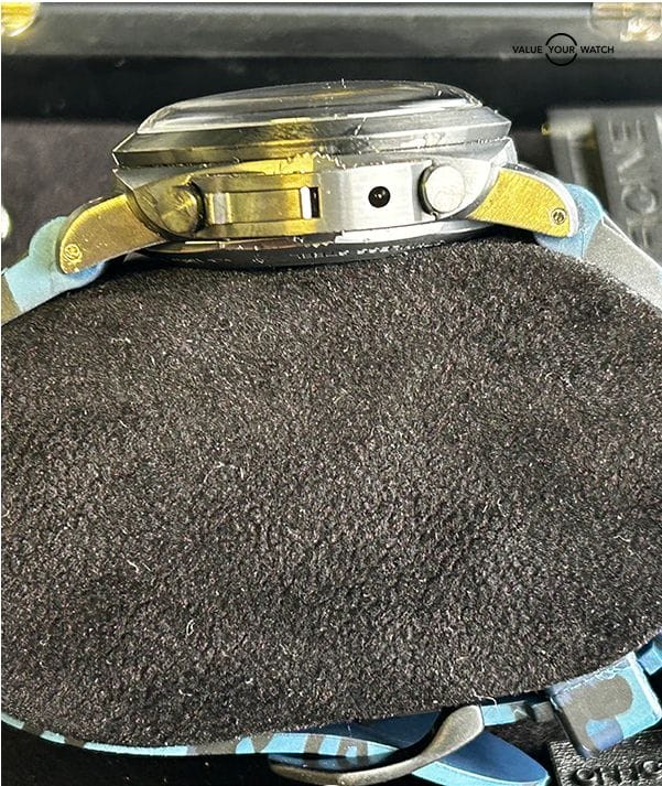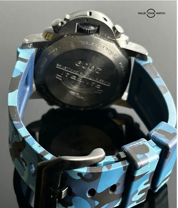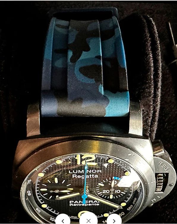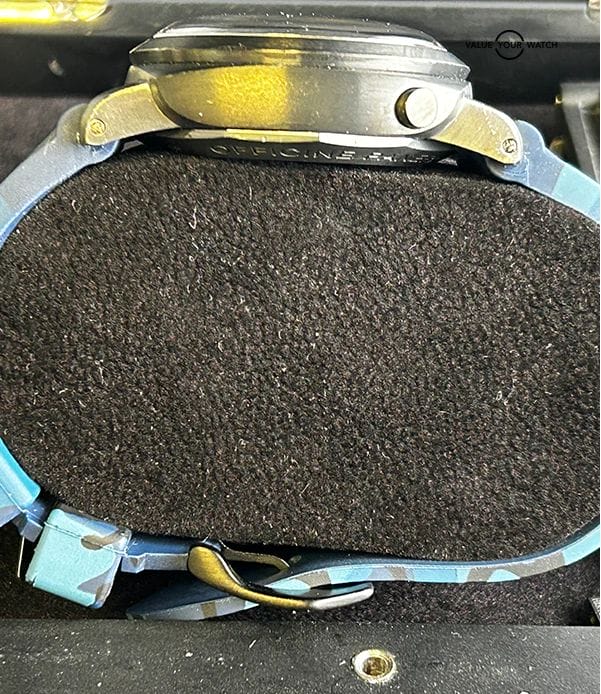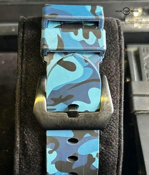 This model has a unique black textured Paris hobnail dial (found only on a few models) and the sub-second and large seconds hands are in Panerai’s “signature” blue which really pop with the camo blue strap that’s included. The original OP rubber strap is only been seldomly worn and also been included.