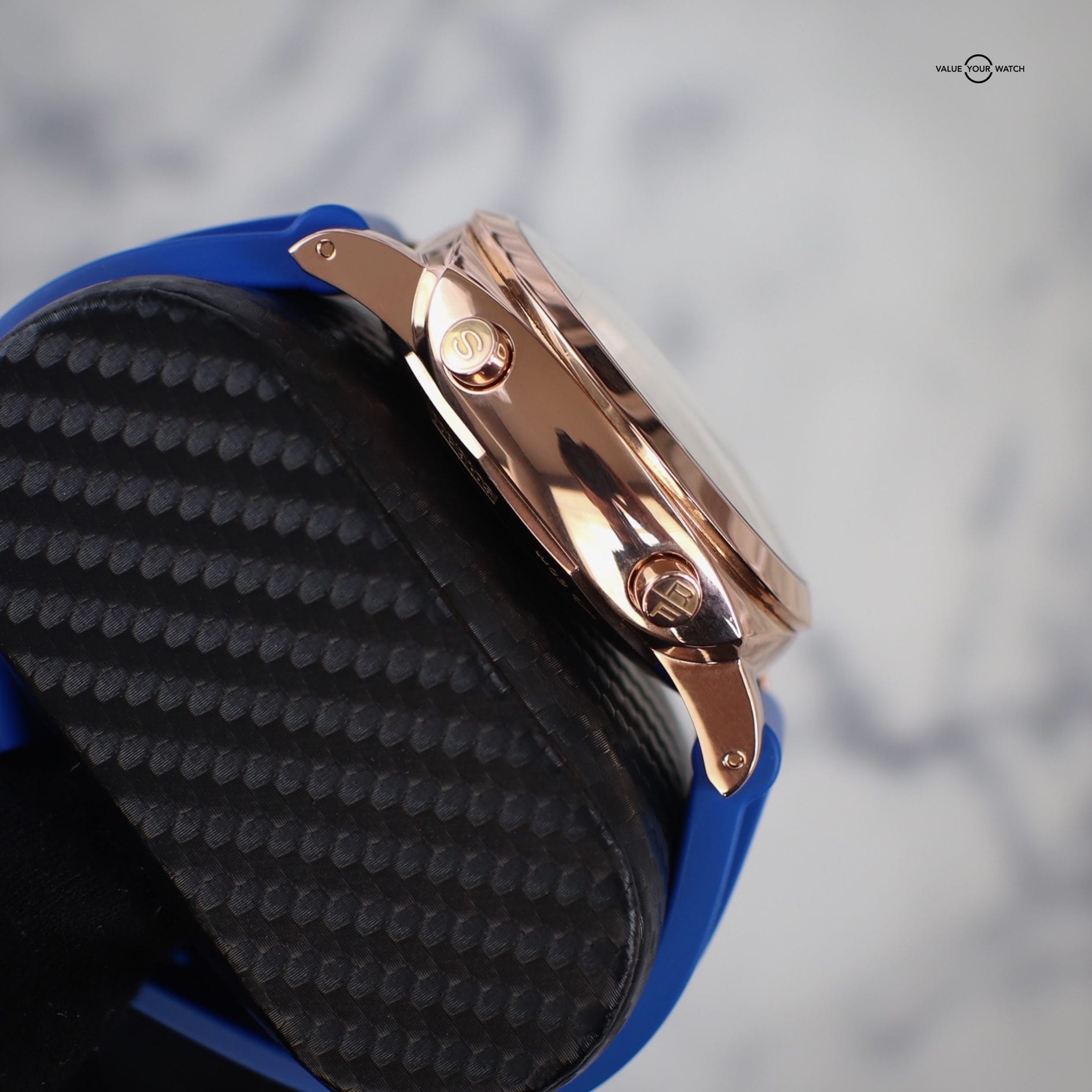 ✅ Condition: This watch is in EXCELLENT pre-owned condition with only some very minimal signs of wear. The crystal is flawless. The rose gold case and bezel are in excellent condition with very little signs of wear. The case back and buckle are in great condition. Both straps (blue and black rubber) are in like-new condition!