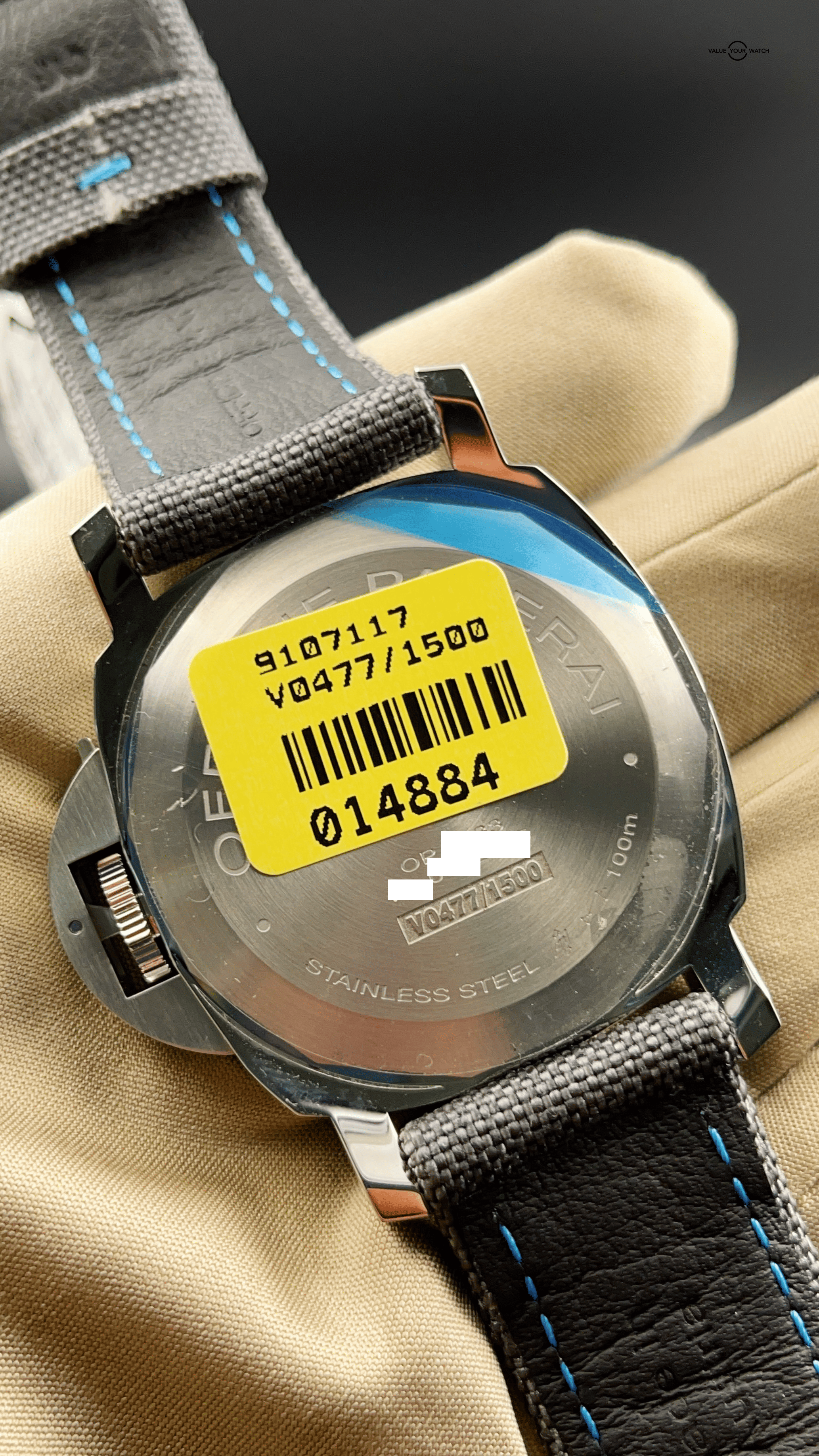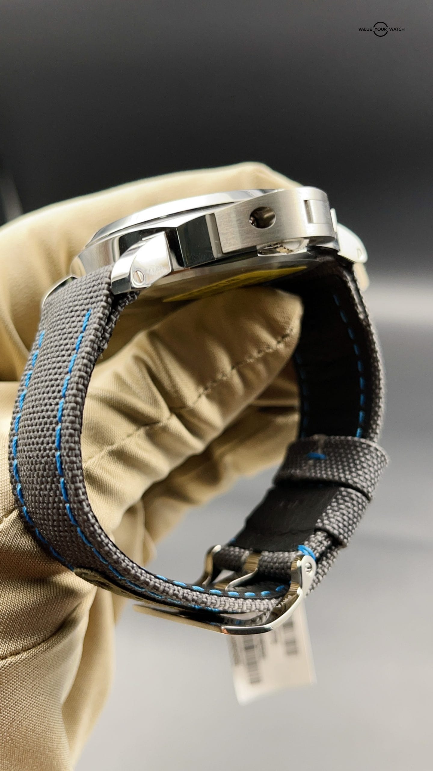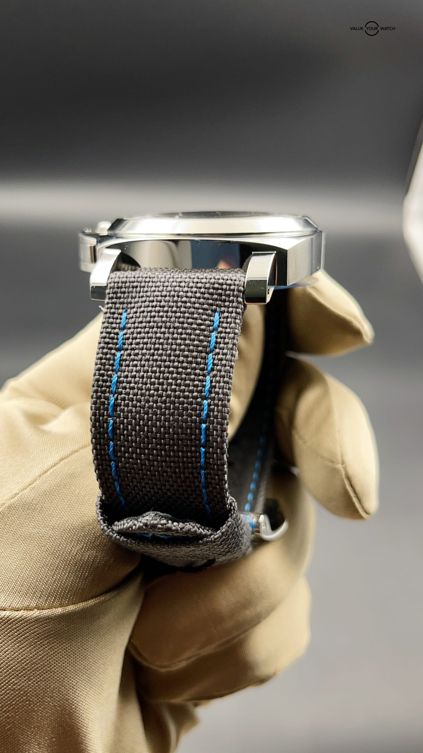 This special watch is made from brushed steel and has a nice canvas strap with blue stitching to match the blue on the dial of the watch. Panerai engineers pay attention to detail and of course have designed this watch to be reliable.