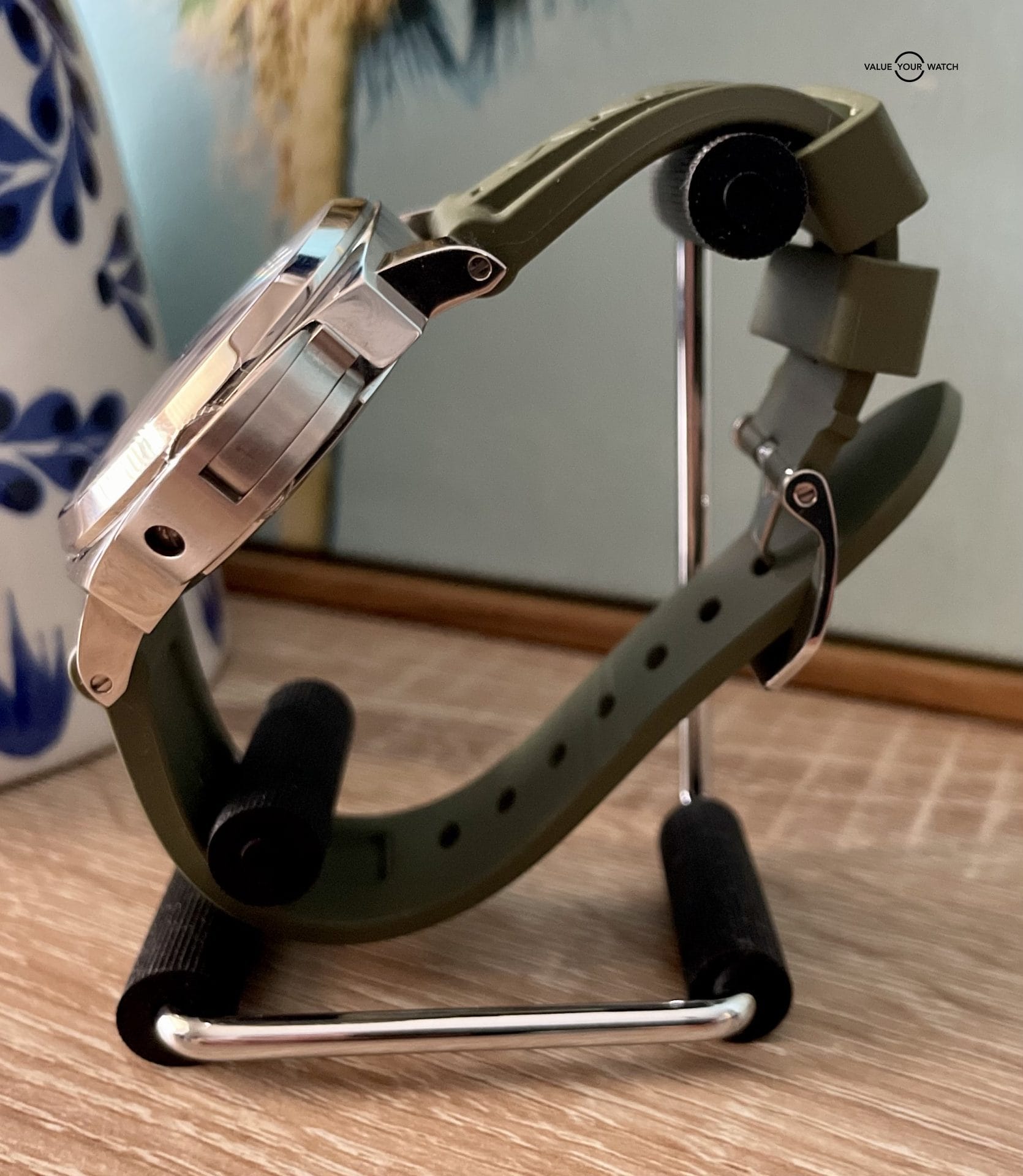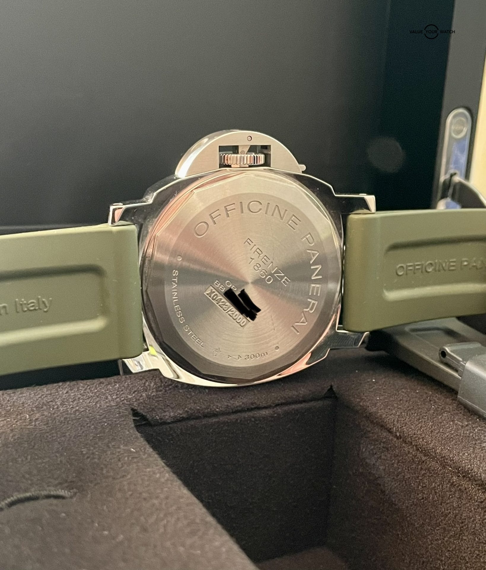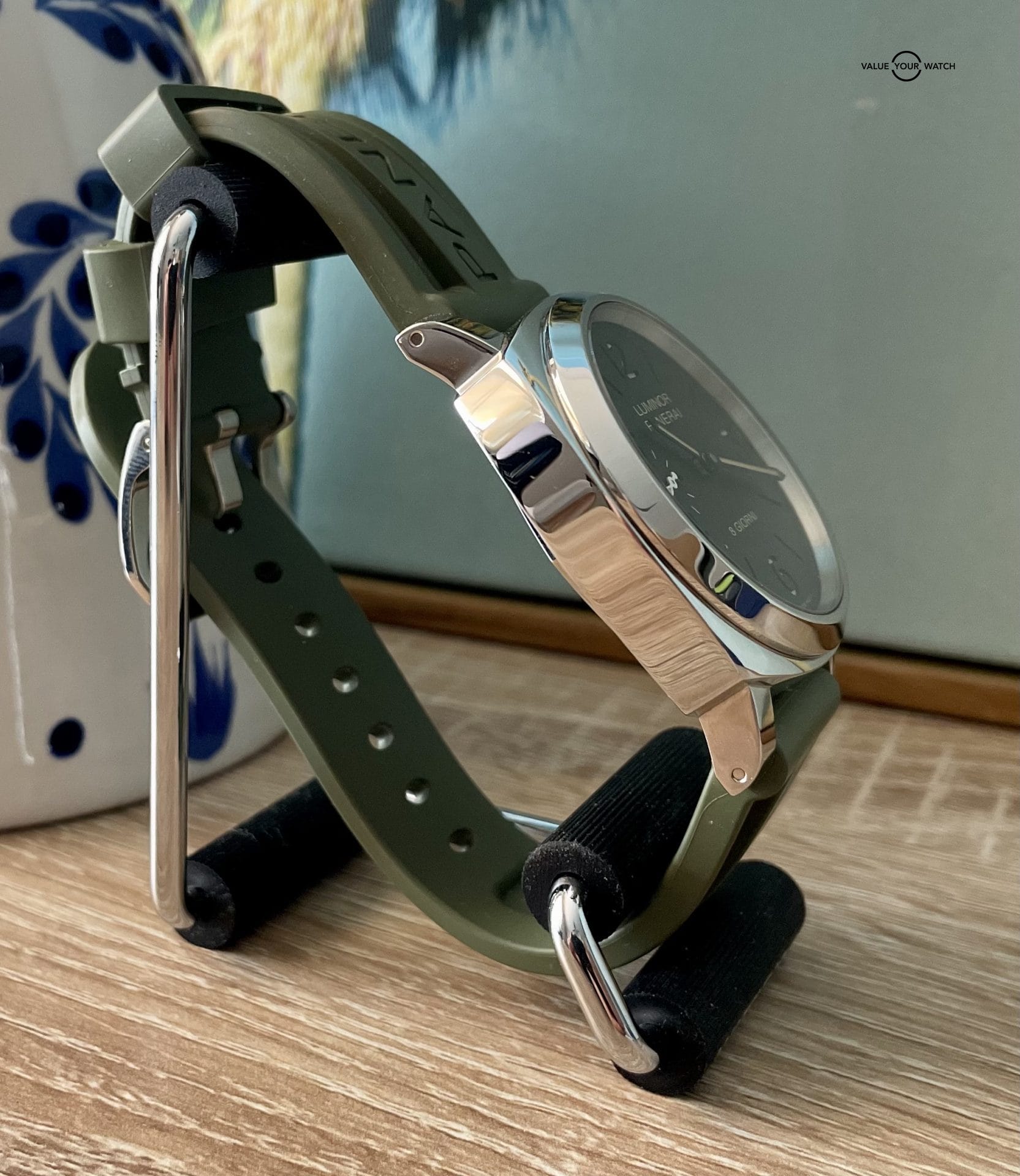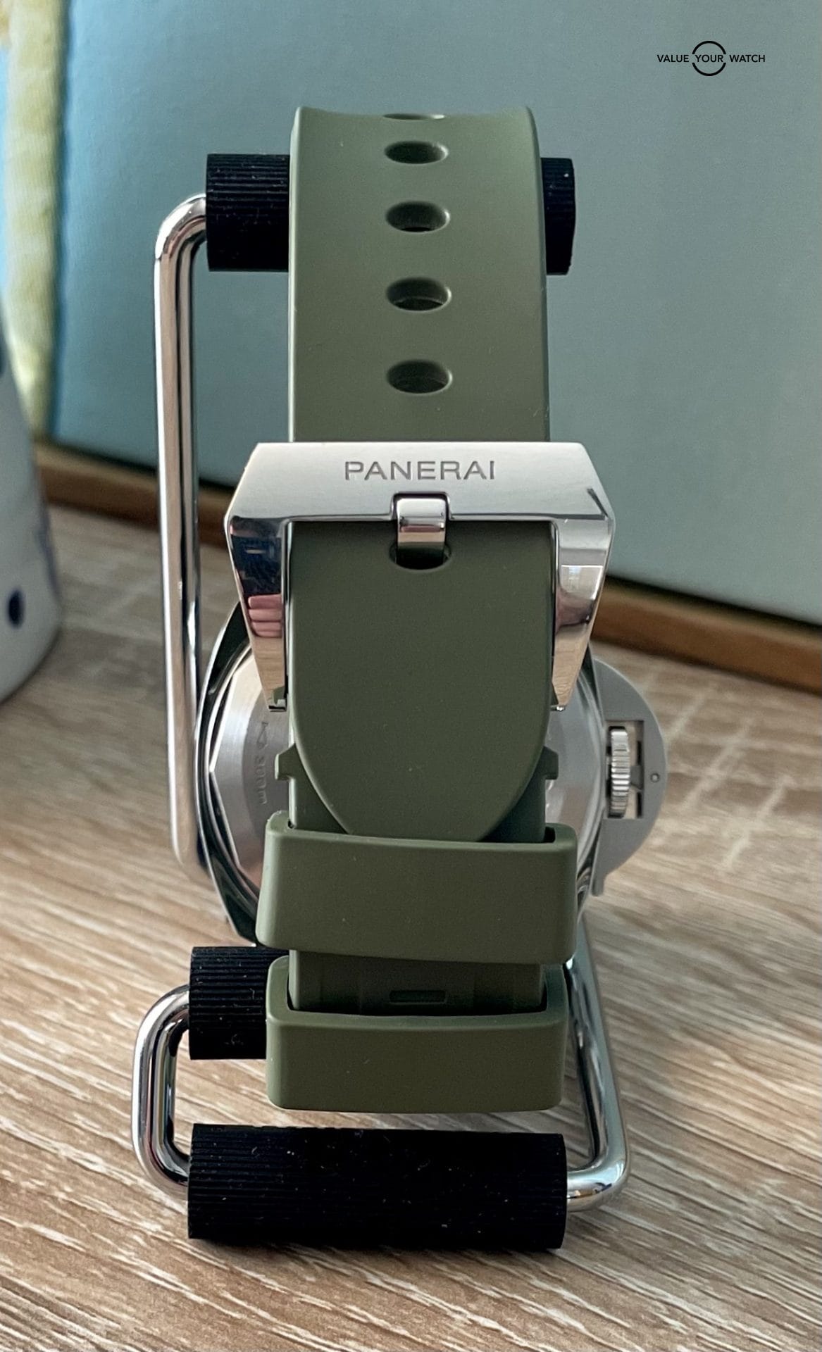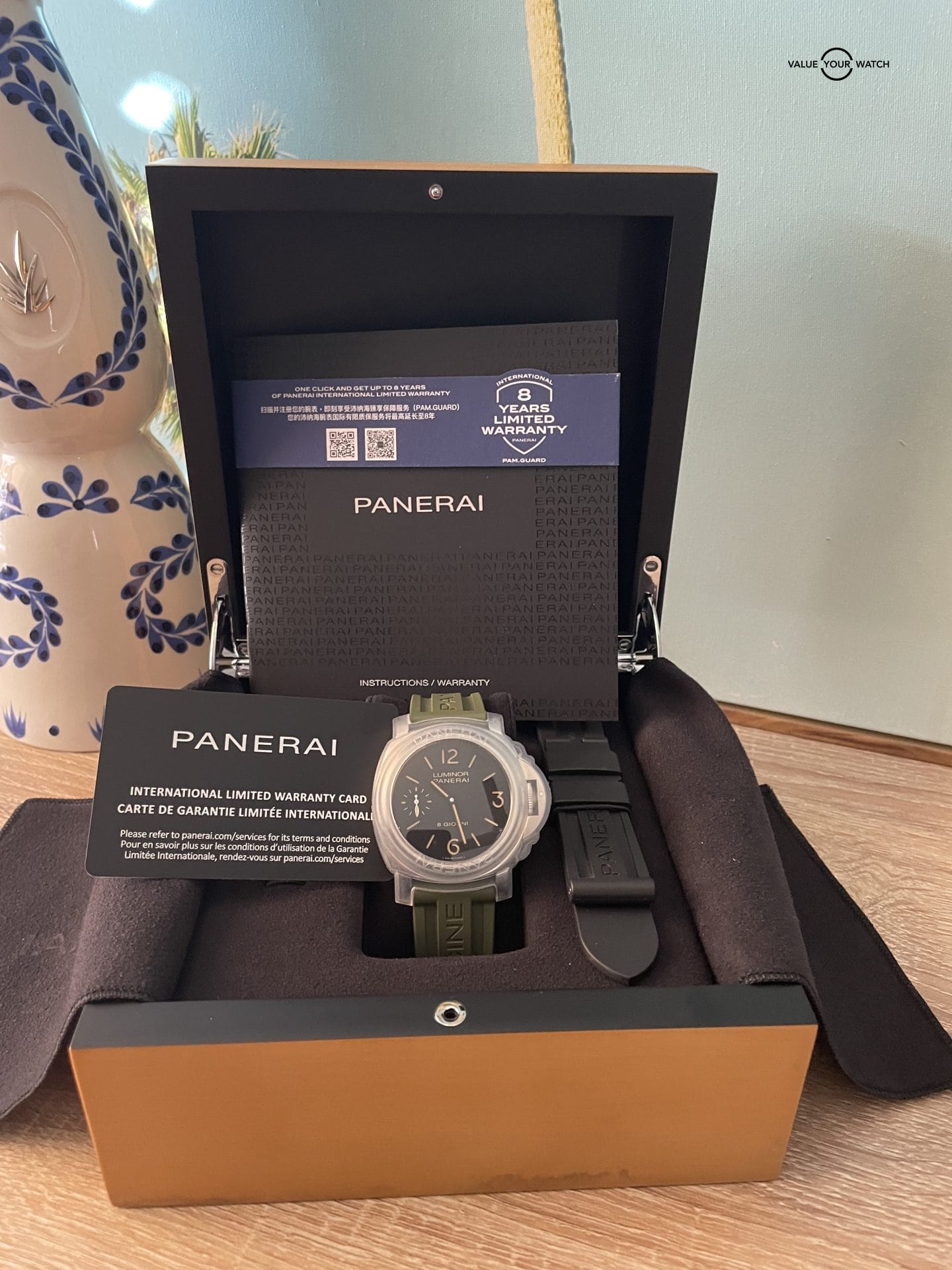 Included are the inner and outer boxes, green and black rubber OEM Panerai straps, booklet, warranty card (dated 12/22).