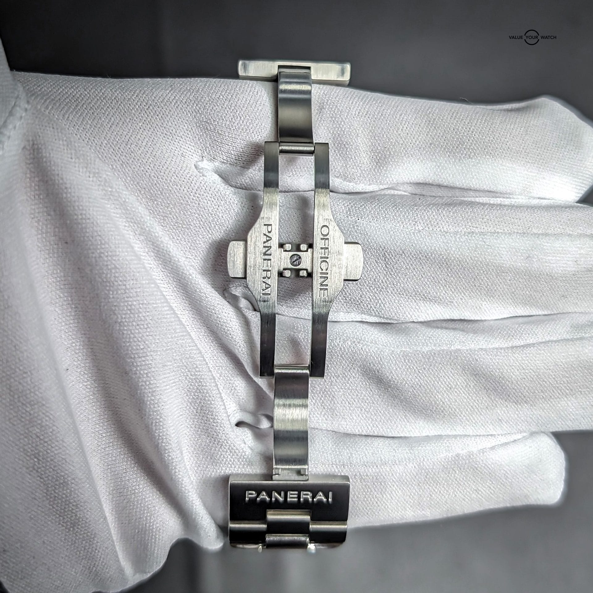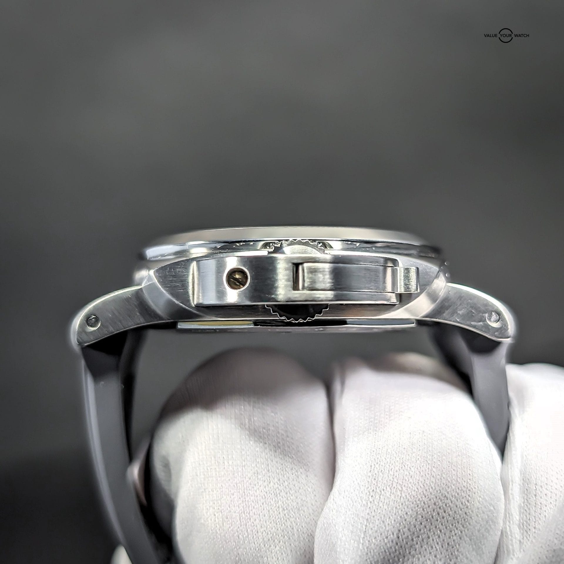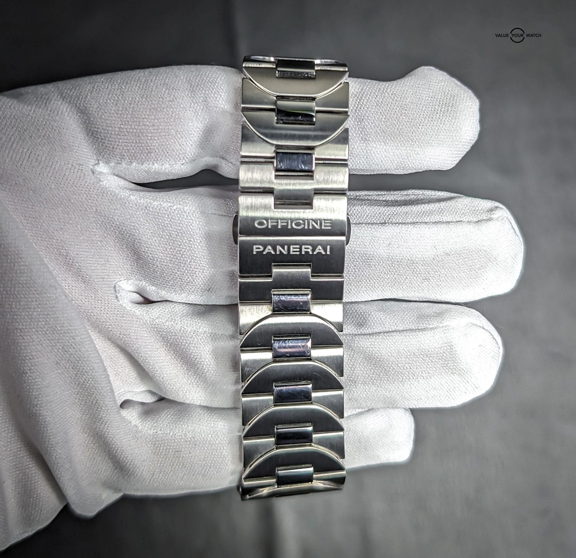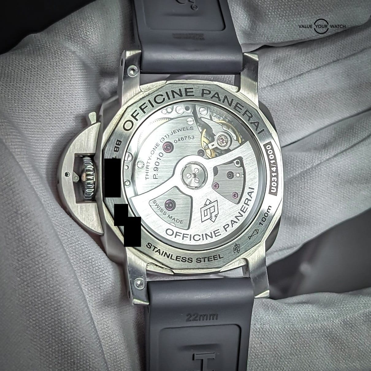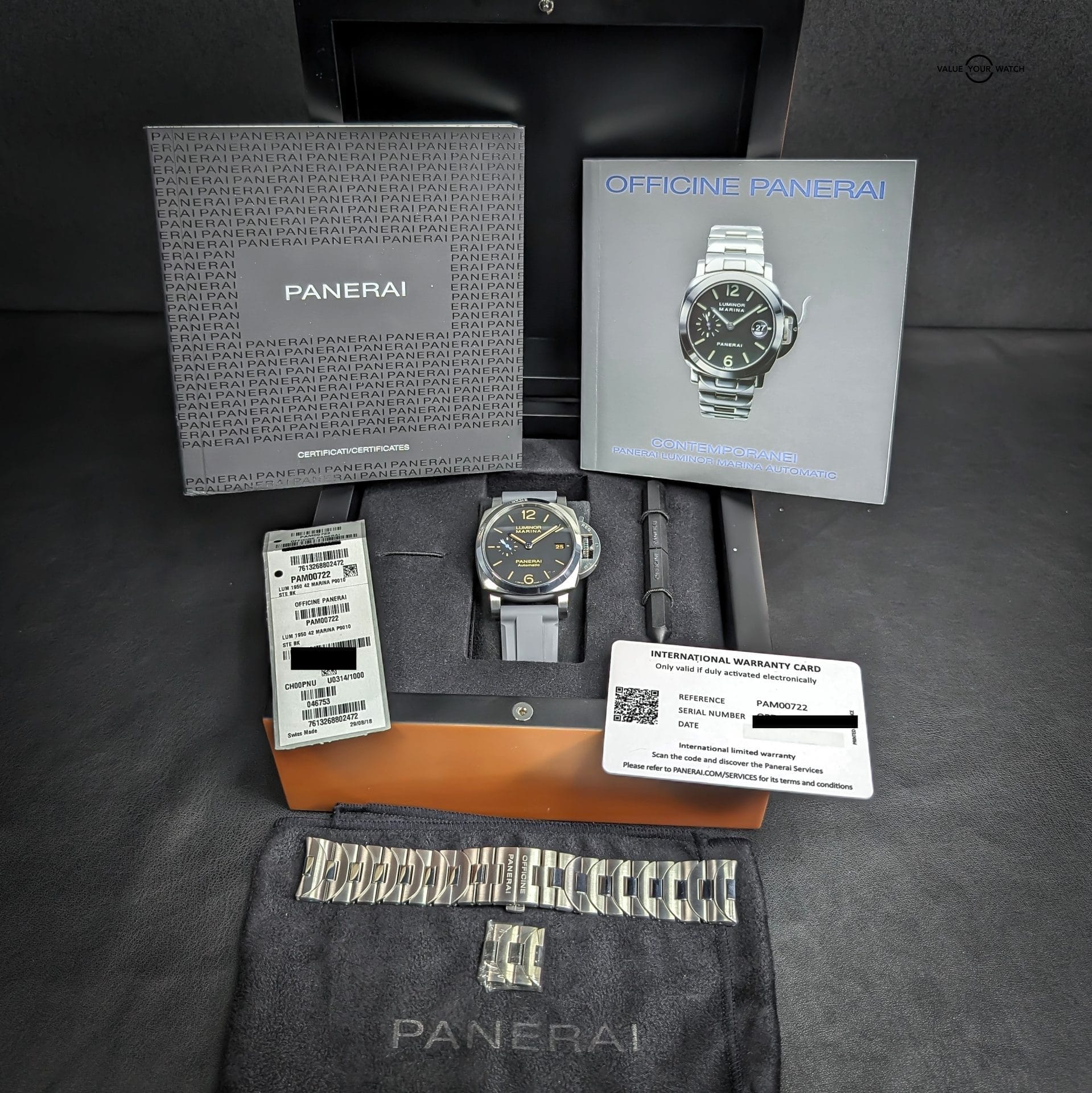 Comes with triple box, open card, manual, certificate book, purchase tags, extra links, tool, and Panerai inner box cloth, as well as the aforementioned 22mm width Horus grey rubber strap. You can swap back and forth between the bracelet and the strap with the included tool.