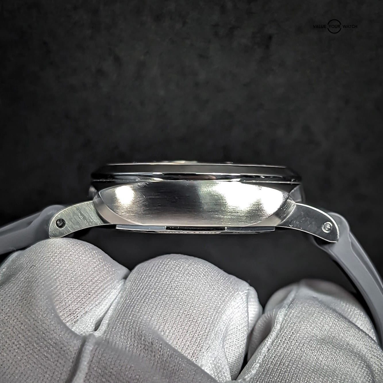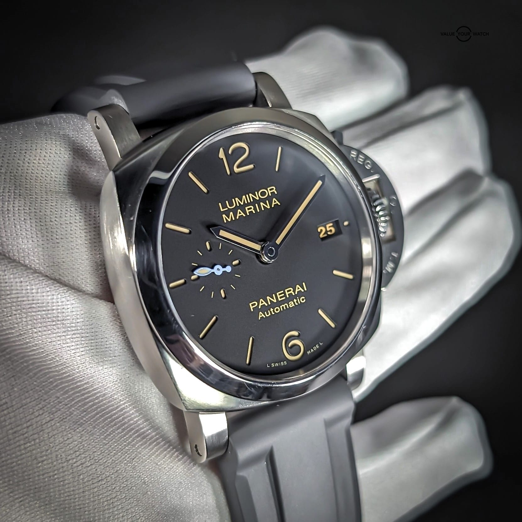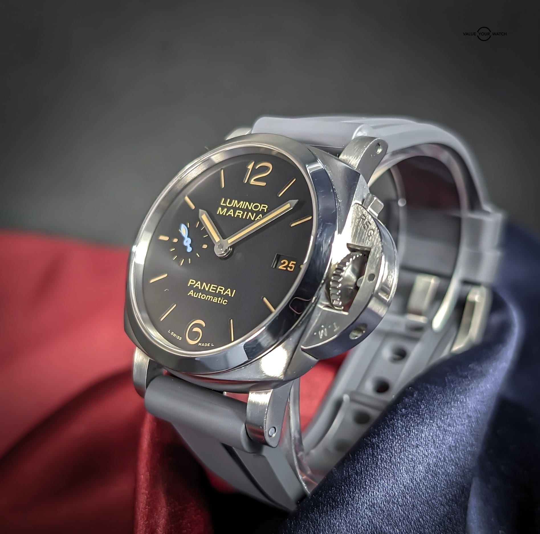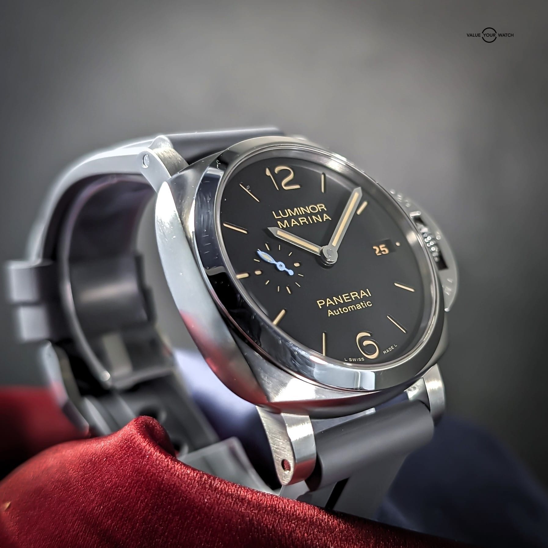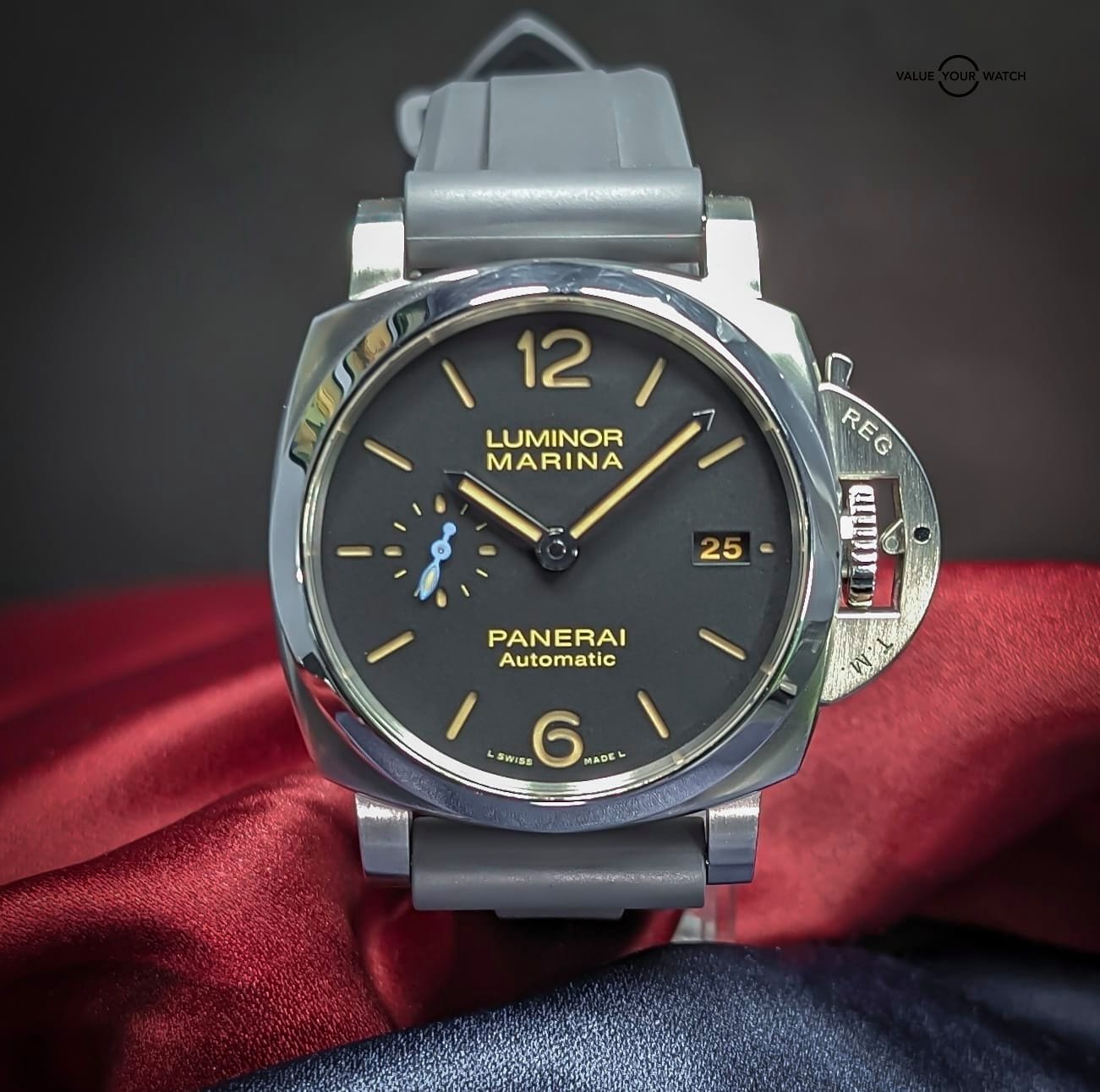 Comes with triple box, open card, manual, certificate book, purchase tags, extra links, tool, and Panerai inner box cloth, as well as the aforementioned 22mm width Horus grey rubber strap. You can swap back and forth between the bracelet and the strap with the included tool.