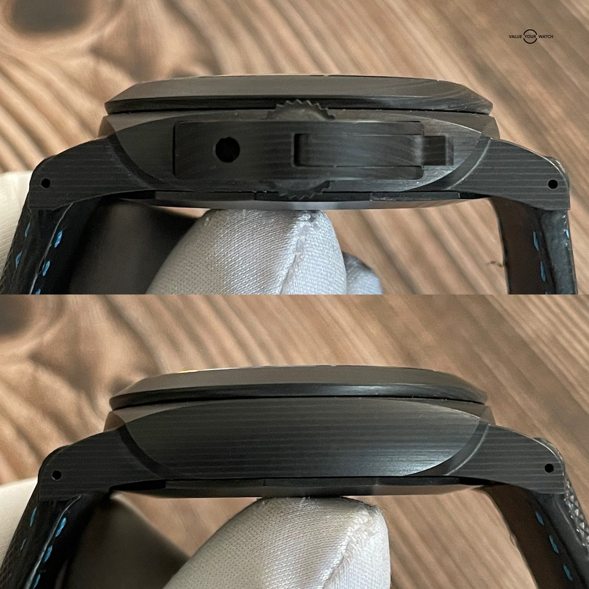 Watch is in great condition. Comes as a full set with box and papers, including warranty booklet and warranty card. Comes with two factory Panerai straps, one black leather/canvas with blue stitching and one black rubber. Also comes with an additional blue after-market rubber strap. This thing stays looking new due to the material used. Don’t miss your chance to get this incredible Carbotech Panerai Luminor!