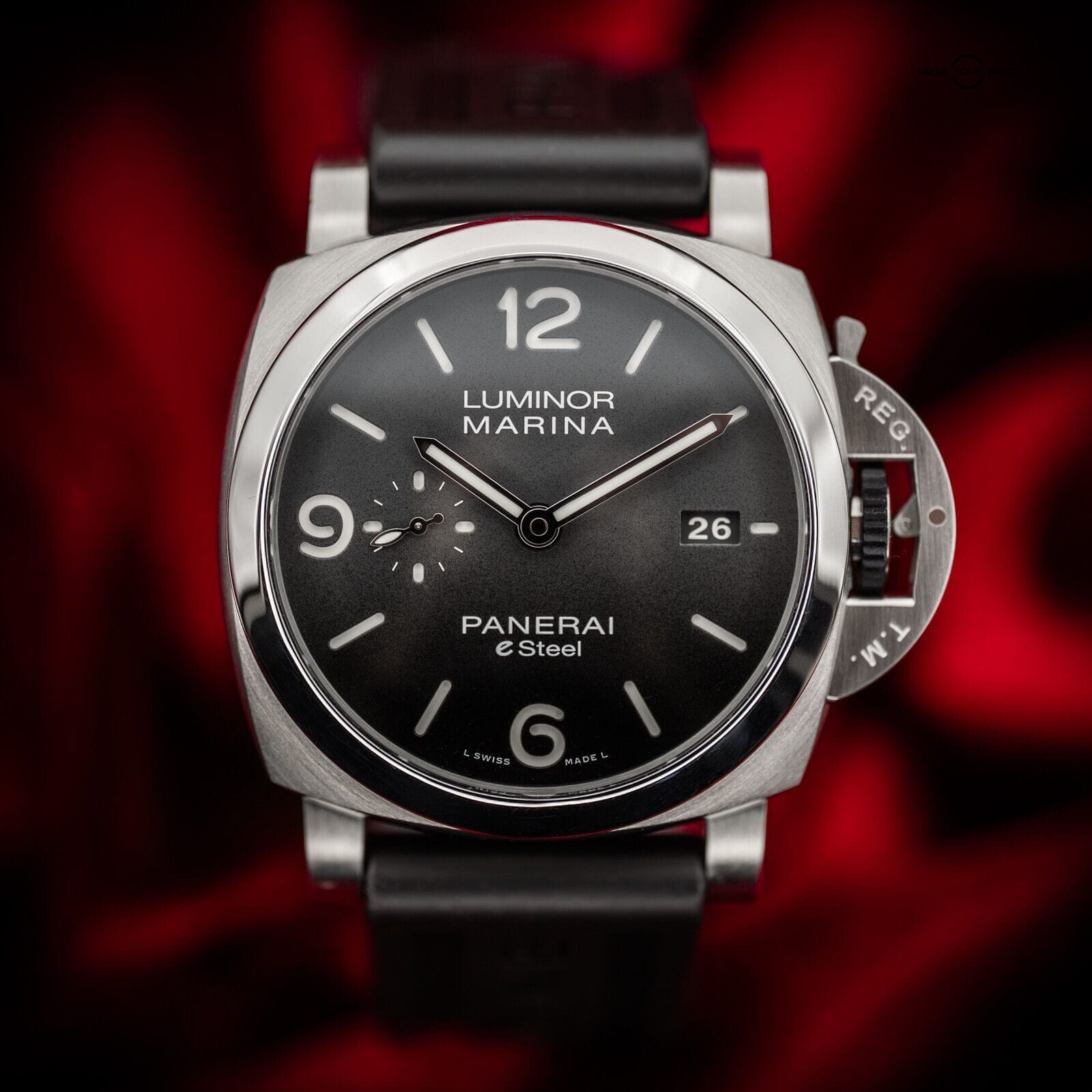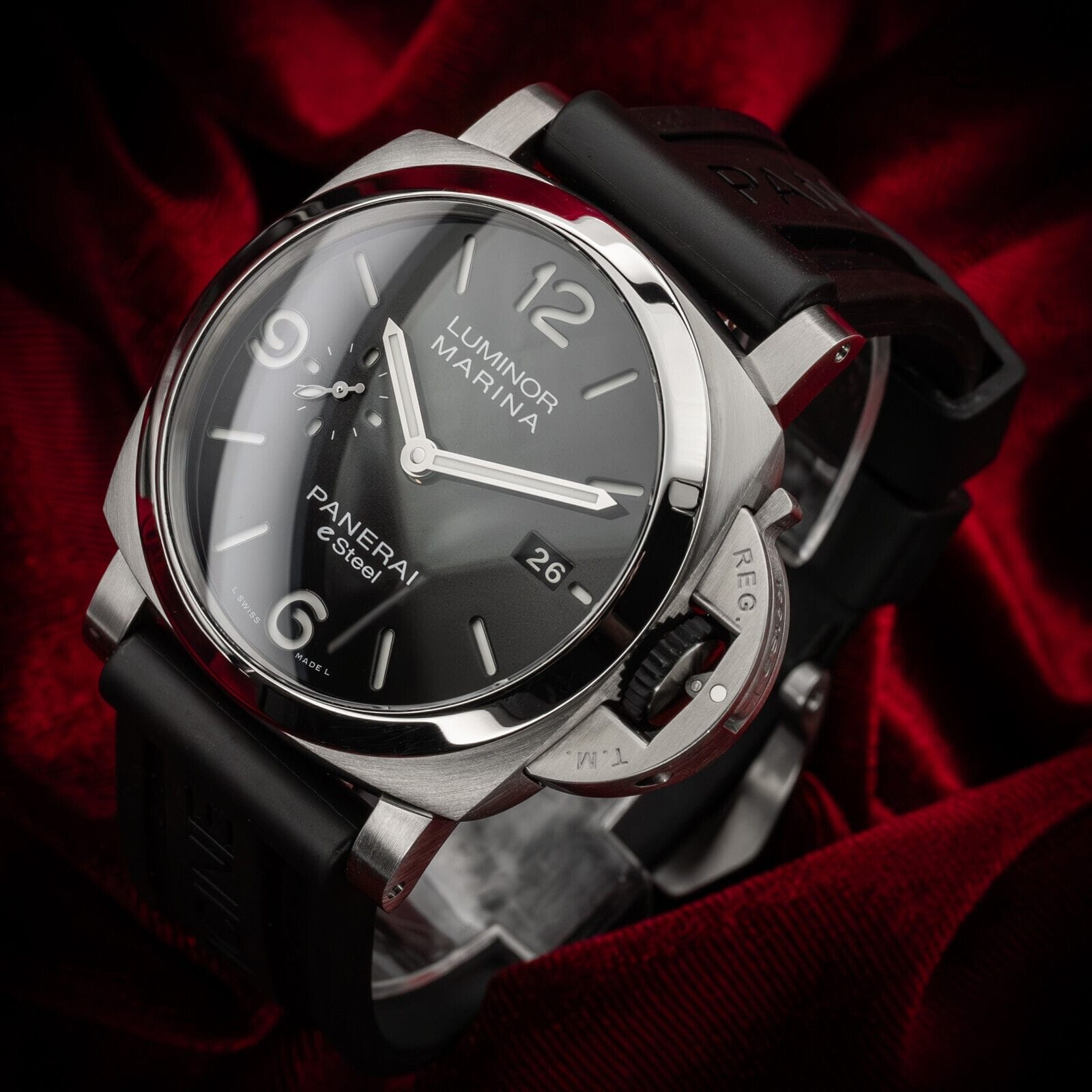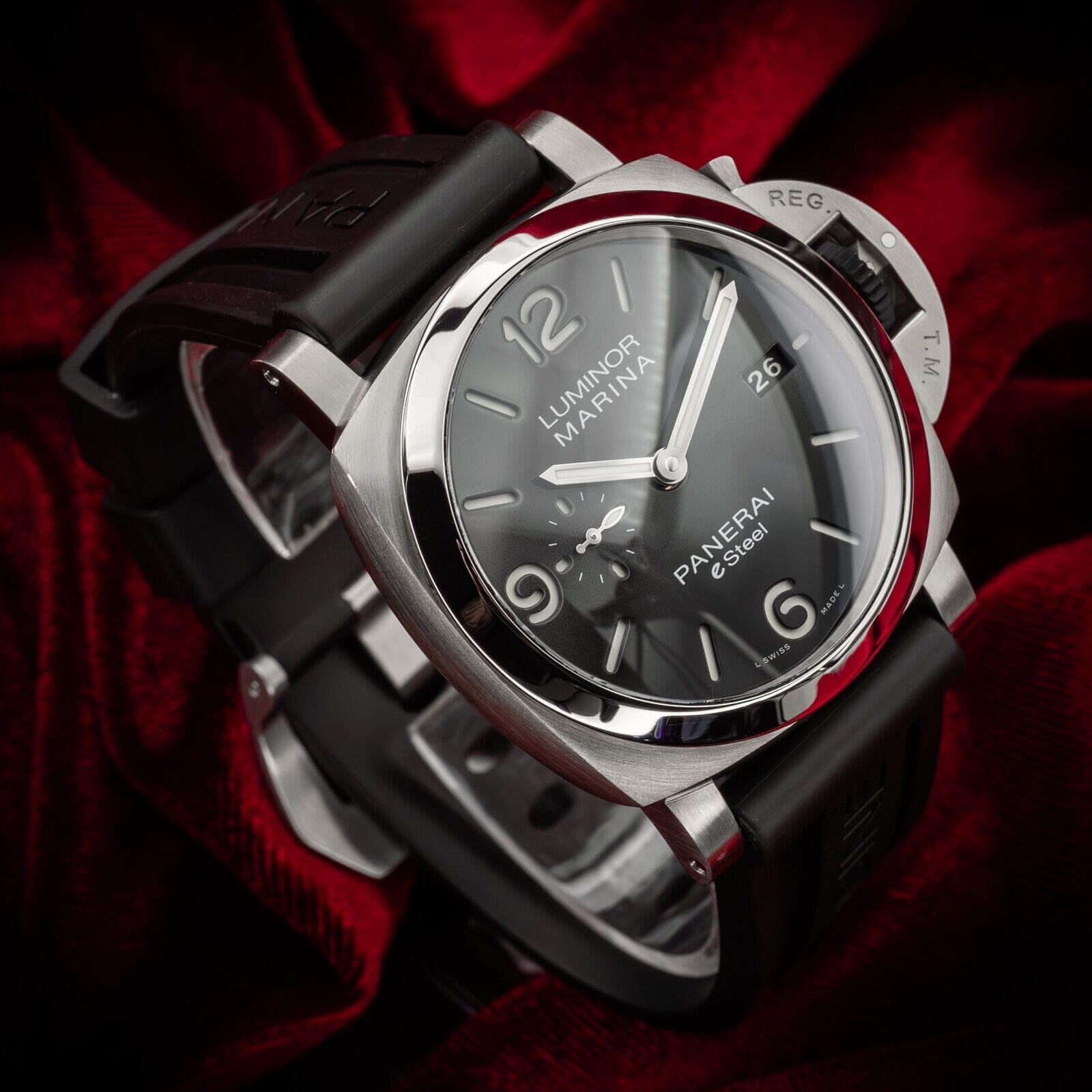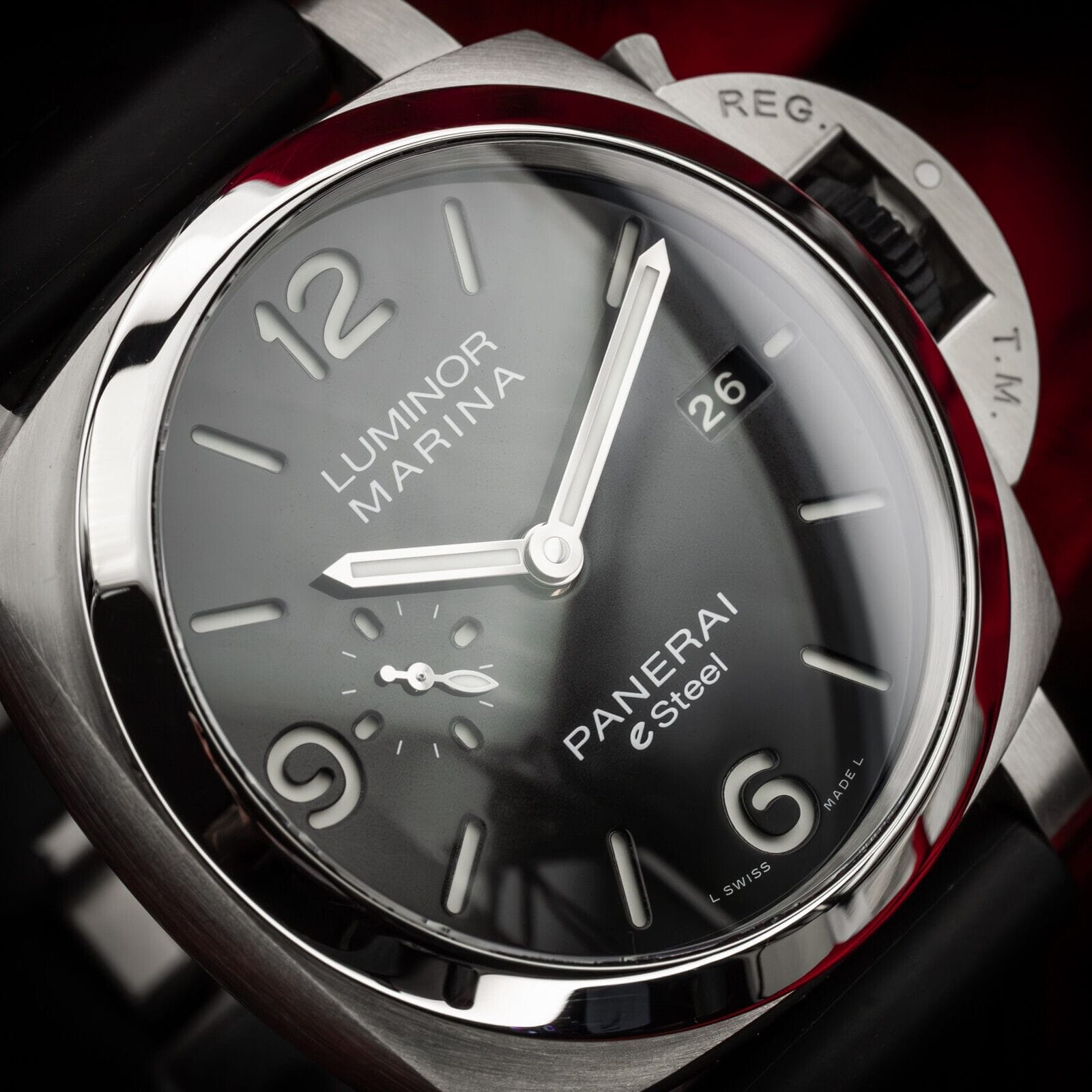 Crafted from ‘eSteel’, Panerai’s new environmentally conscious steel, this timepiece is as sturdy and stylish as ever. The anthracite grey gradient dial and polished steel case create a striking combination of blacks & greys.