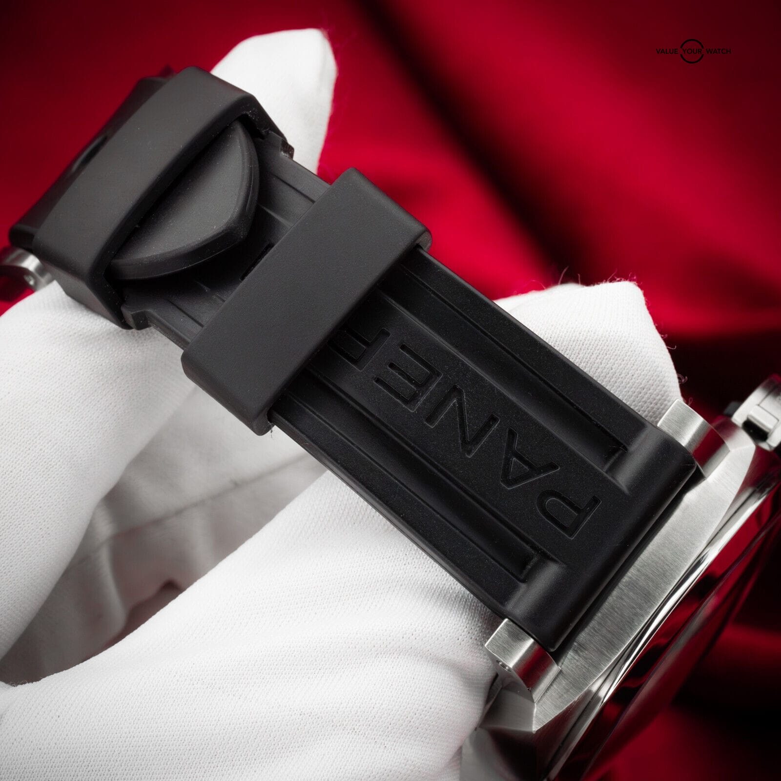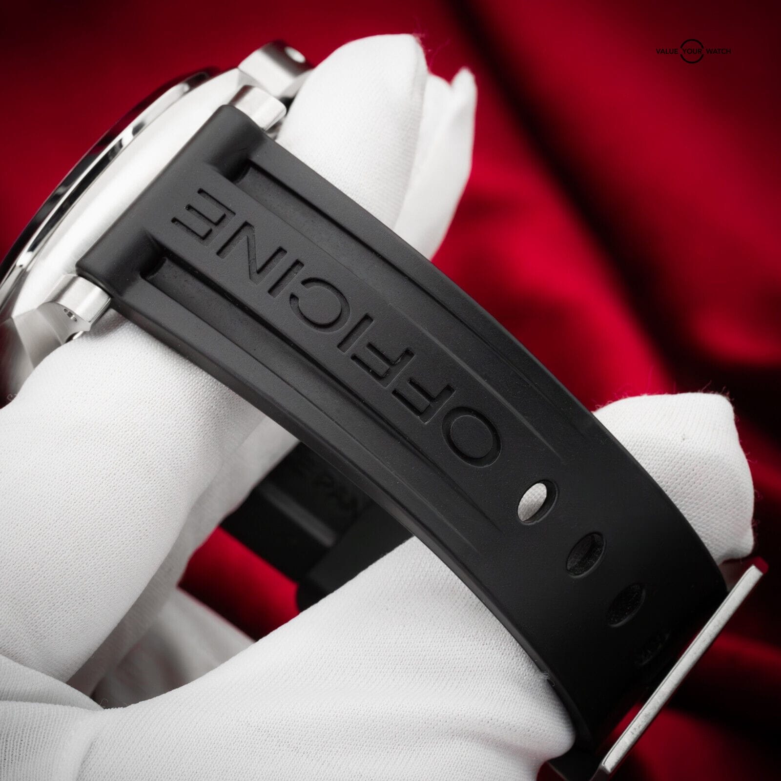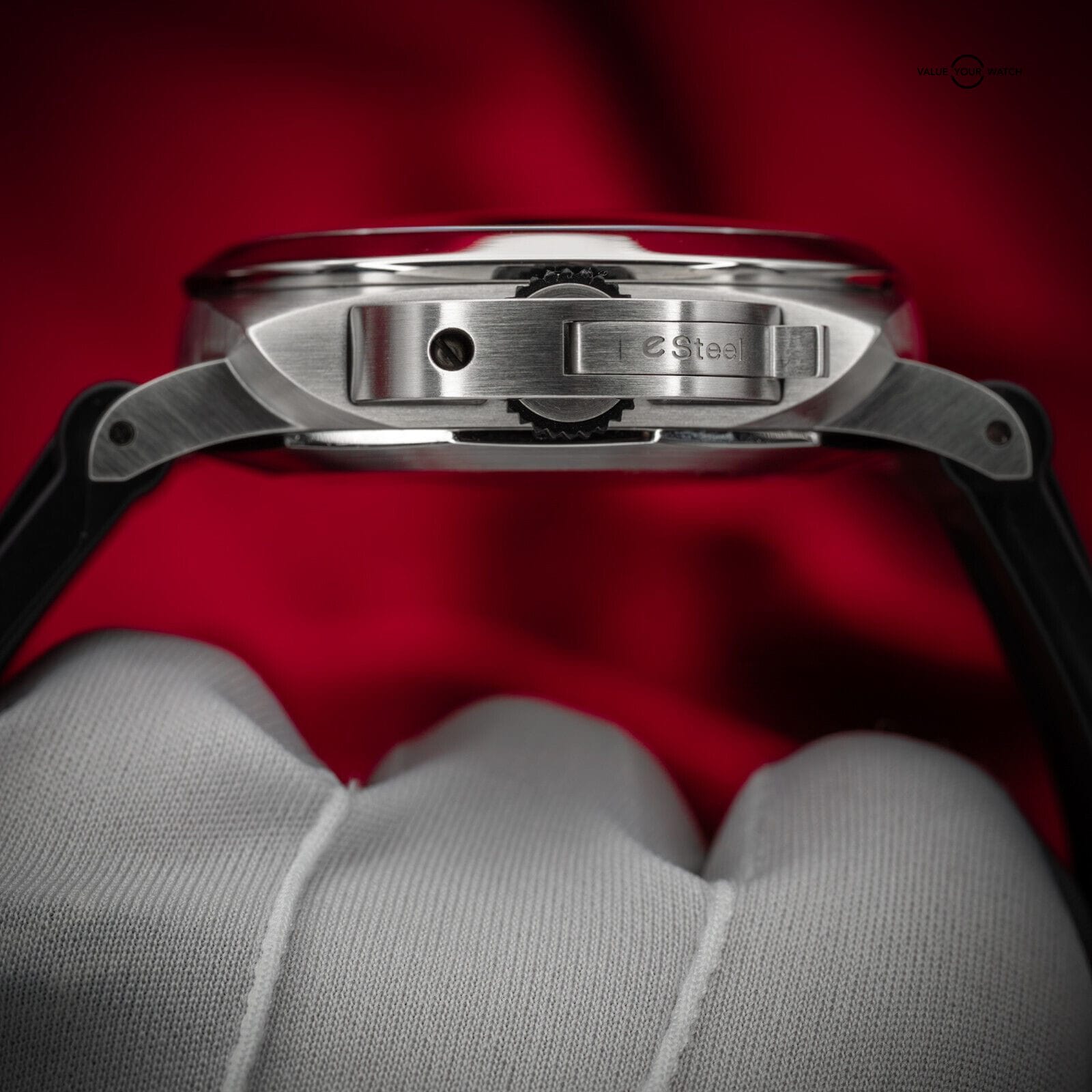 It comes as a complete set with the new style blue Panerai box, travel case, warranty card, strap changing tools, instruction booklet, black rubber strap, and an extra green textile strap in unworn condition. The 8 year warranty will be valid until the year 2031.