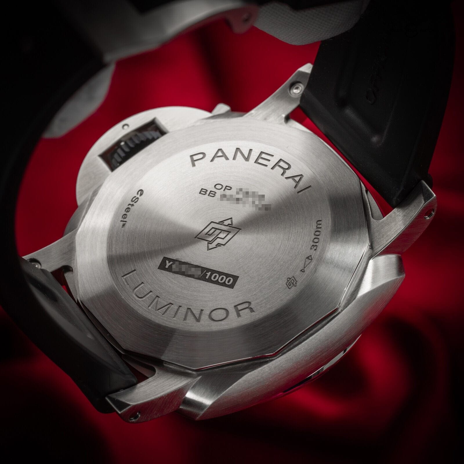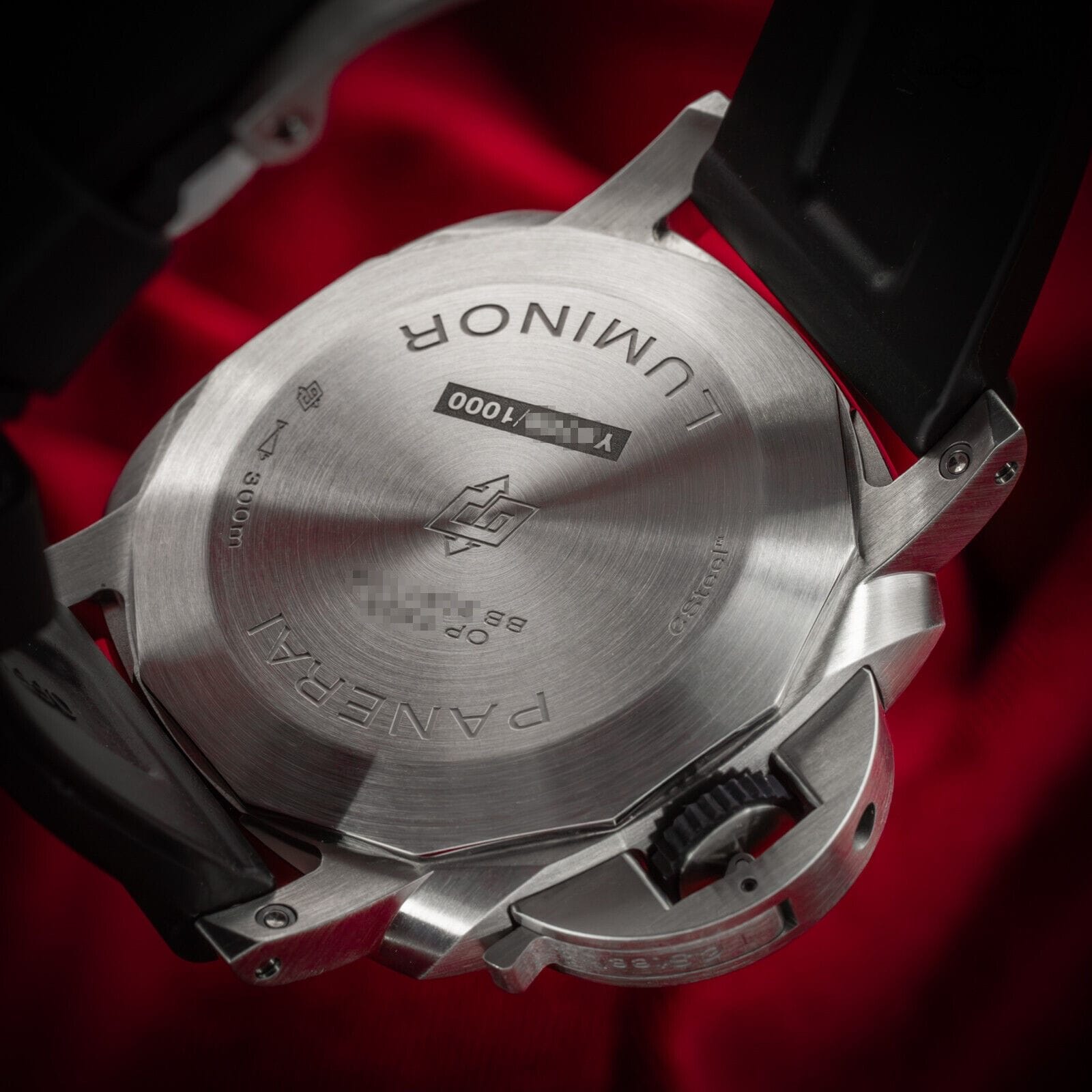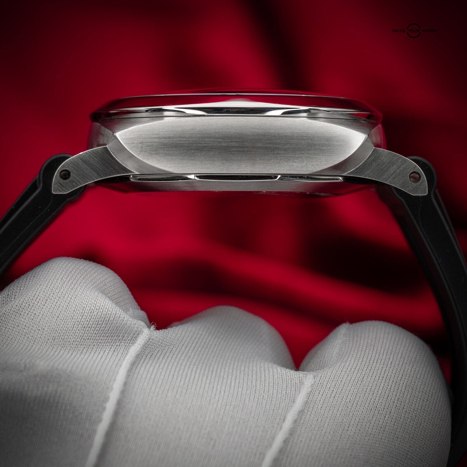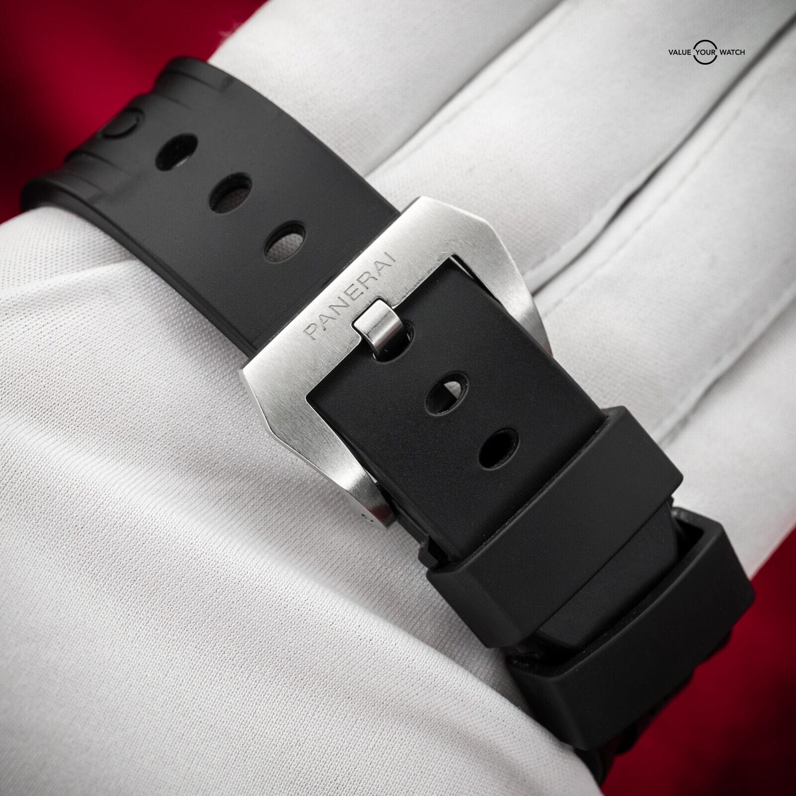 It comes as a complete set with the new style blue Panerai box, travel case, warranty card, strap changing tools, instruction booklet, black rubber strap, and an extra green textile strap in unworn condition. The 8 year warranty will be valid until the year 2031.