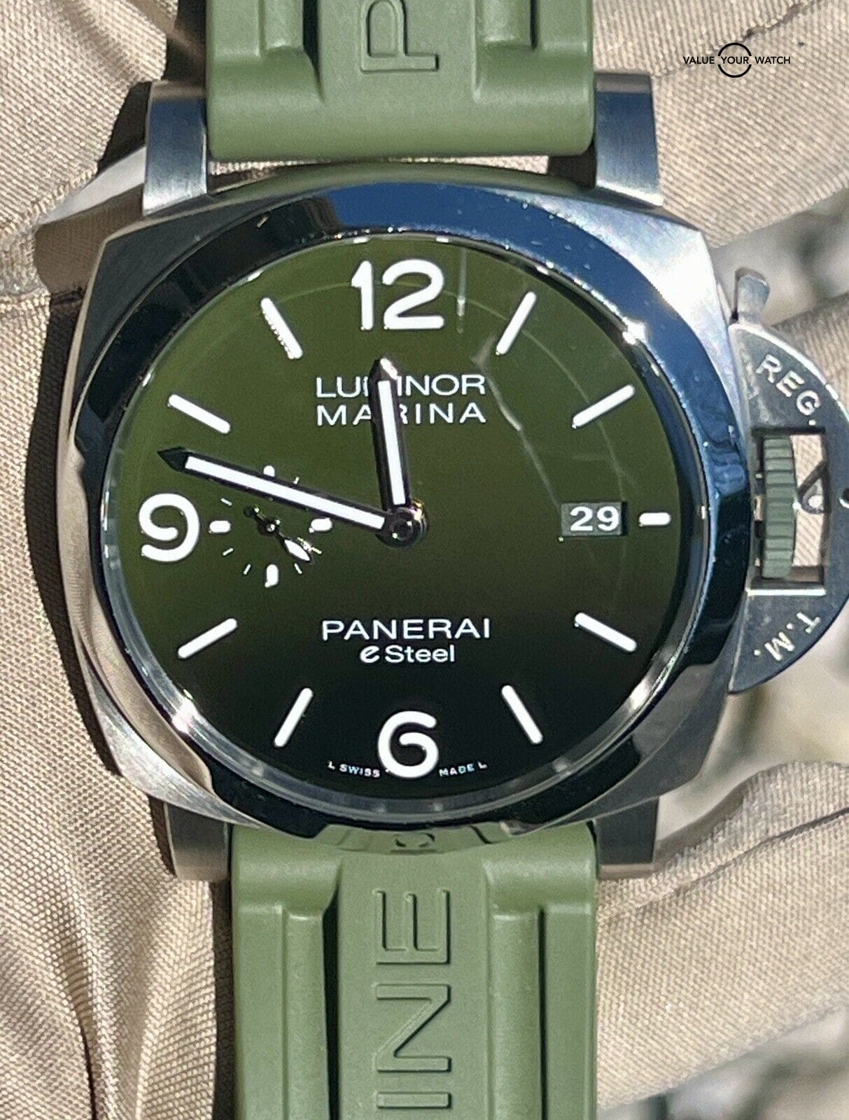 Pre-Owned Panerai Luminor Marine Verde Smeraldo (PAM01356) self – winding automatic watch, features a 44mm eSteel case surrounding a green dial on a recycled PET green textile strap with an eSteel tang buckle. Functions include hours, minutes, small seconds and date. This watch comes complete with the original box, papers, extra factory strap and purchase receipt dated March 2024. Under factory warranty with Panerai.