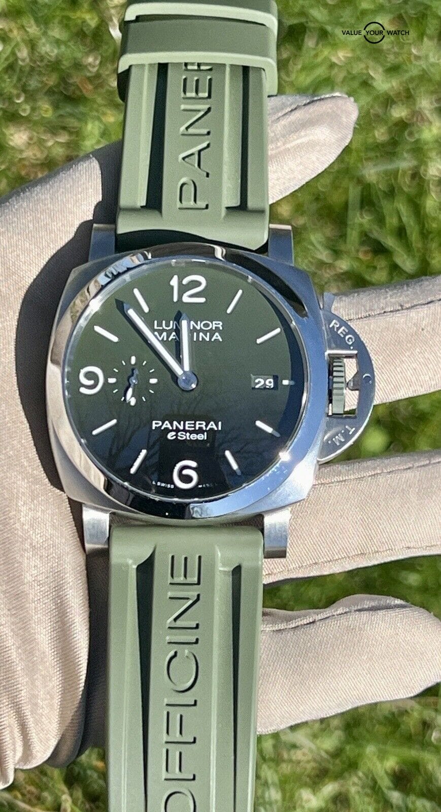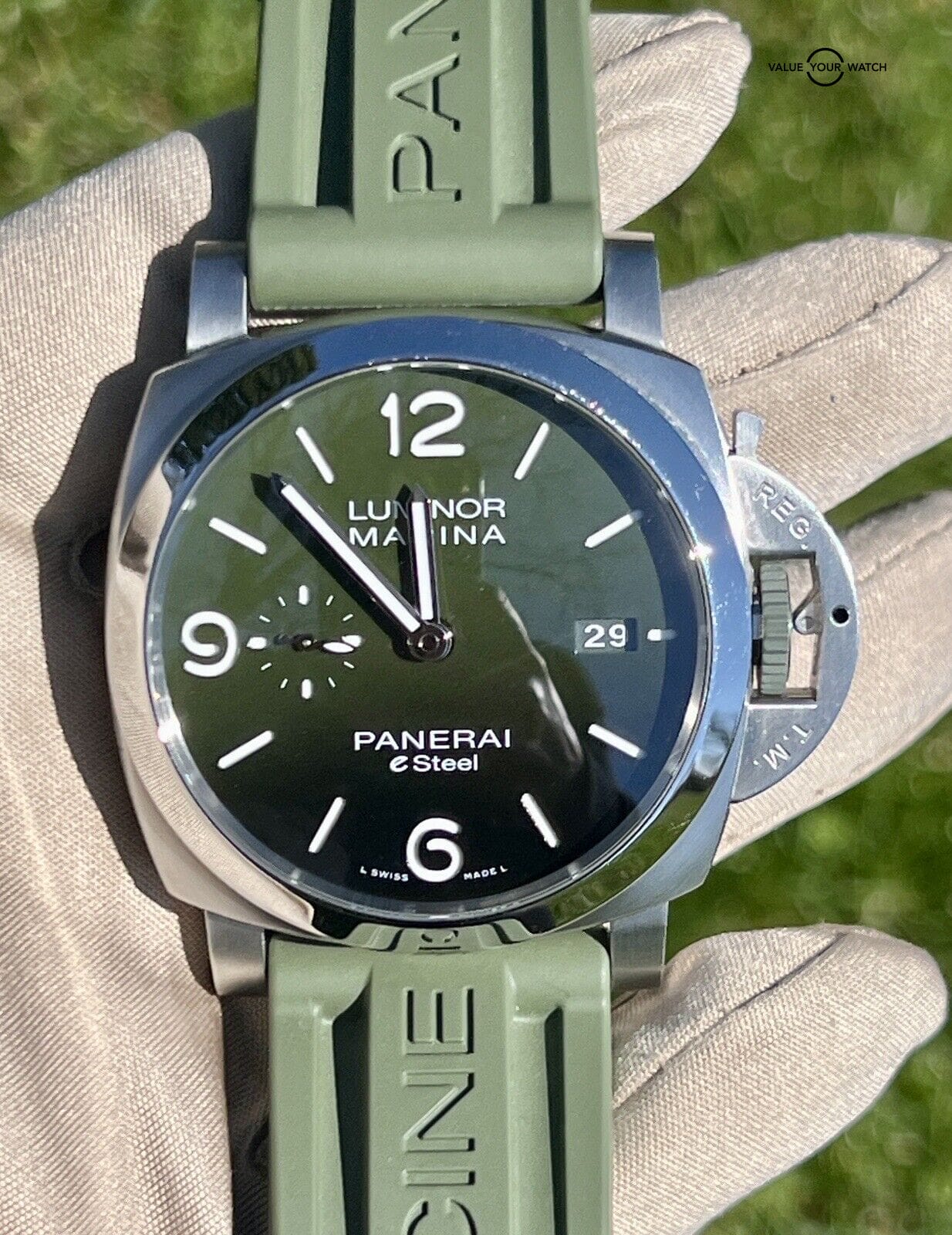 Pre-Owned Panerai Luminor Marine Verde Smeraldo (PAM01356) self – winding automatic watch, features a 44mm eSteel case surrounding a green dial on a recycled PET green textile strap with an eSteel tang buckle. Functions include hours, minutes, small seconds and date. This watch comes complete with the original box, papers, extra factory strap and purchase receipt dated March 2024. Under factory warranty with Panerai.