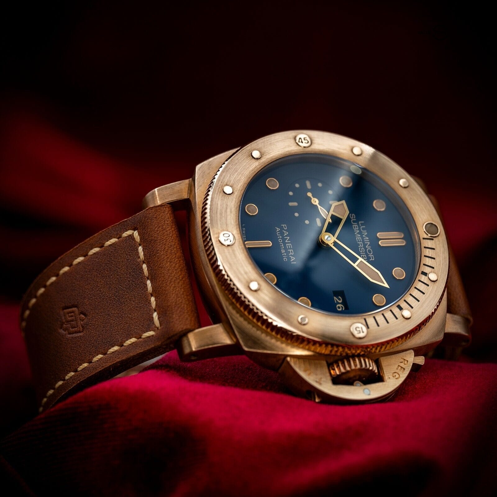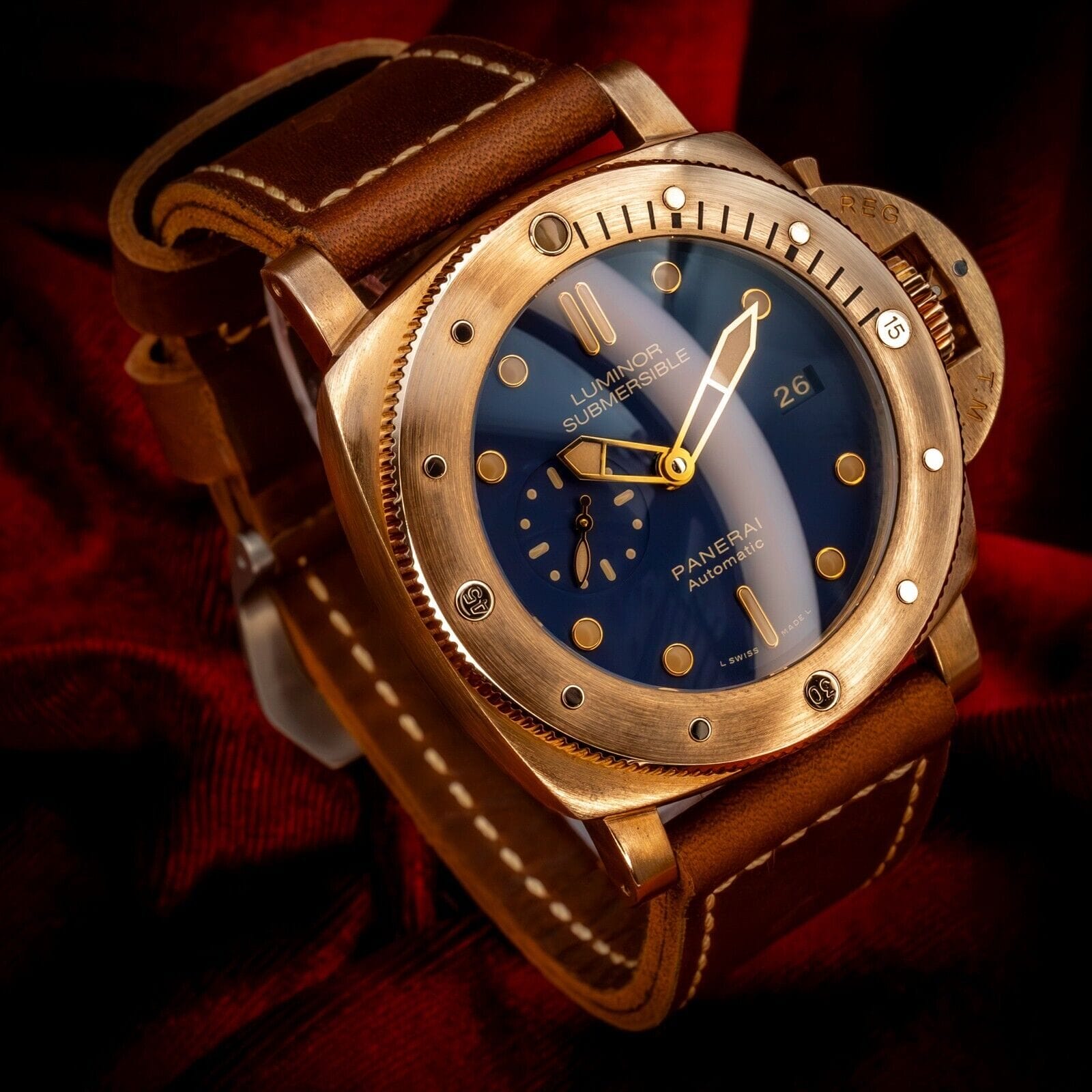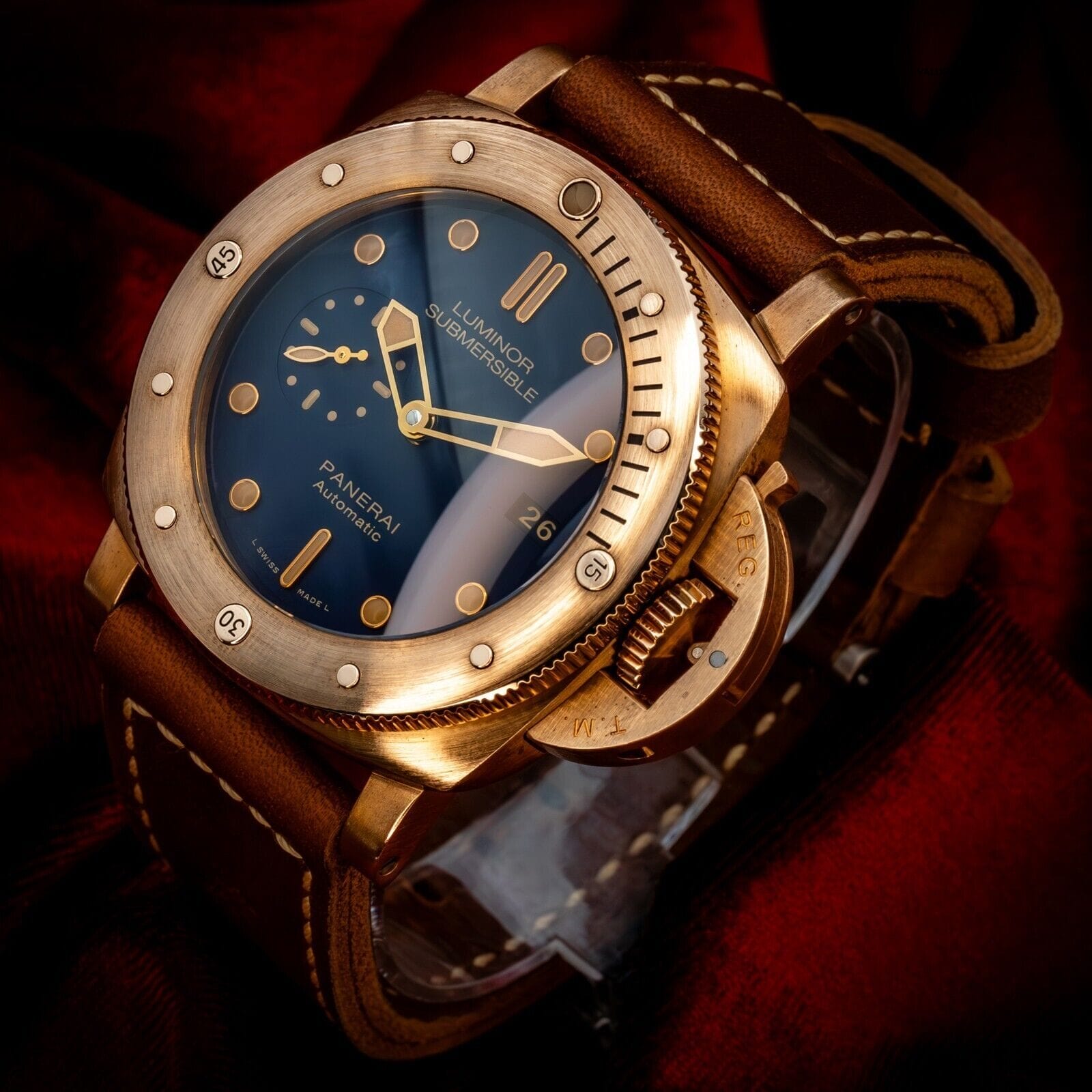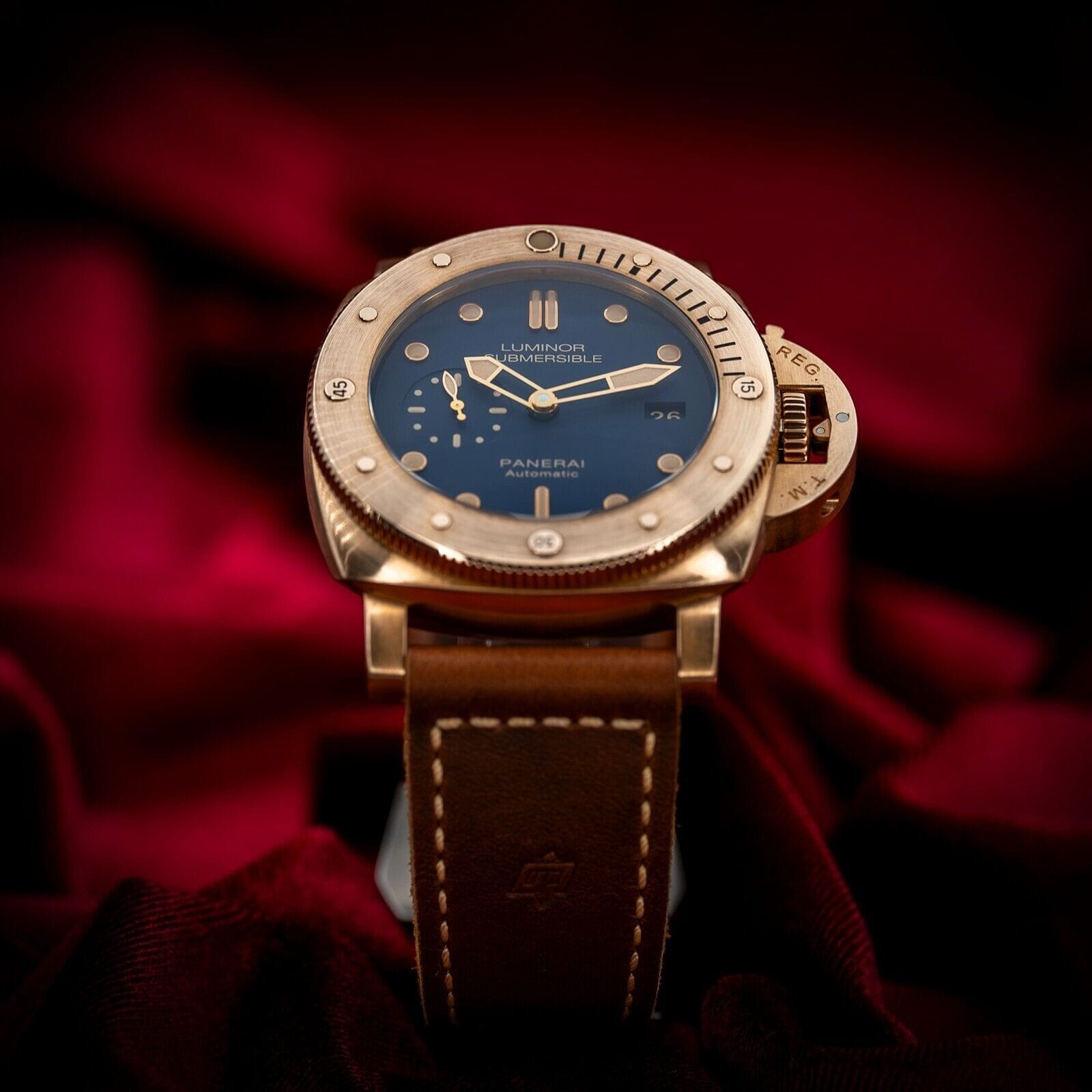 The rich golden hues of this bronze Panerai contrast beautifully with the deep blue dial, reminiscent of a golden sunset on the sea. One of only 1000 units ever produced, this limited edition is one for the true Paneristi.