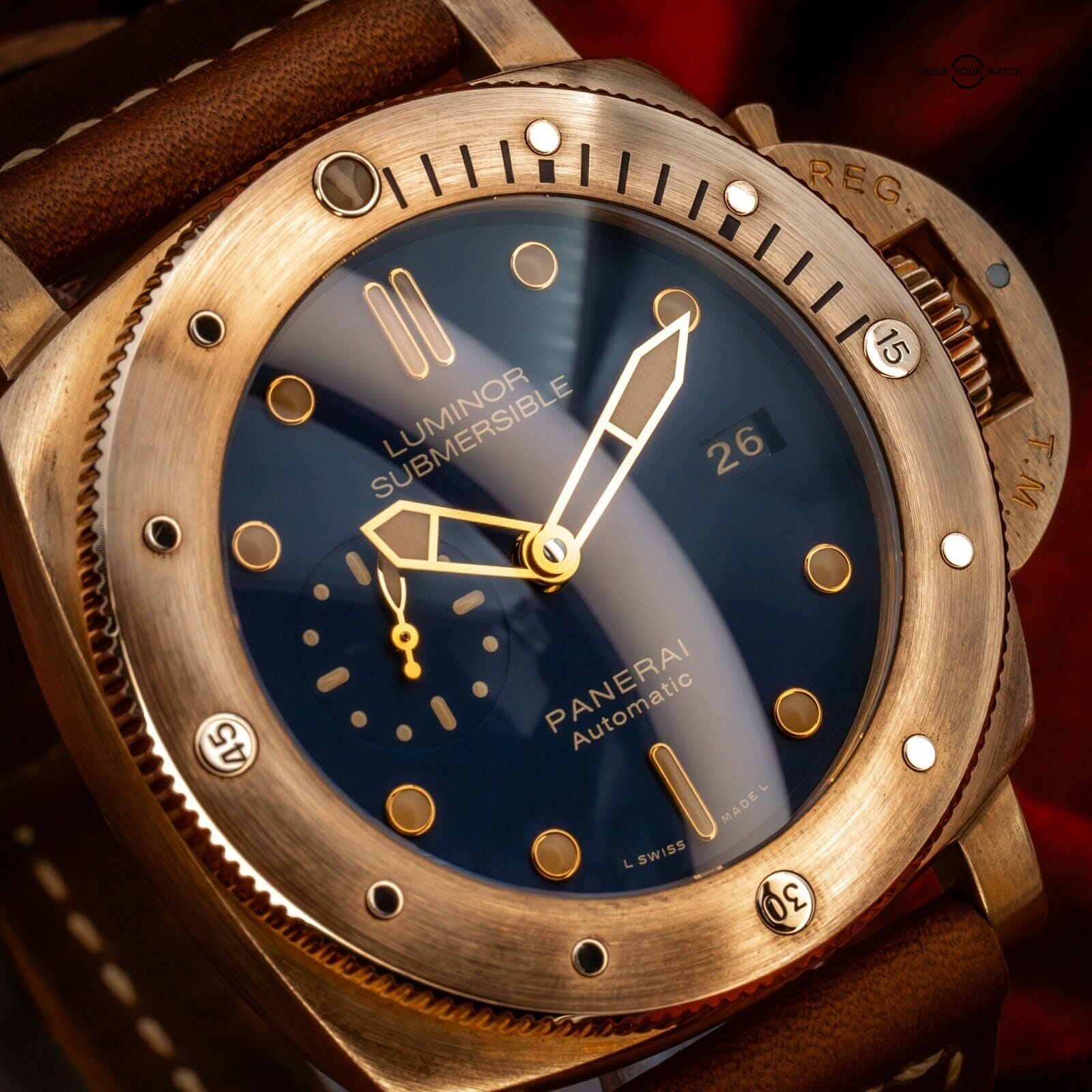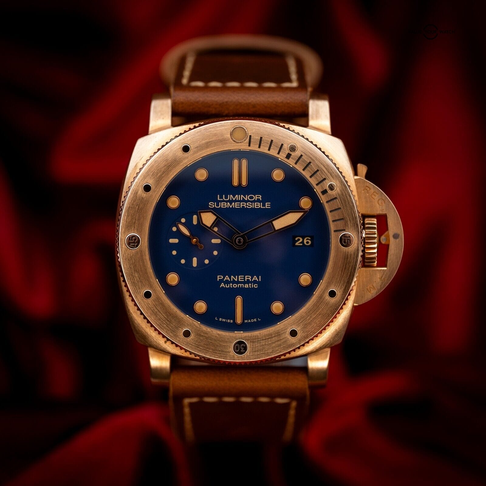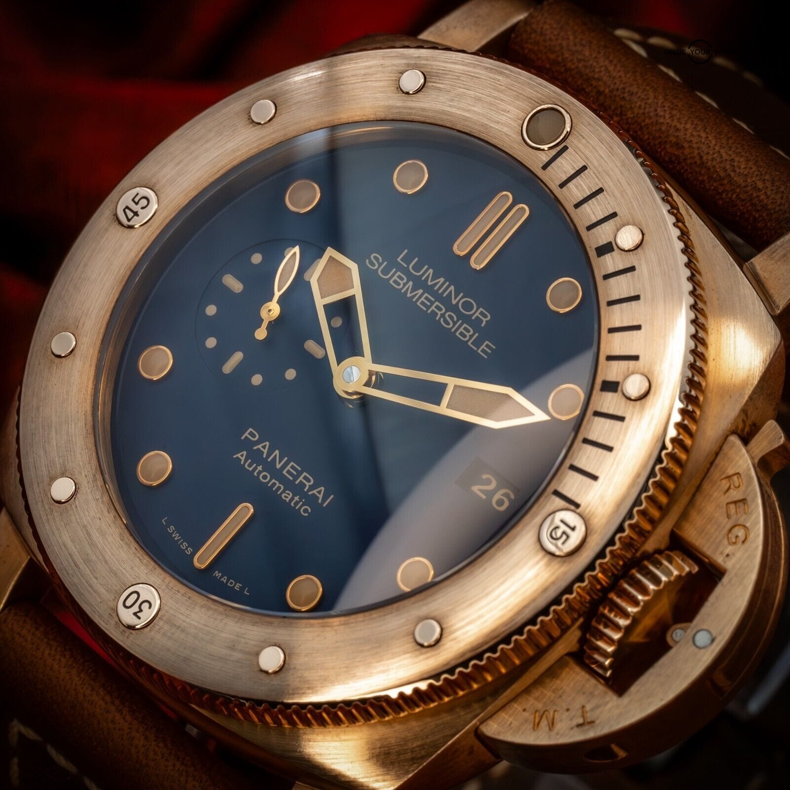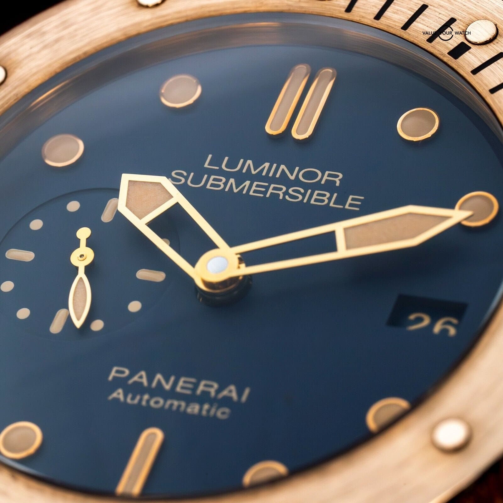 The rich golden hues of this bronze Panerai contrast beautifully with the deep blue dial, reminiscent of a golden sunset on the sea. One of only 1000 units ever produced, this limited edition is one for the true Paneristi.