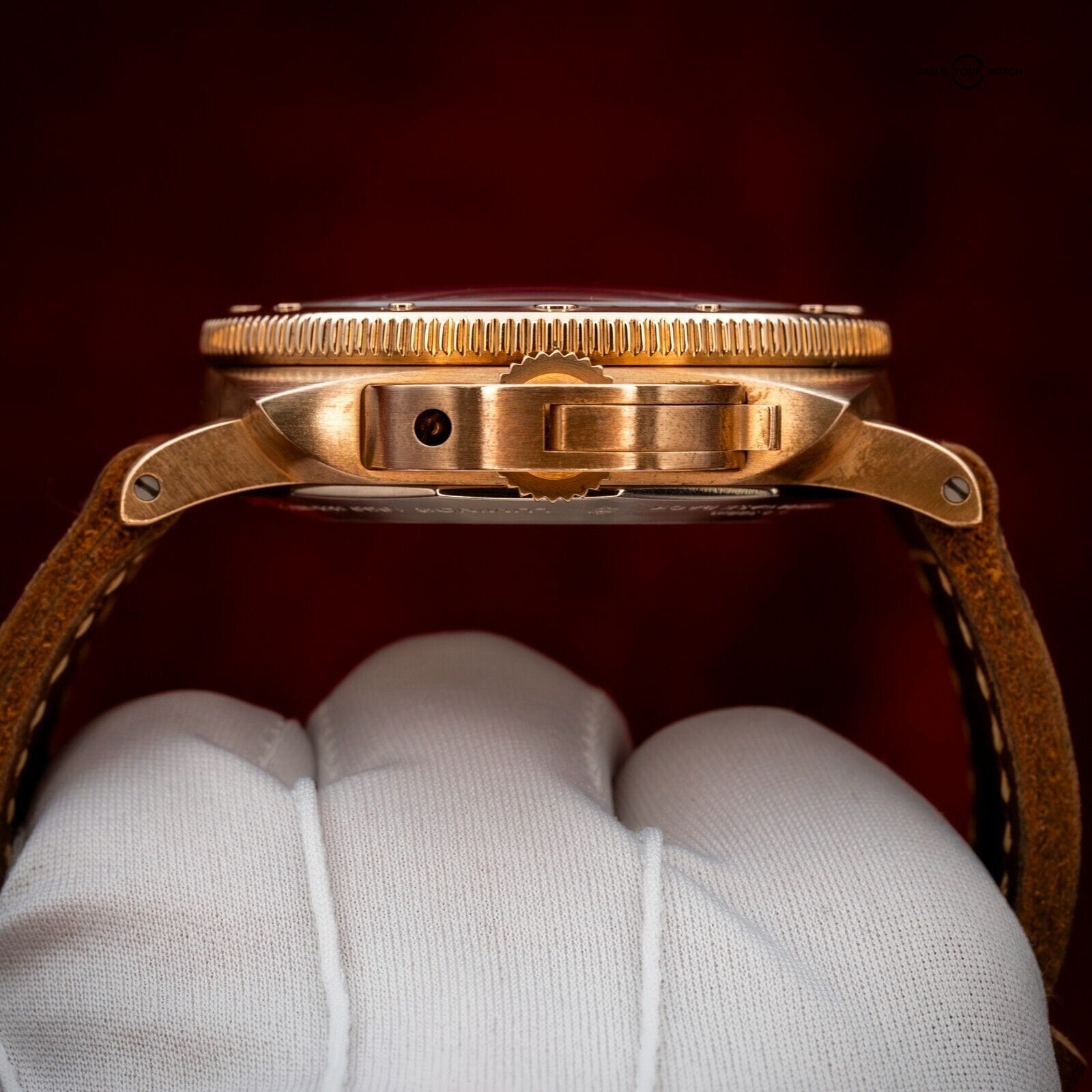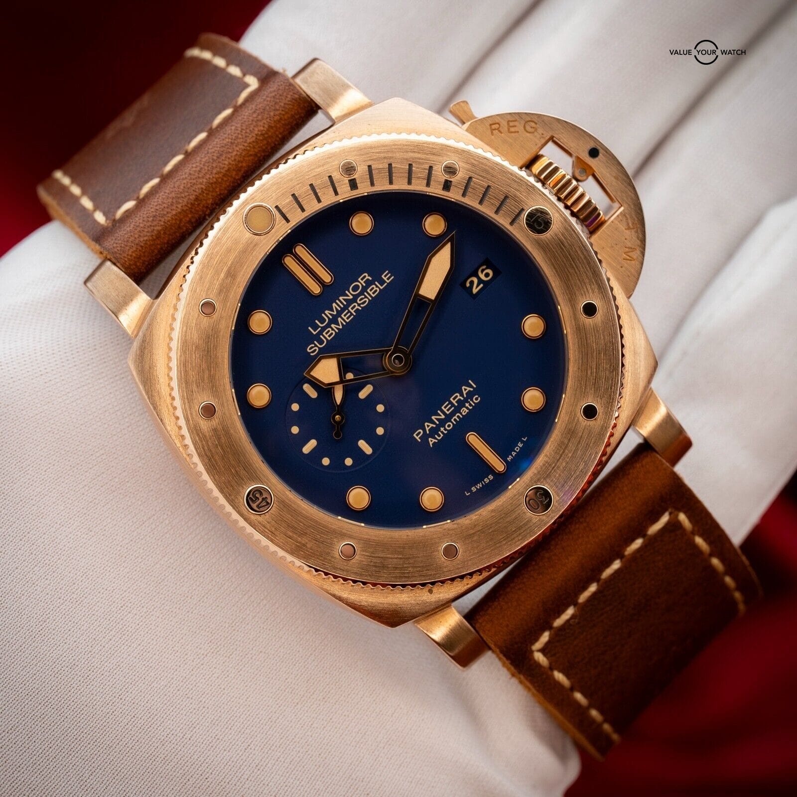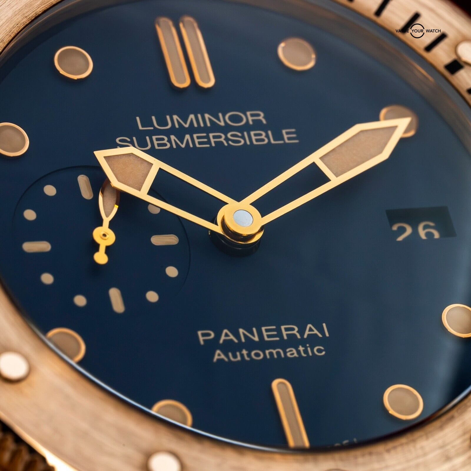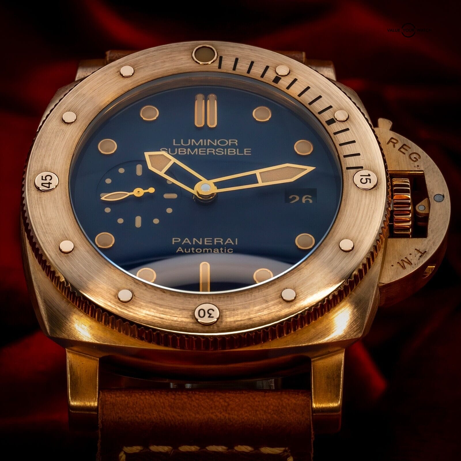 The rich golden hues of this bronze Panerai contrast beautifully with the deep blue dial, reminiscent of a golden sunset on the sea. One of only 1000 units ever produced, this limited edition is one for the true Paneristi.