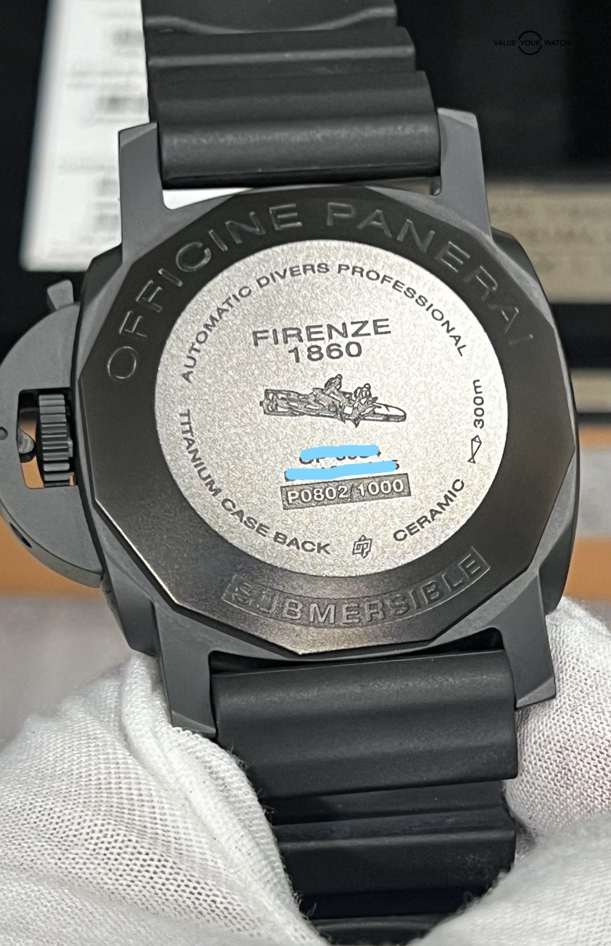 – Special comments: This Panerai Luminor Submersible 1950 3-Days Limited Edition is encased in black ceramic case surrounding a black dial on a black rubber strap with a black ceramic tang buckle. Note that this was the first model that Panerai came with for a black ceramic submersible. In addition, this is a special edition model 802/1000. The case back cover is made of titanium. This watch was made to last forever, the sapphire crystal and the ceramic case make this watch almost scratch free.