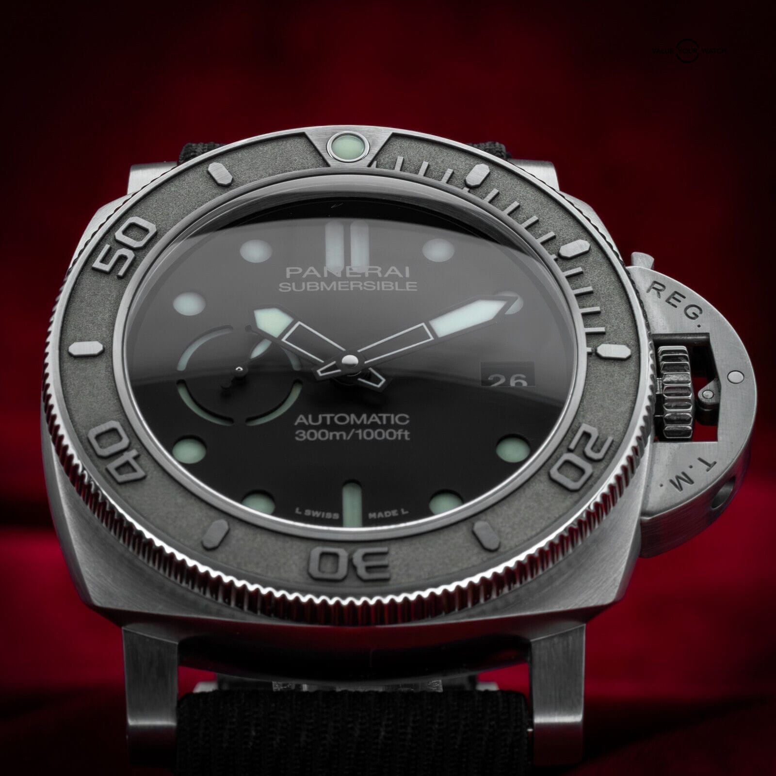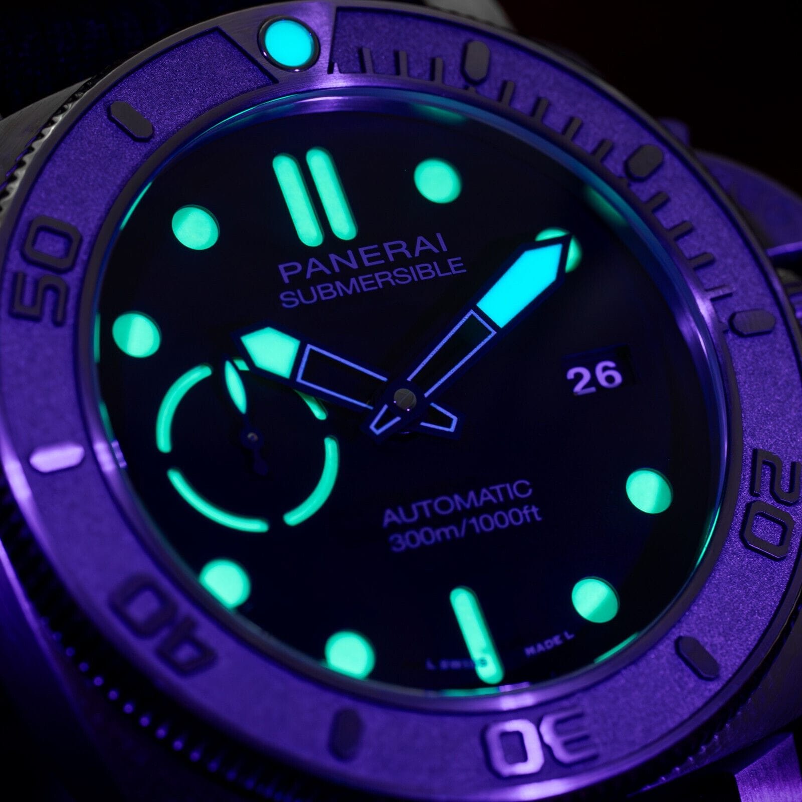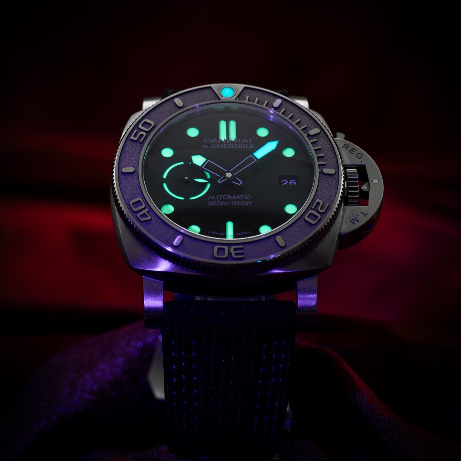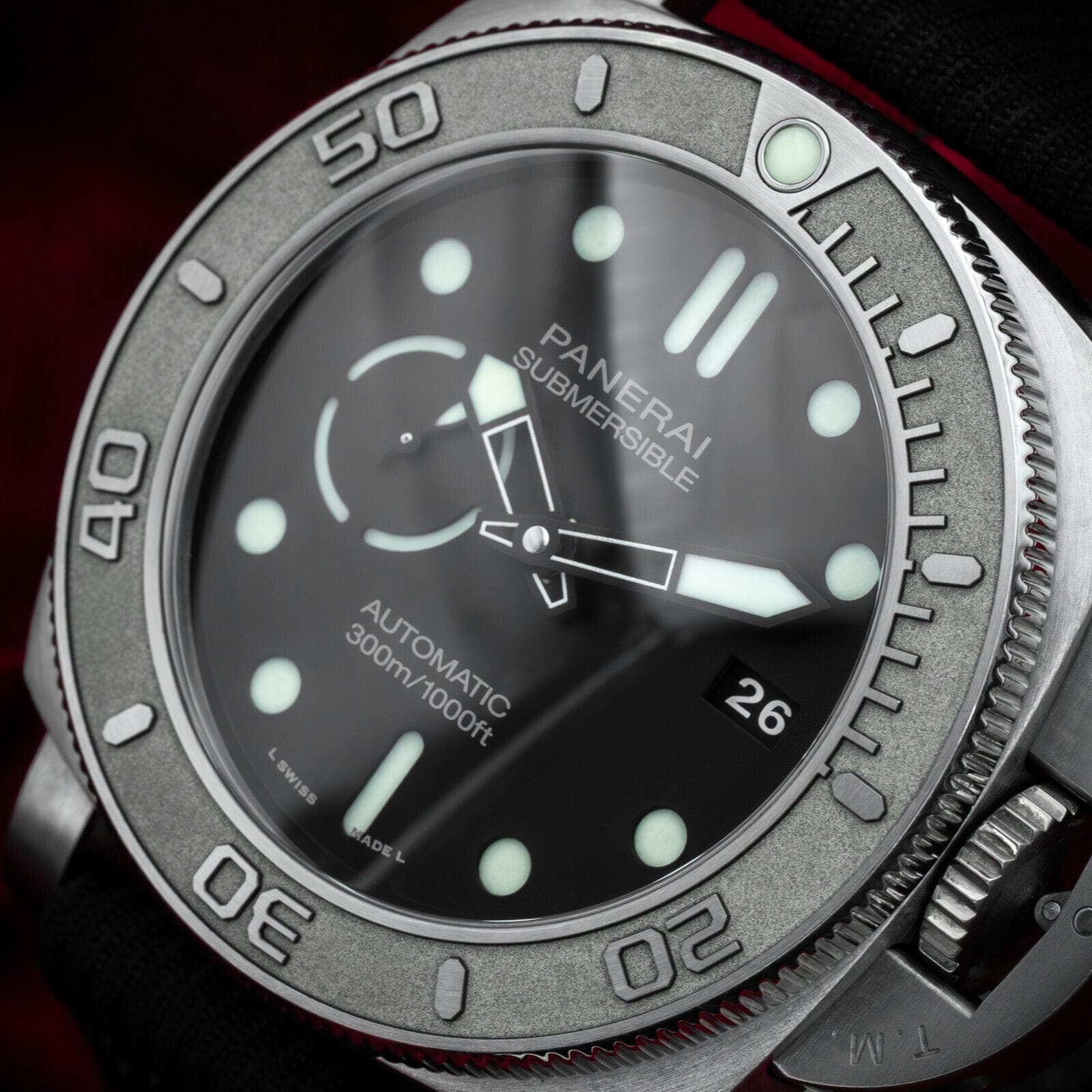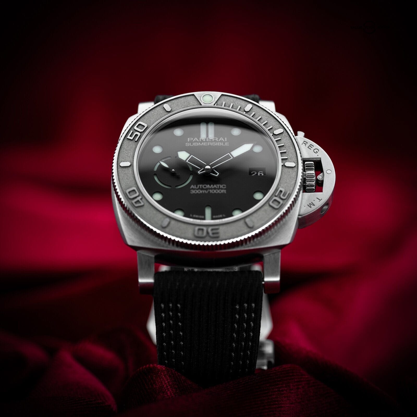 Crafted from Panerai’s Eco-Titanium, this bold iteration of the beloved Submersible is both durable and lightweight on the wrist. With the text printed on the underside of the sapphire crystal, this dial has a depth to it that makes it stand out from the crowd.