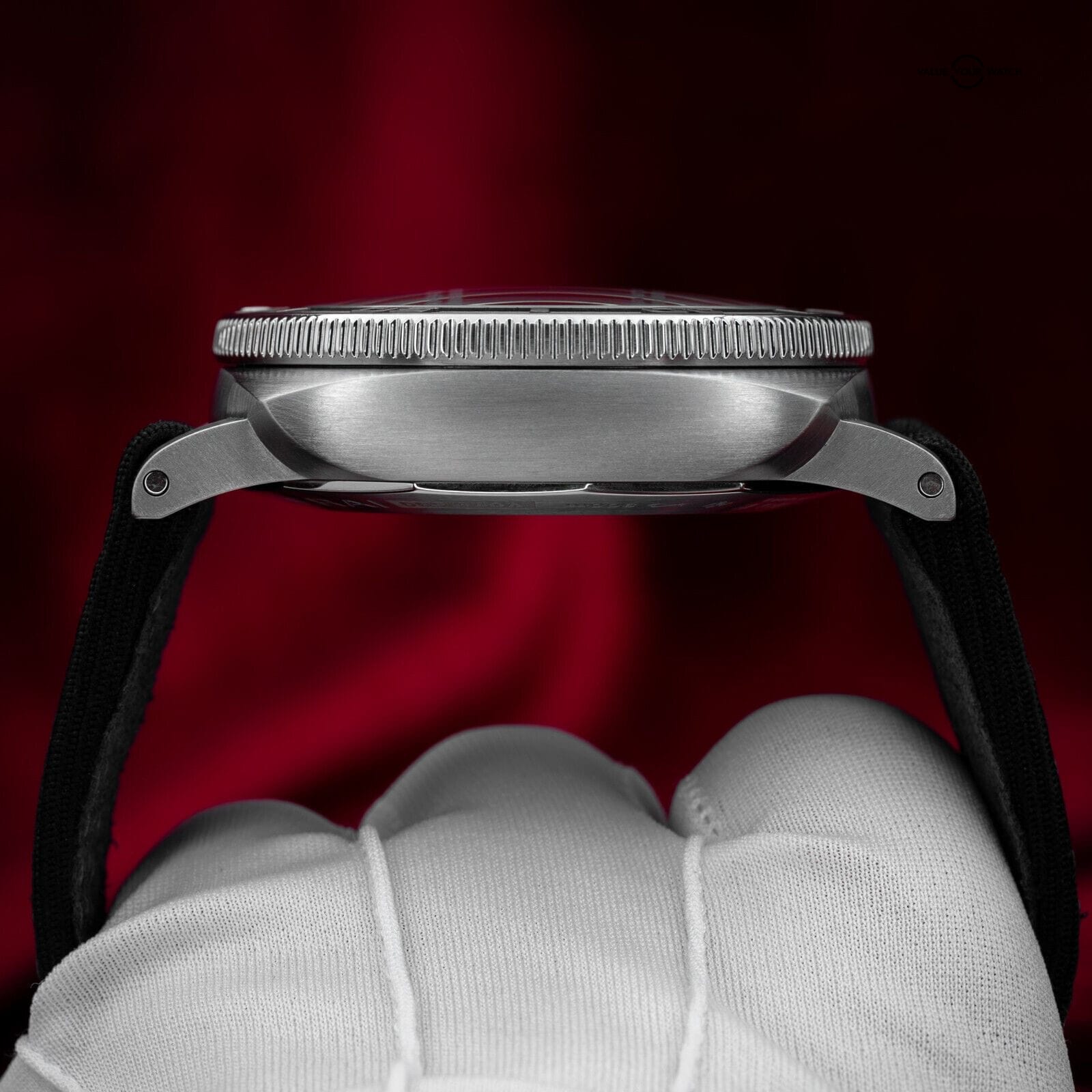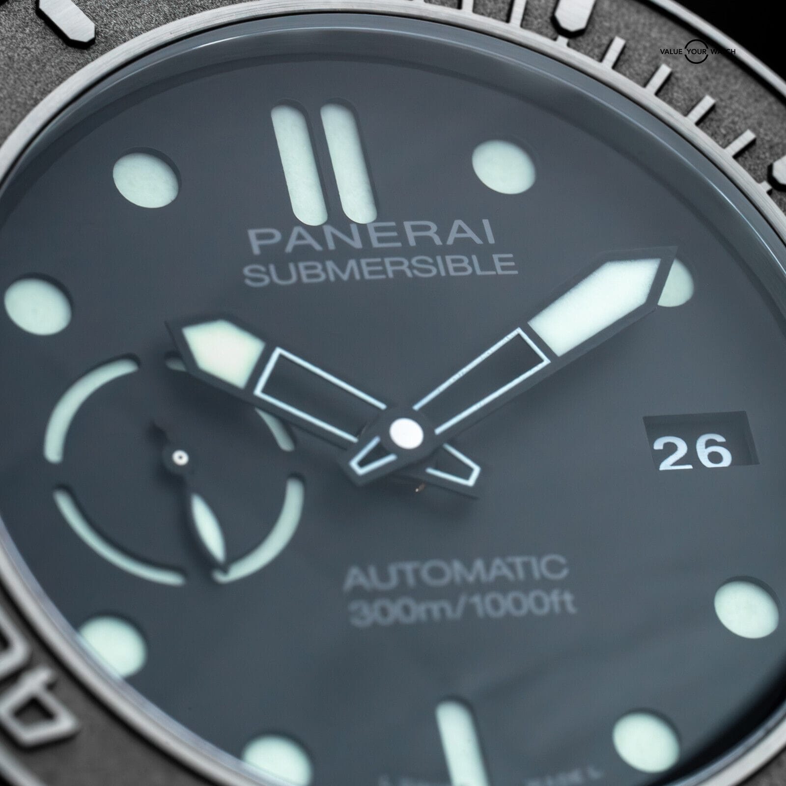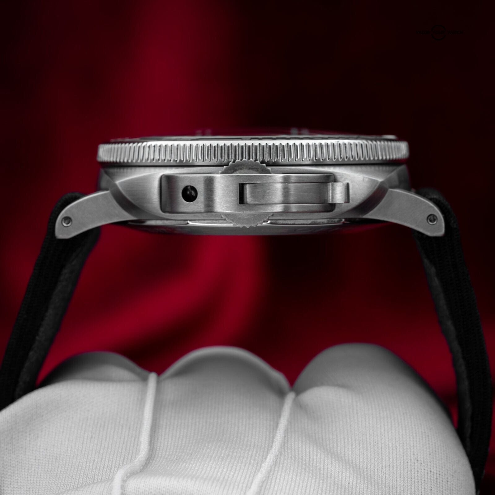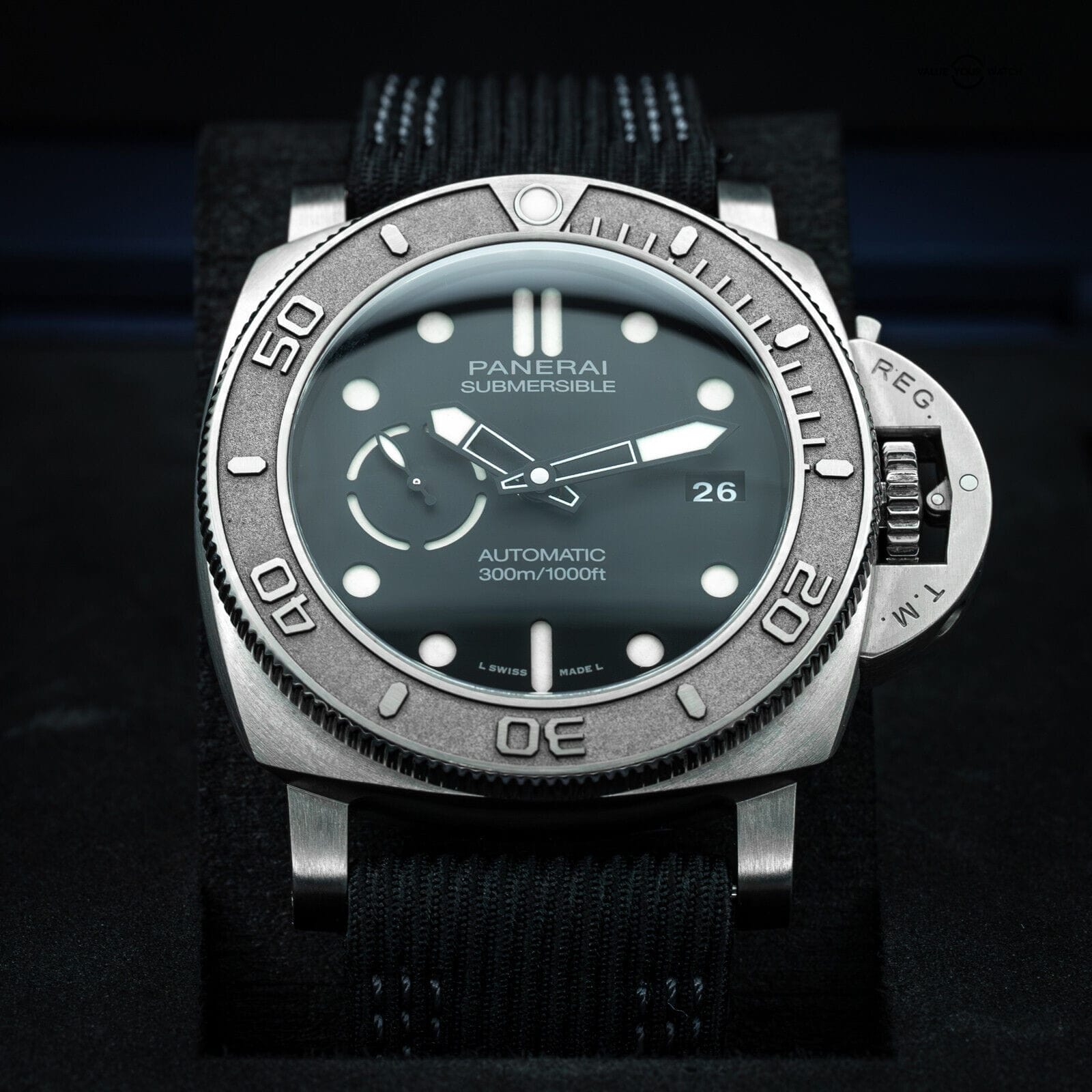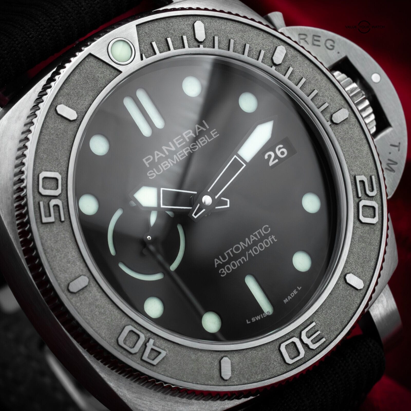 Crafted from Panerai’s Eco-Titanium, this bold iteration of the beloved Submersible is both durable and lightweight on the wrist. With the text printed on the underside of the sapphire crystal, this dial has a depth to it that makes it stand out from the crowd.