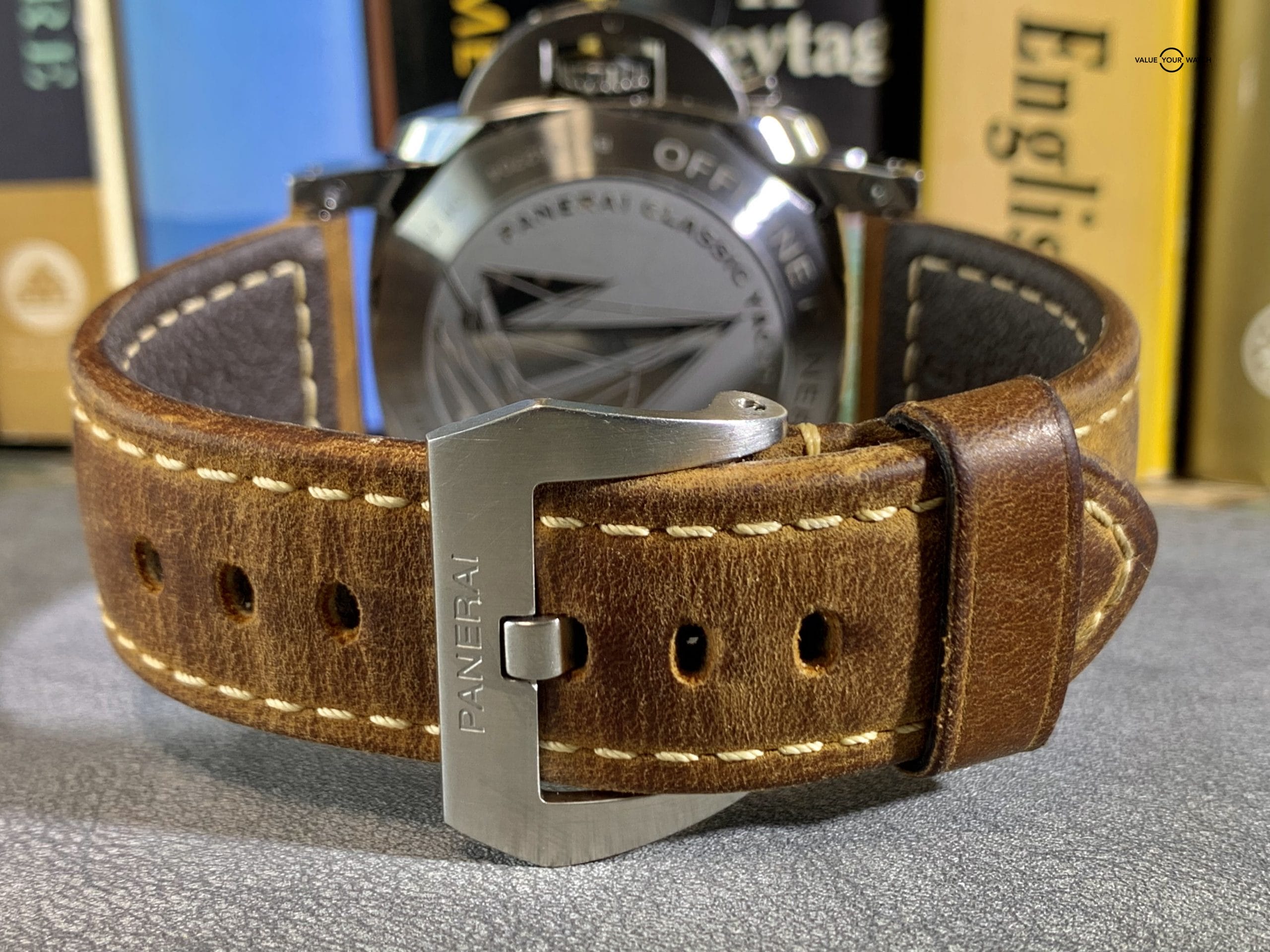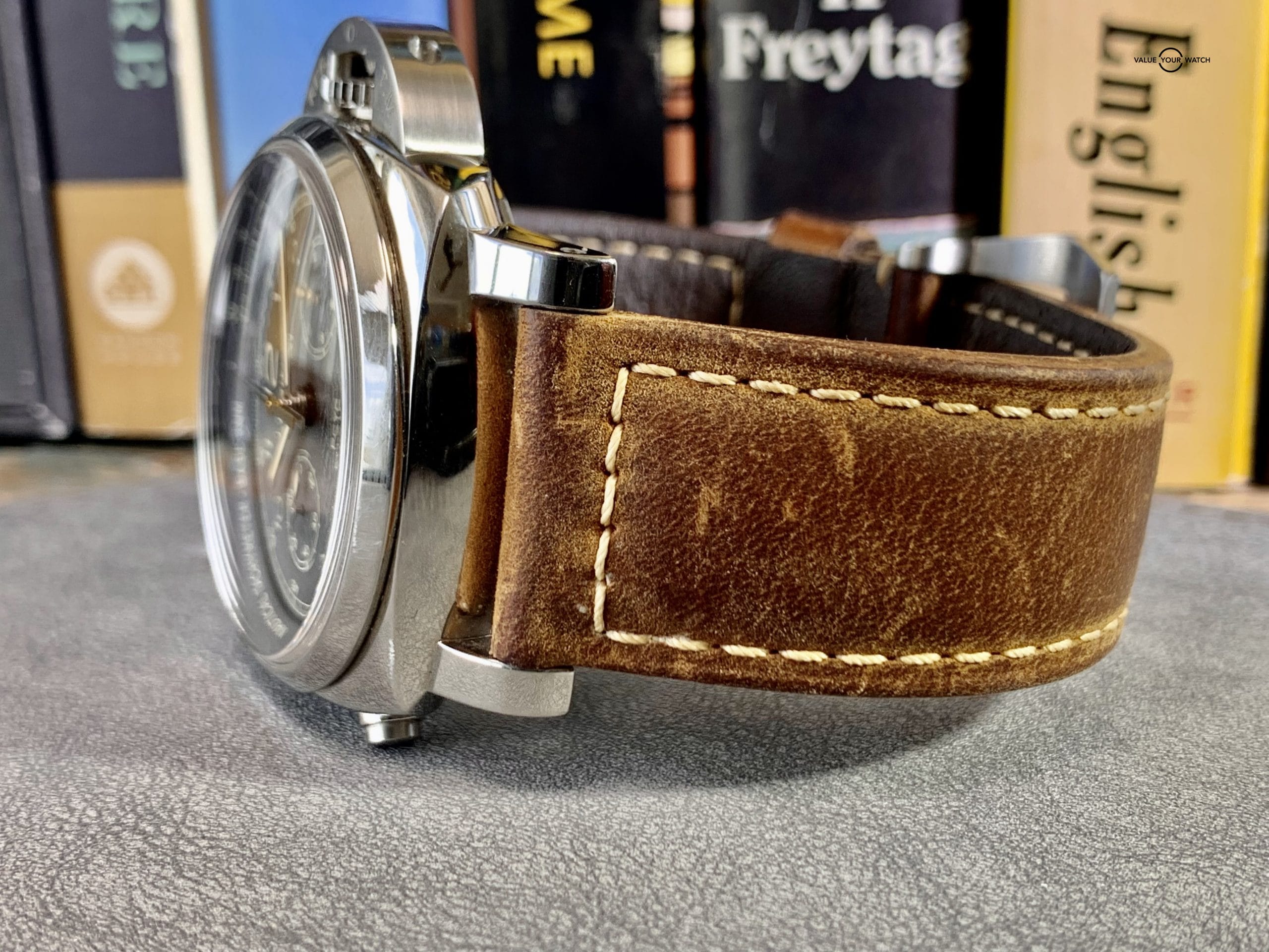This Panerai is in very good condition and shows normal signs of wear. It includes the original triple Panerai presentation boxes, all paperwork and booklets, case protector, strap changing tools, Panerai cleaning cloth and two extra leather straps.