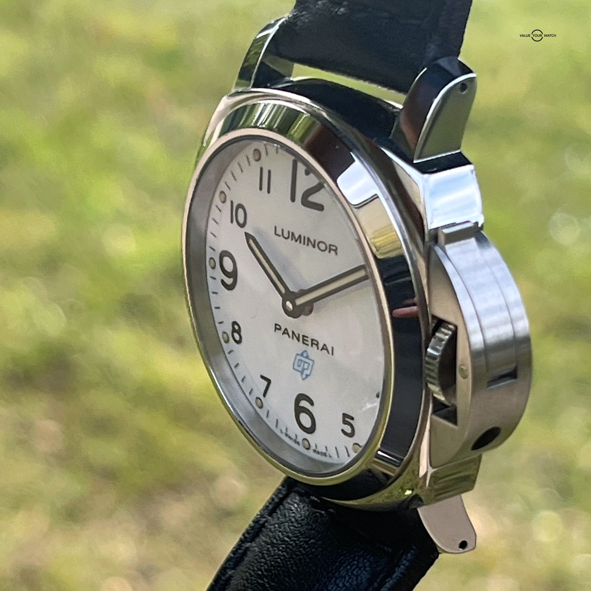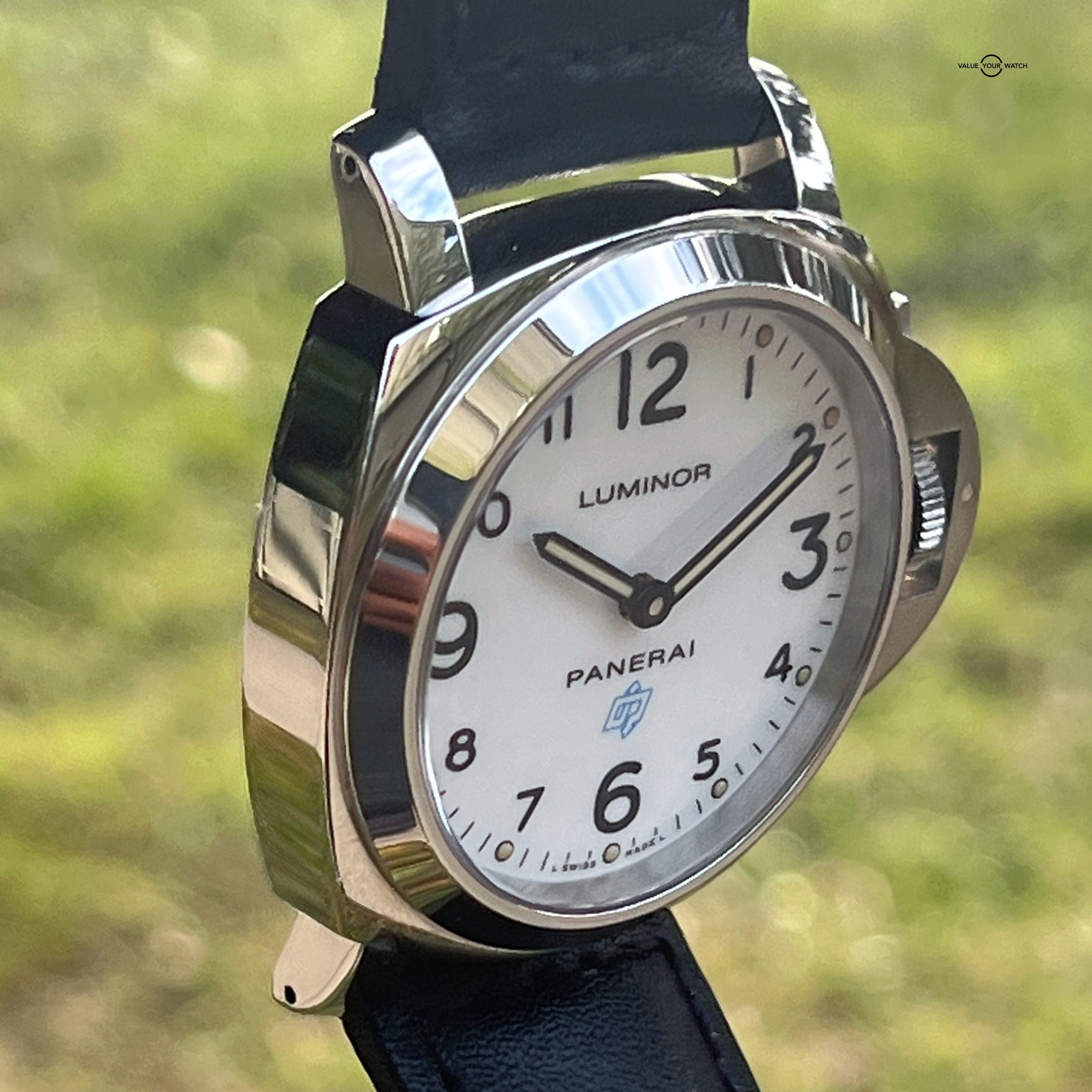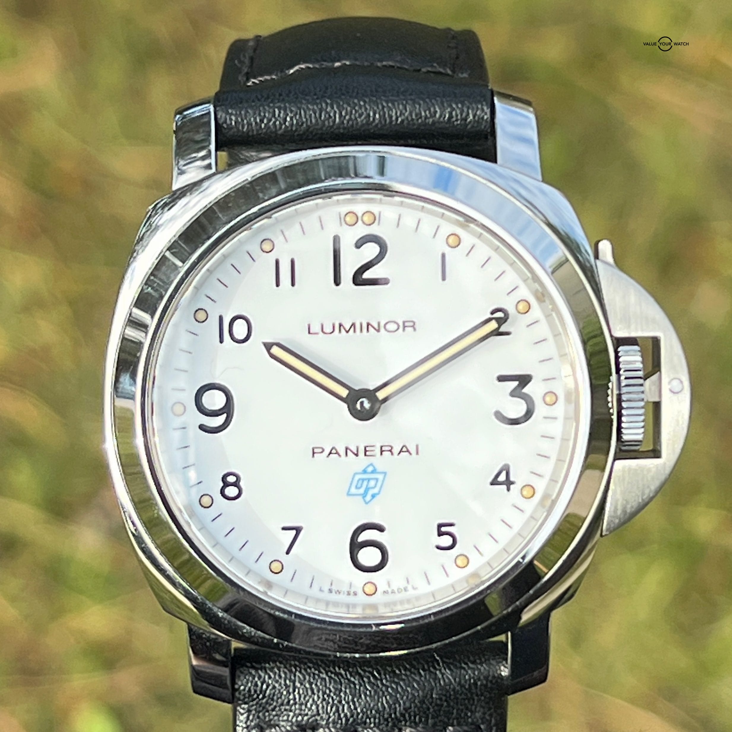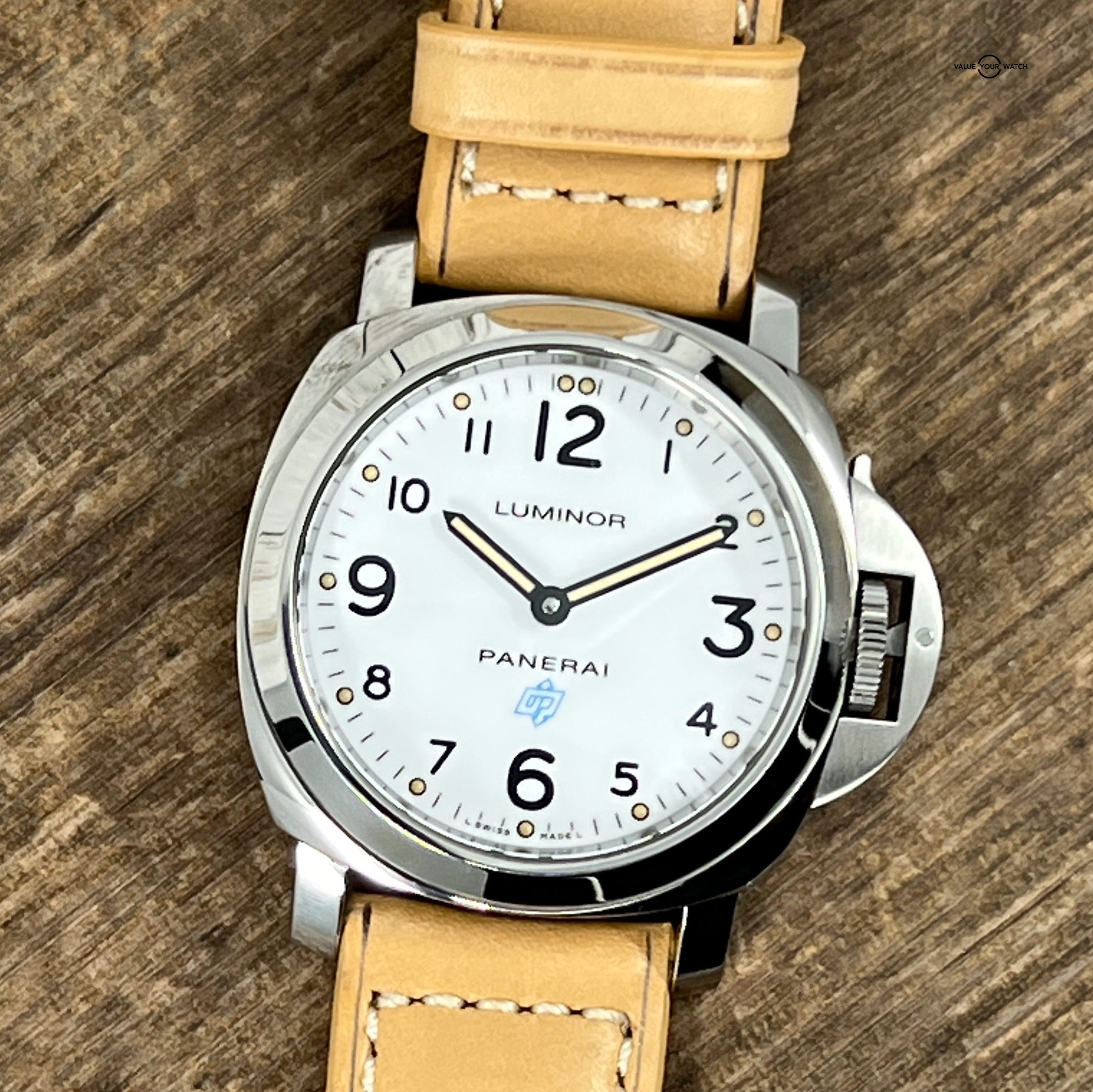 The Panerai Luminor Base Logo Acciaio presents a brushed stainless steel case and 44 mm polished bezel encapsulating the OP1 manual wind movement, which offers a 56 hour power reserve. This watch can be distinguished from the Luminor Base models (PAM 114, PAM 561) by the blue OP logo at the 6 o’clock position. Manufactured in 2016, it is also very visually similar to the newer PAM 775, but the 630 offers an ETA-based movement as opposed to the P.9001 in-house movement.