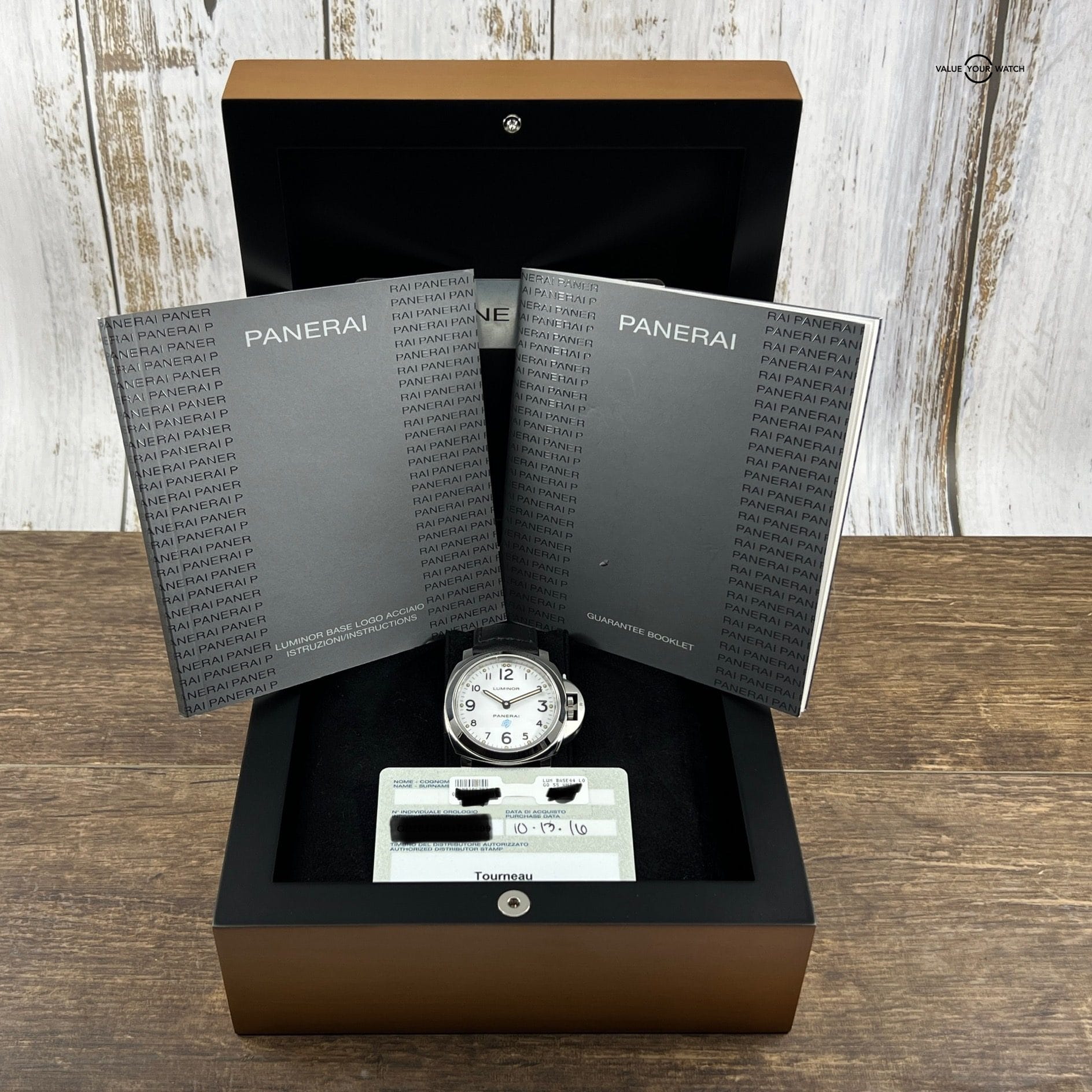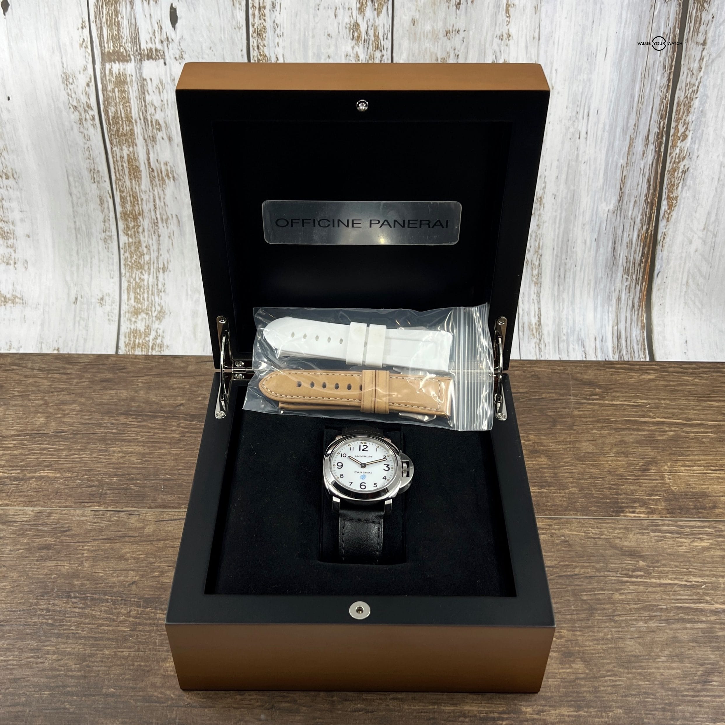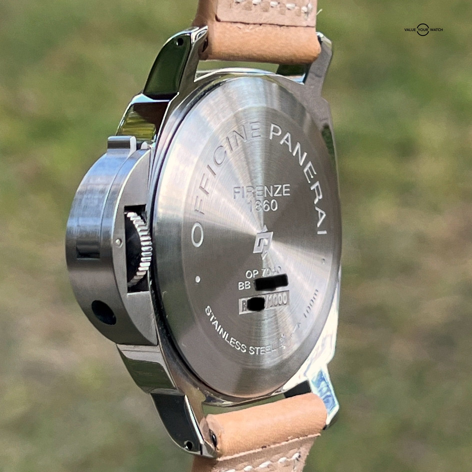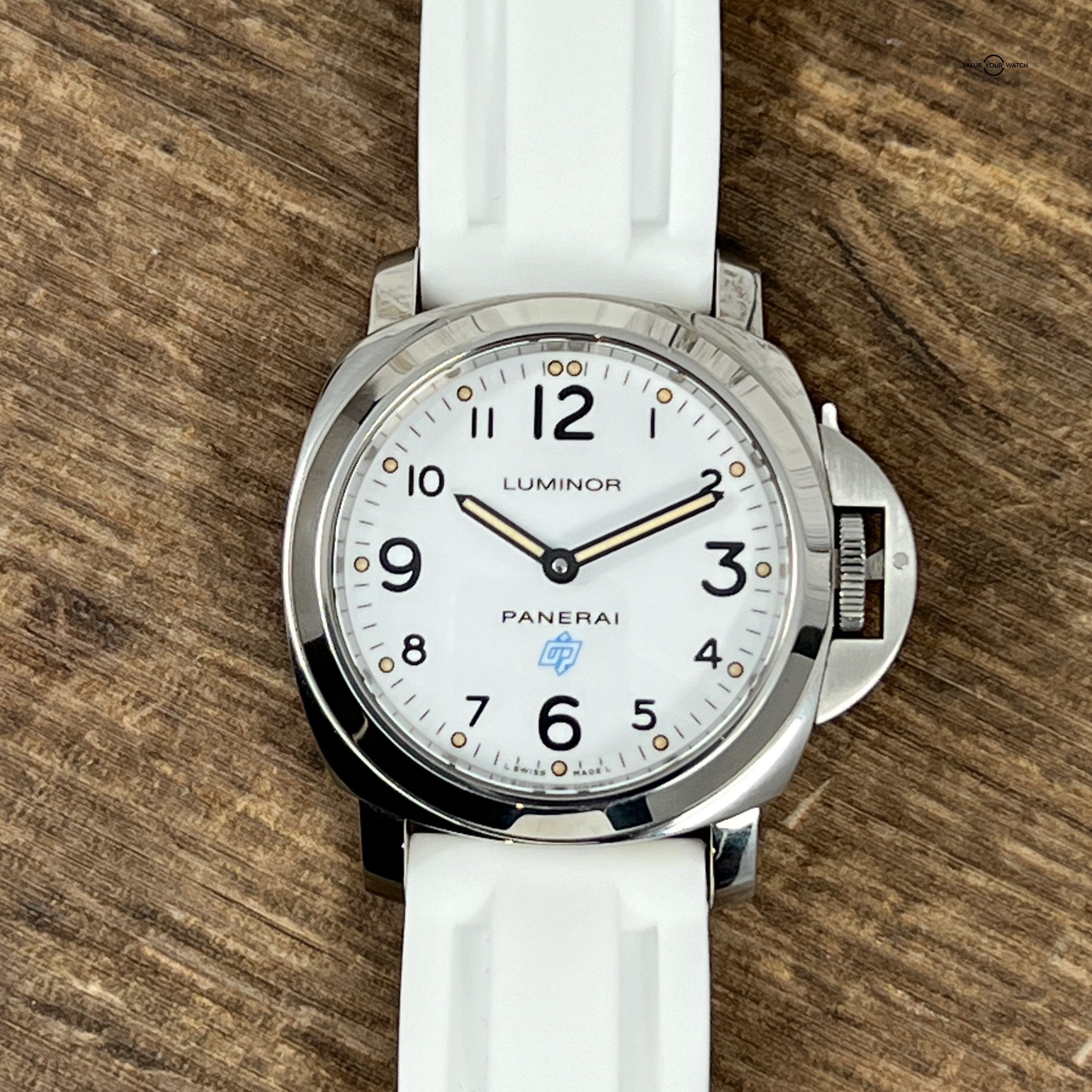 The Panerai Luminor Base Logo Acciaio presents a brushed stainless steel case and 44 mm polished bezel encapsulating the OP1 manual wind movement, which offers a 56 hour power reserve. This watch can be distinguished from the Luminor Base models (PAM 114, PAM 561) by the blue OP logo at the 6 o’clock position. Manufactured in 2016, it is also very visually similar to the newer PAM 775, but the 630 offers an ETA-based movement as opposed to the P.9001 in-house movement.