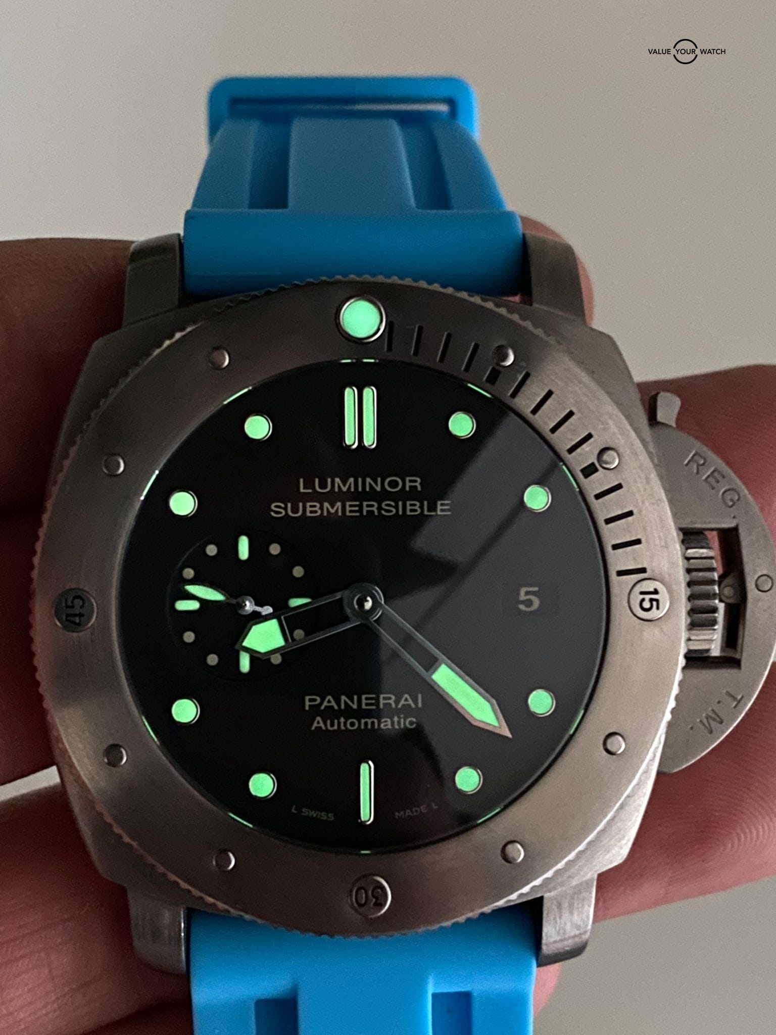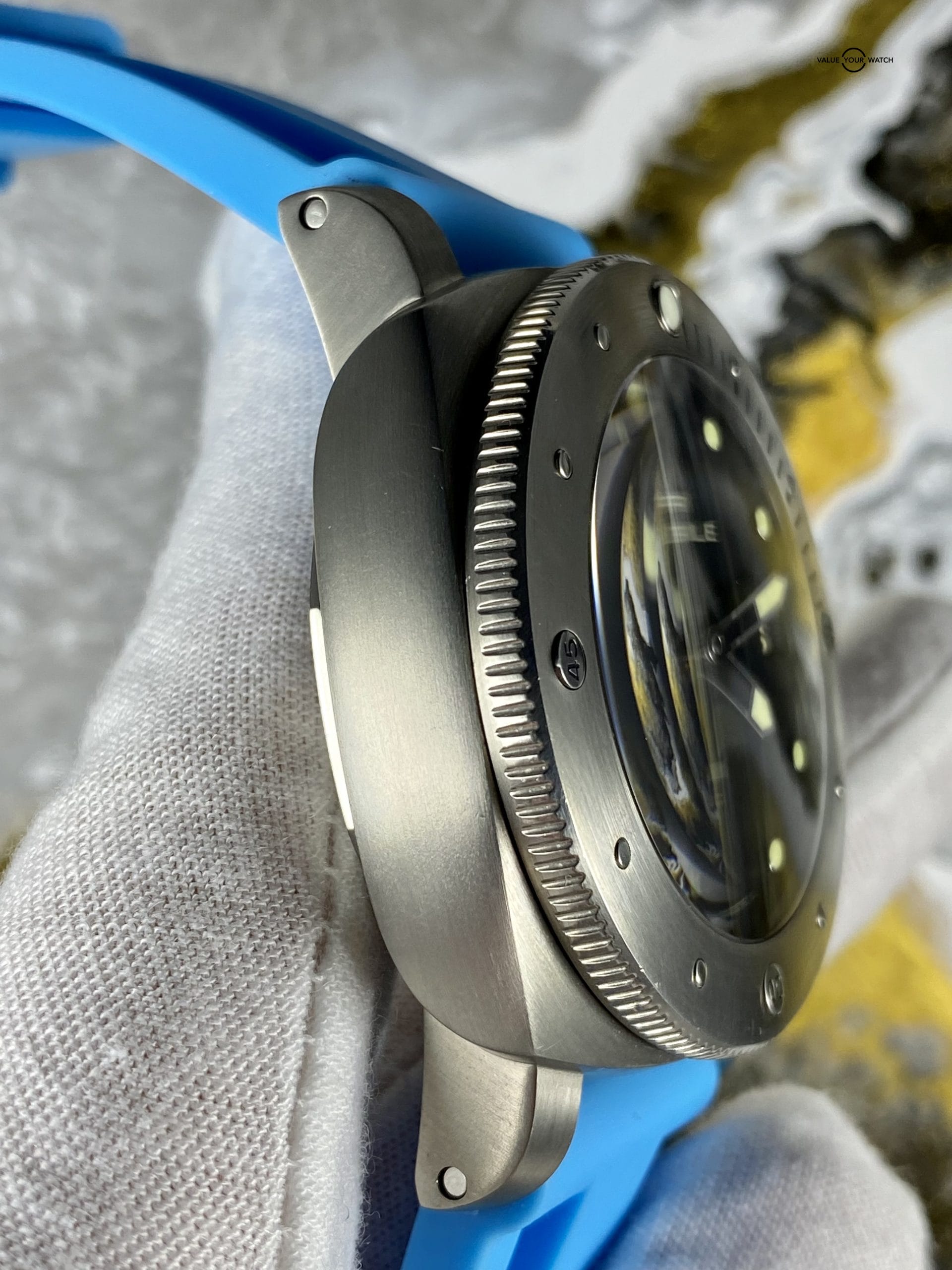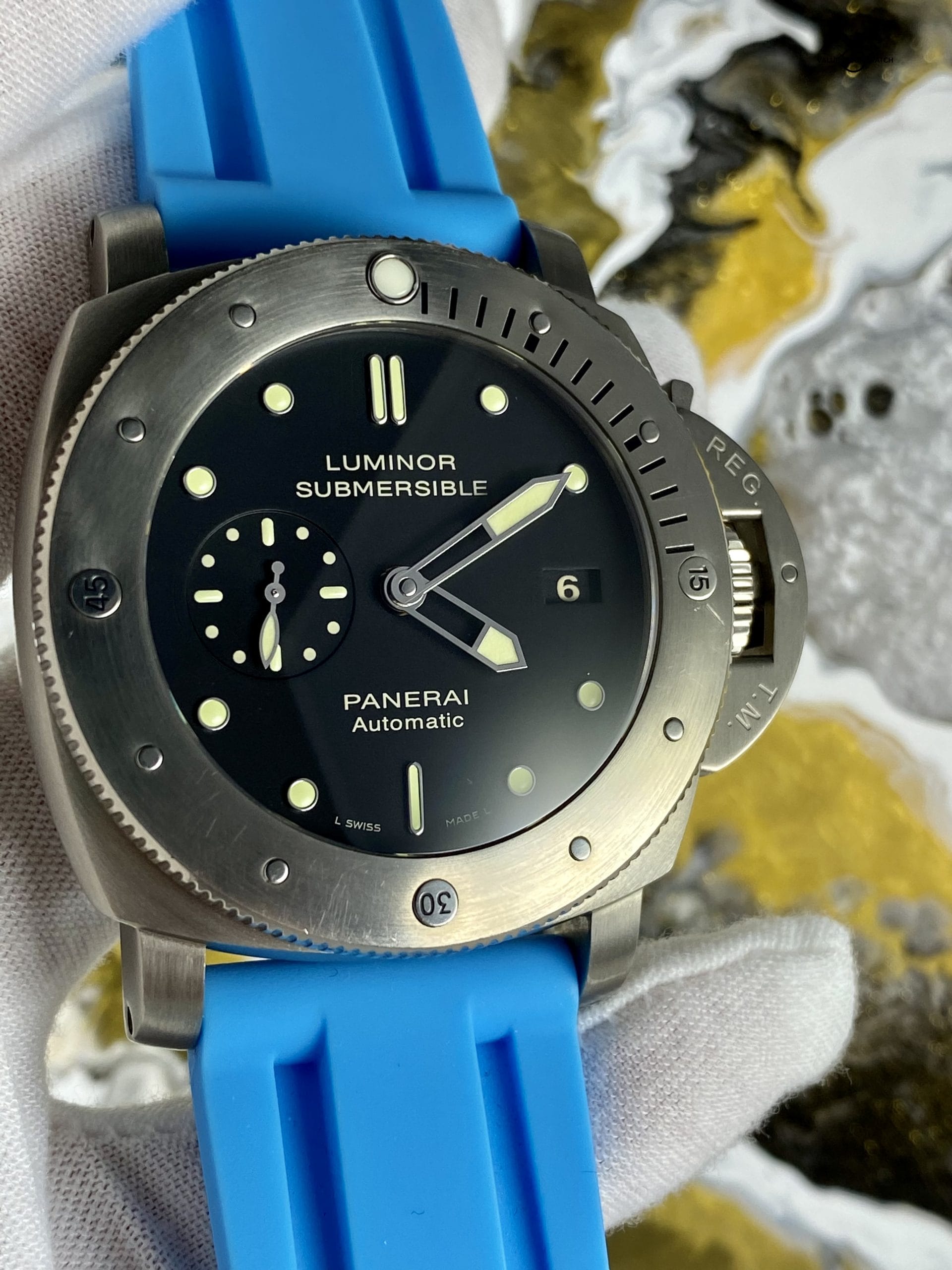 If you’re looking for a diving watch, Panerai has you covered! This titanium Luminor Submersible wears light for a 47mm watch, and distinctively shows your love for water sports with the signature Submersible style and Miami blue strap to finish the look! Panerai limited this model to 1000 pcs, this is #193/1000. Summer is coming and this watch is burning to be splashed!