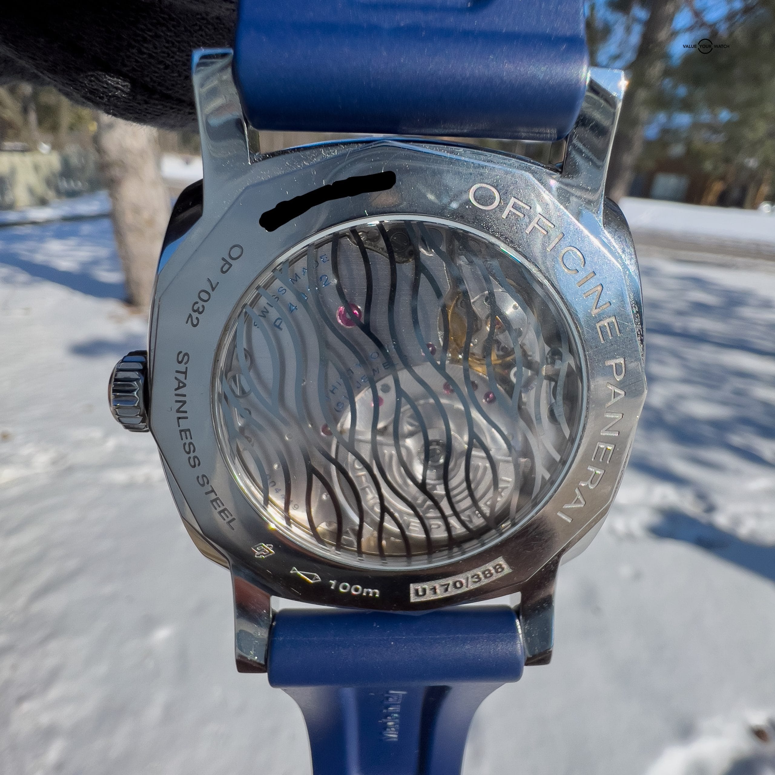 The Radiomir line has preserved its design DNA since the first release (ref. 3646); from the cushion-shaped 45 mm stainless steel case to the luminated dial markers with numbers at the 6, 9, and 12 o’clock position (date indicators are usually positioned at the 3 o’clock position). Behind the beautiful deep sunburst blue gradient stencil dial lies a solid disc of ecru-colored Super-Luminova to give the vintage lume look.